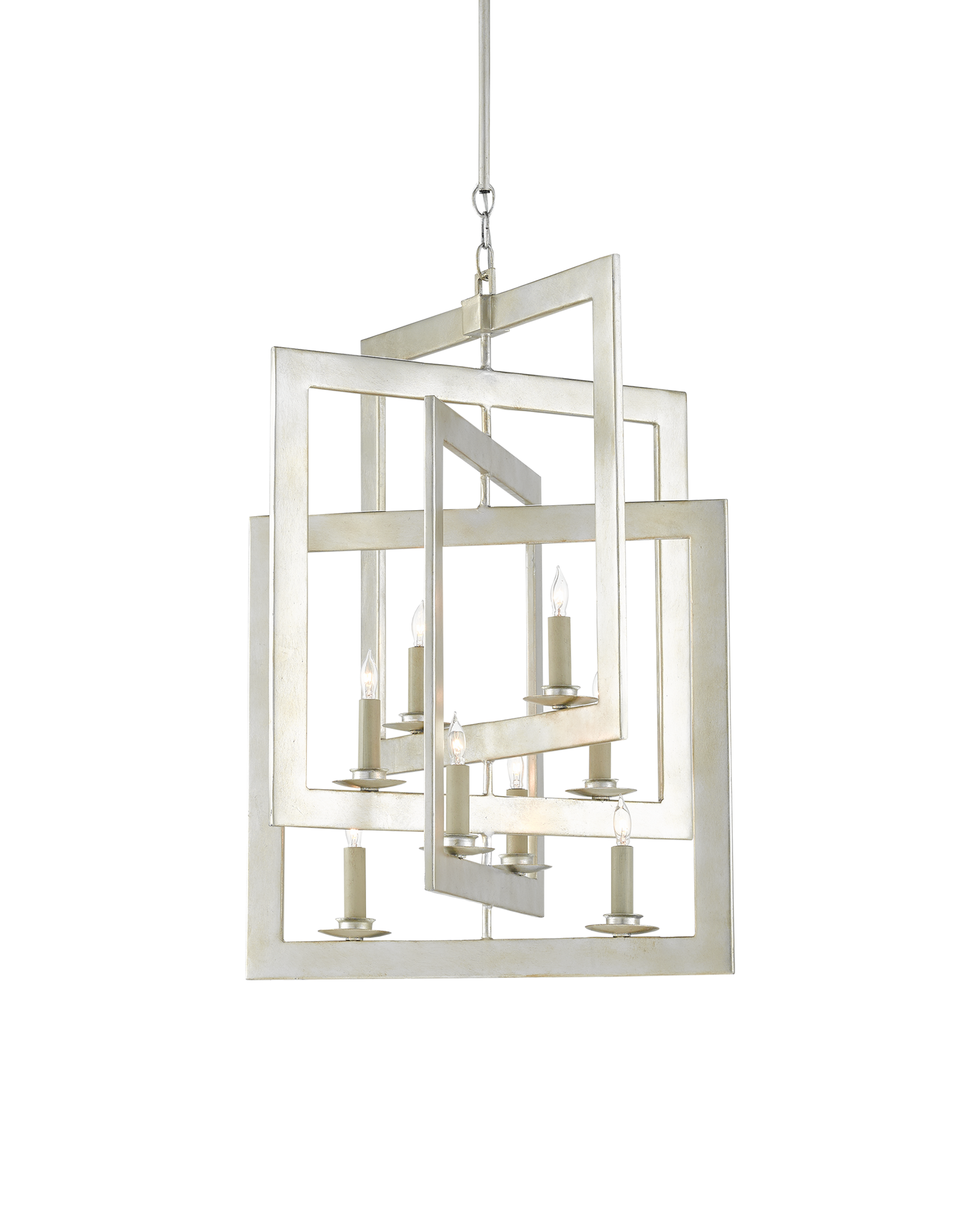 The Middleton Silver Small Chandelier has interlocking squares created by wrought-iron bands that are smartly designed. The frame of this silver chandelier perfects the illusion of diminishing perspective, its contemporary silver leaf finish making it gleam. Adjustable from 35" to 113" with use of included chain/rod kit/cable. If your space calls for a longer drop, additional chain/rods/cable is available for purchase.