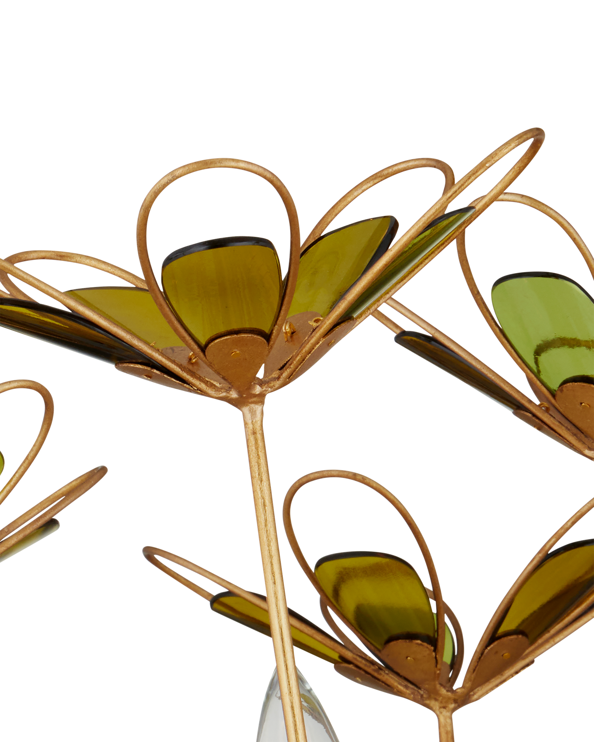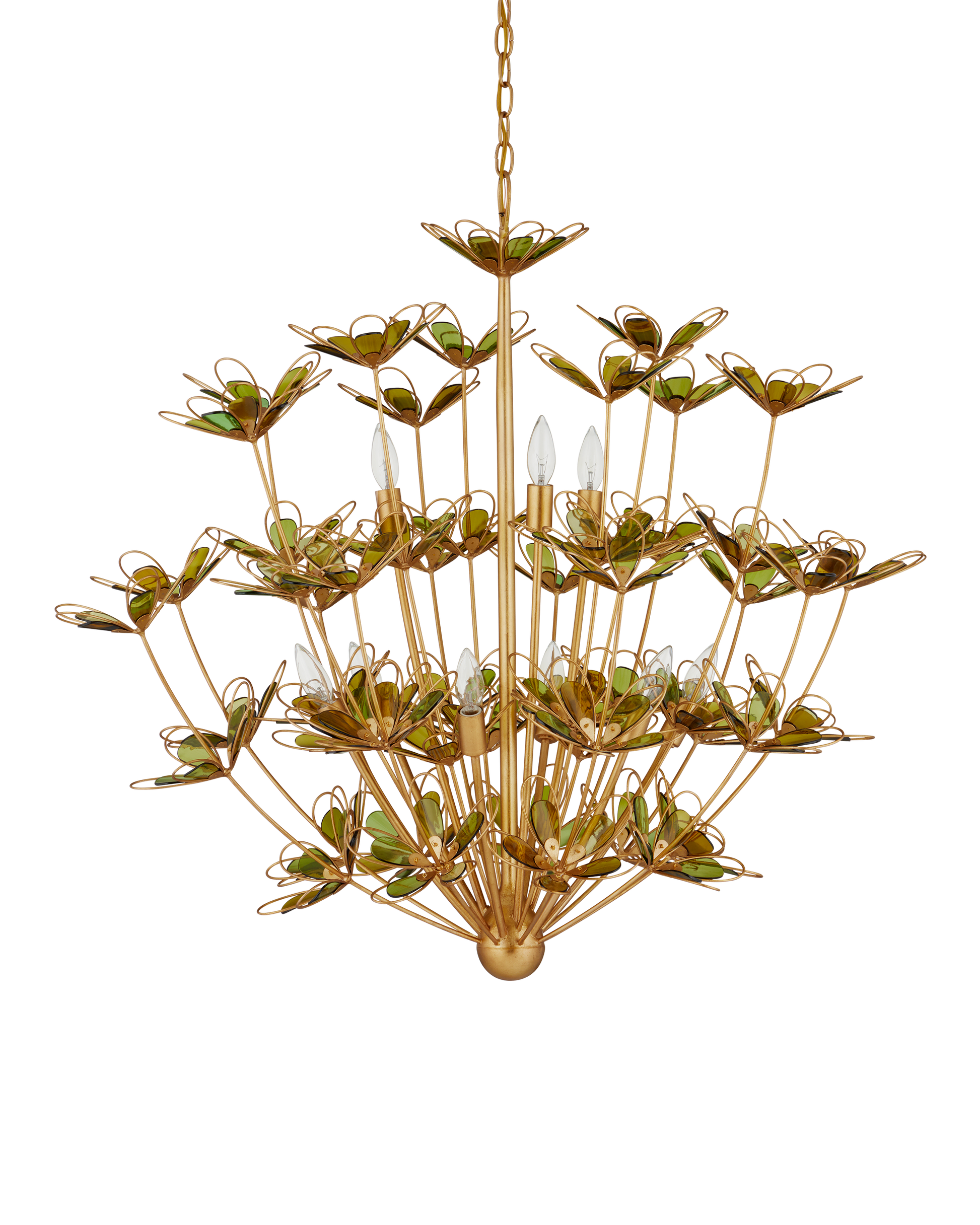The Midsummer Chandelier is an artful adaptation of nature's beauty. The frame of the graceful gold chandelier is covered in a contemporary gold leaf finish that enlivens the green recycled glass petals on the blossoms. The oblong pieces of glass are surrounded by wire that is bent to mimic their shapes, also in a contemporary gold finish. The overall effect the layering provides brings the floral motifs a fluttering feel. Adjustable from 42" to 110" with use of included chain/rod kit/cable. If your space calls for a longer drop, additional chain/rods/cable is available for purchase.