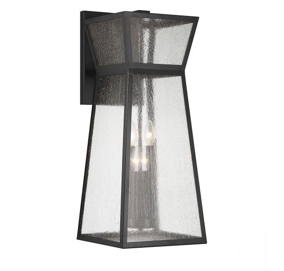 From Savoy House, the Millford 4-light outdoor wall light showcases a more contemporary take on classic lantern-style illumination with a sharply angular shape and panes of seedy glass. Matte black finish. Millford is 26.75" in height, 11" in width and extends 12.25" from the wall. It uses 4 candelabra size bulbs of up to 40 watts per bulb (bulbs not included).