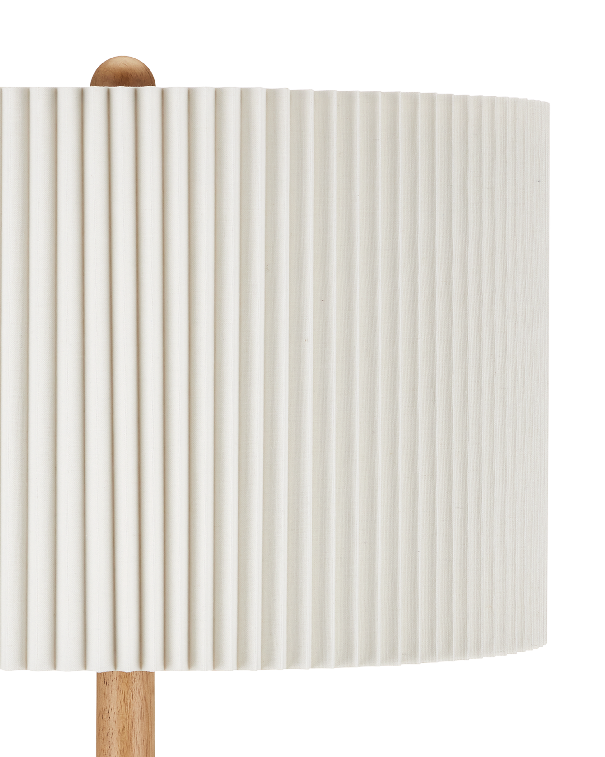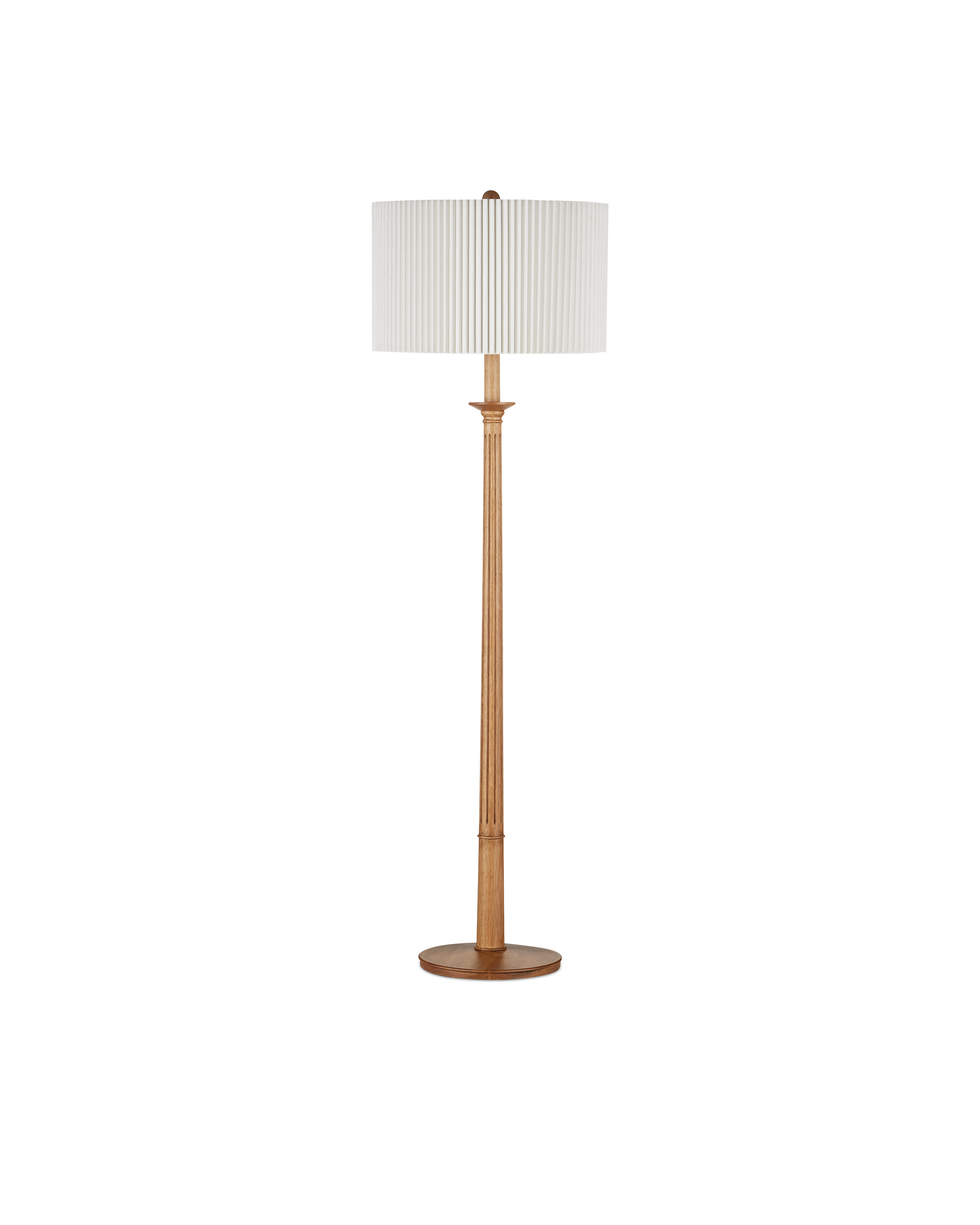 Made from turned wood, the Mitford Floor Lamp has a classic profile that was inspired by a traditional column design. Tom Caldwell envisioned the tan floor lamp with its refined Italian feel. By topping the thin floor lamp with a knife-pleated bone linen shade, he echoed the delineations in the wood lamp's body and made a wonderfully textural accent piece for an interior.
