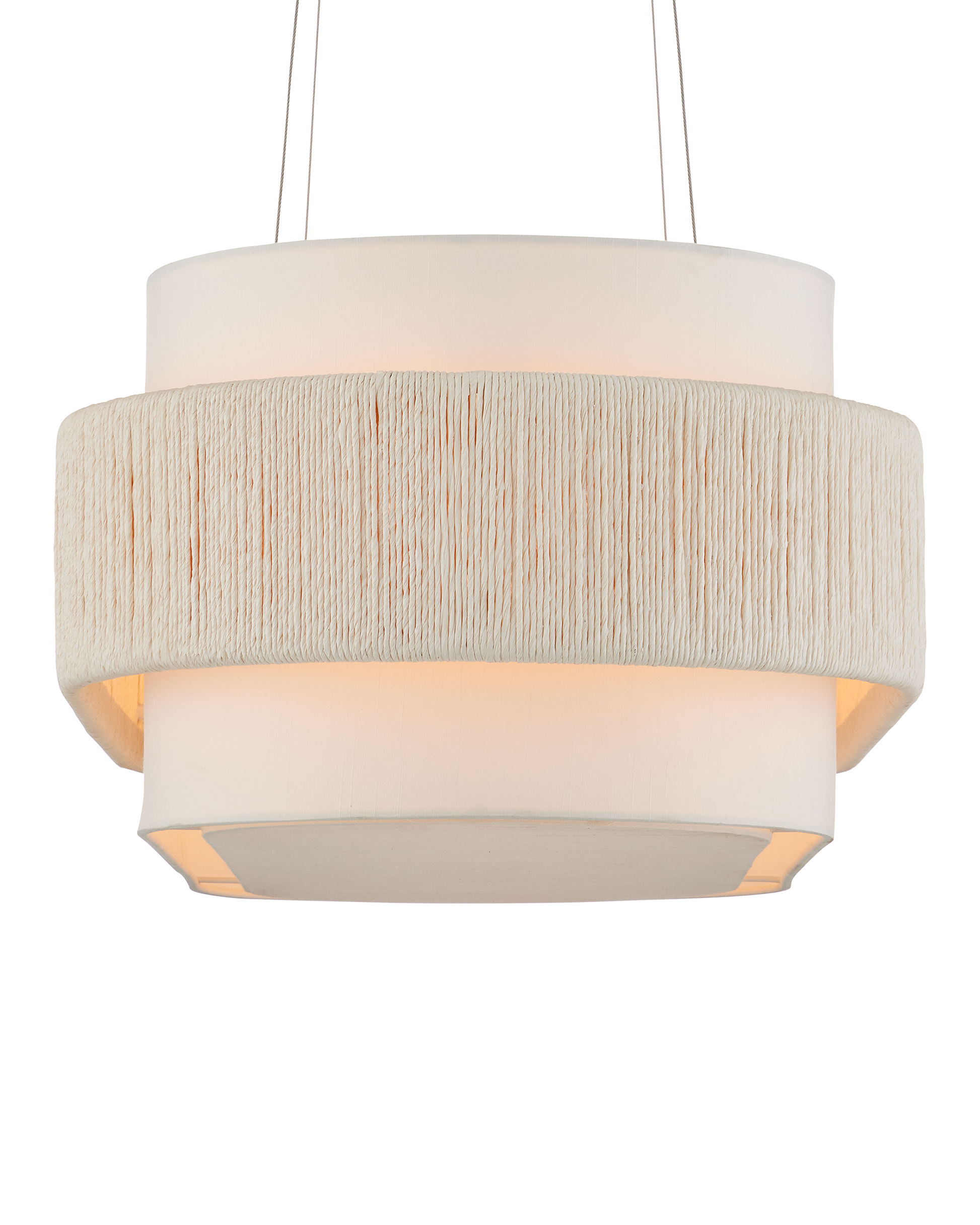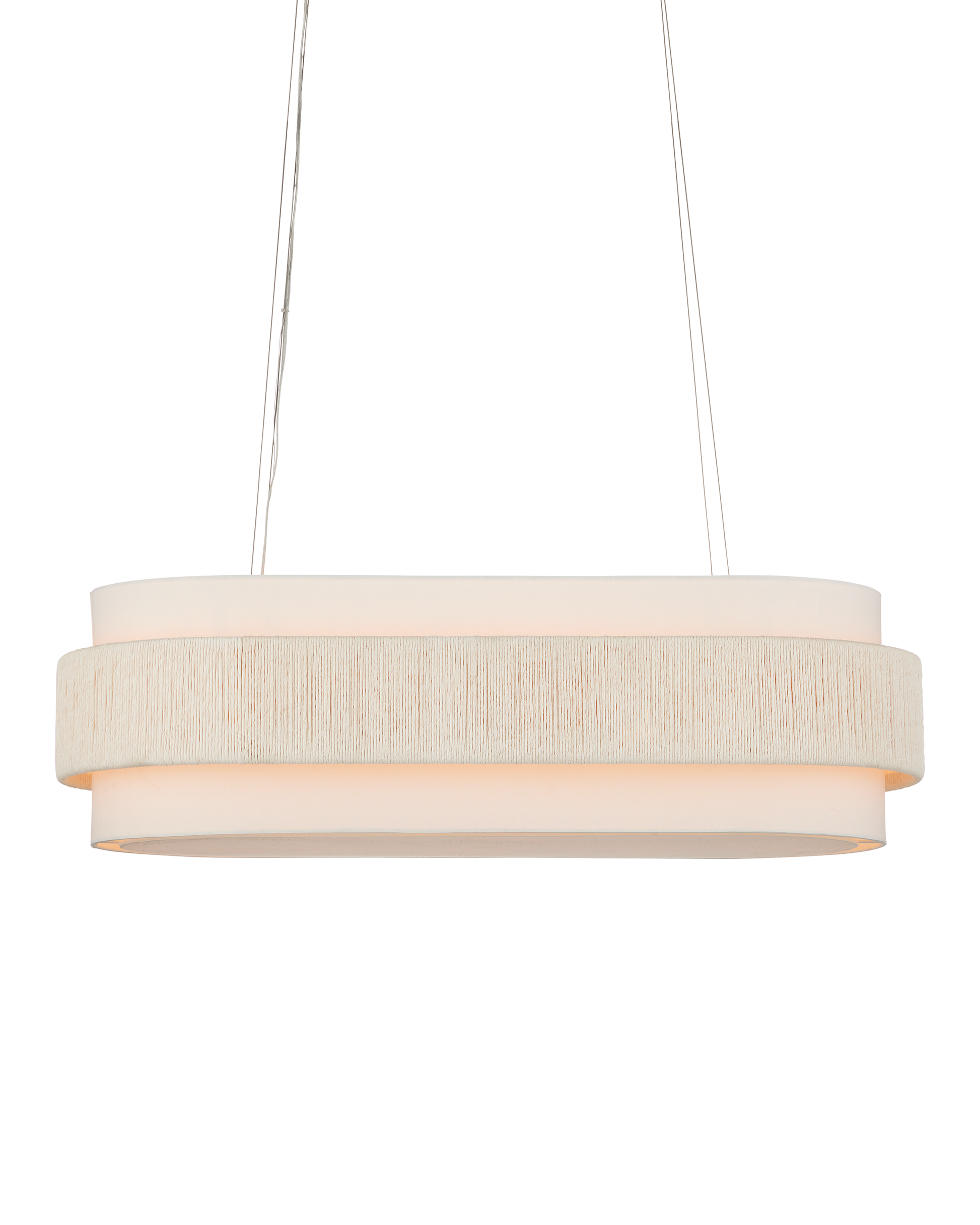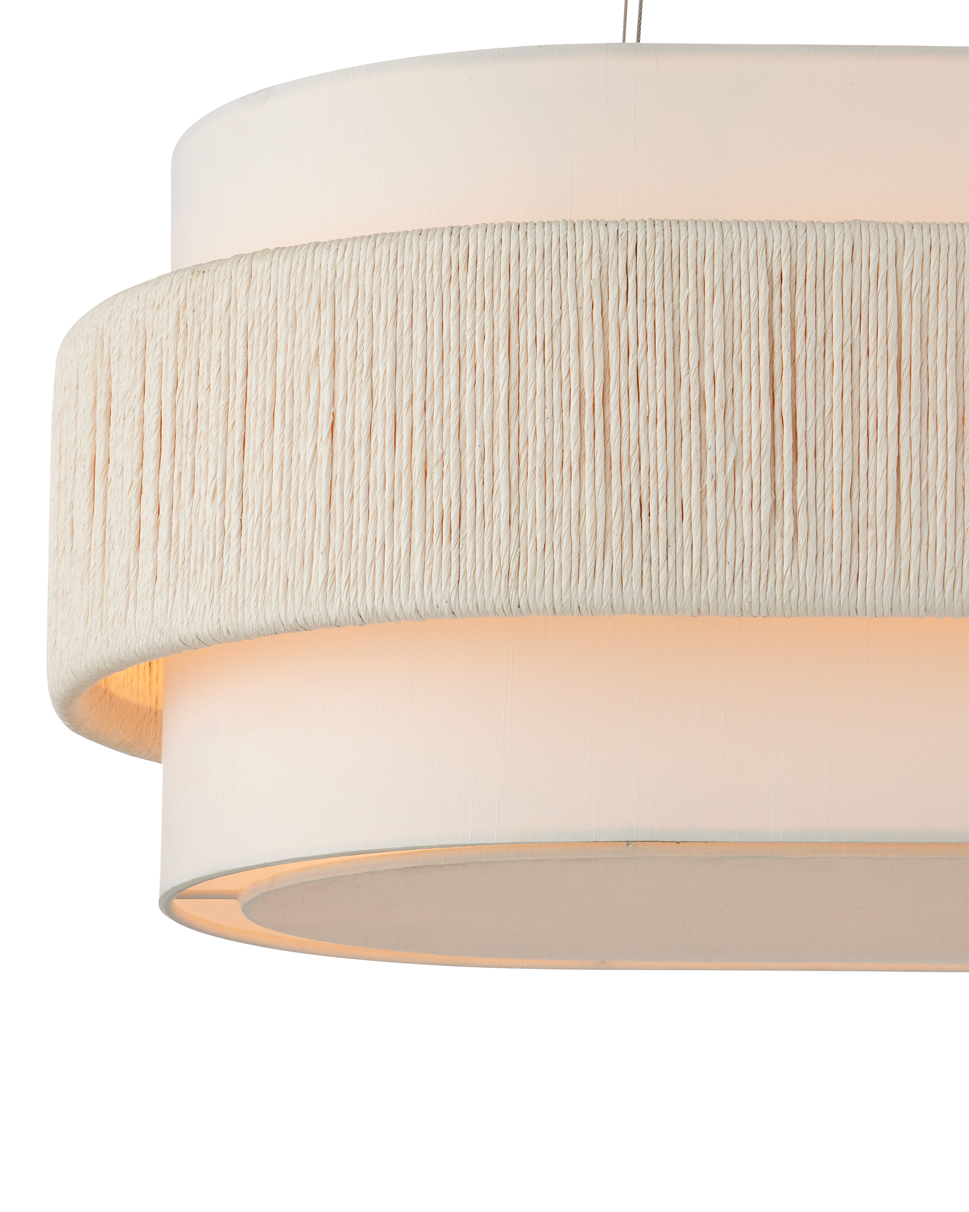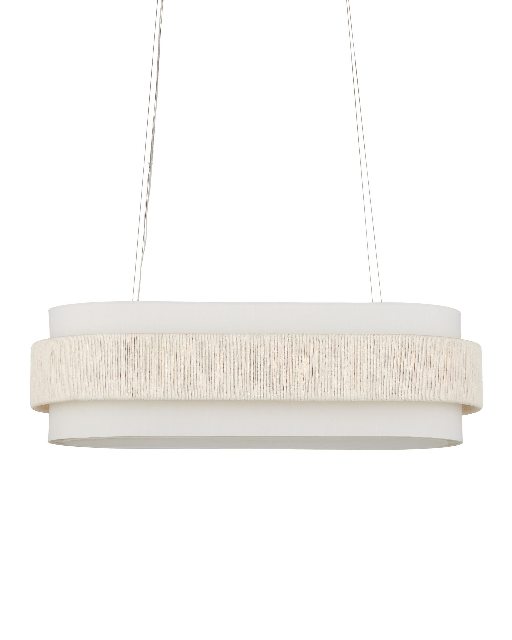With a band made from recycled paper that has been twisted like braided hair, the Monreale Oval Chandelier has an ultra-contemporary cleanness to its design. The paper, which is painted white, is wrapped around the middle of an off-white shantung shade. The canopy is finished in a Sugar White that contributes to the lightness of this white chandelier. The bottom of the shade is fitted with a diffuser to soften the glow. Adjustable from 19.5" to 150" with use of included chain/rod kit/cable. If your space calls for a longer drop, additional chain/rods/cable is available for purchase.