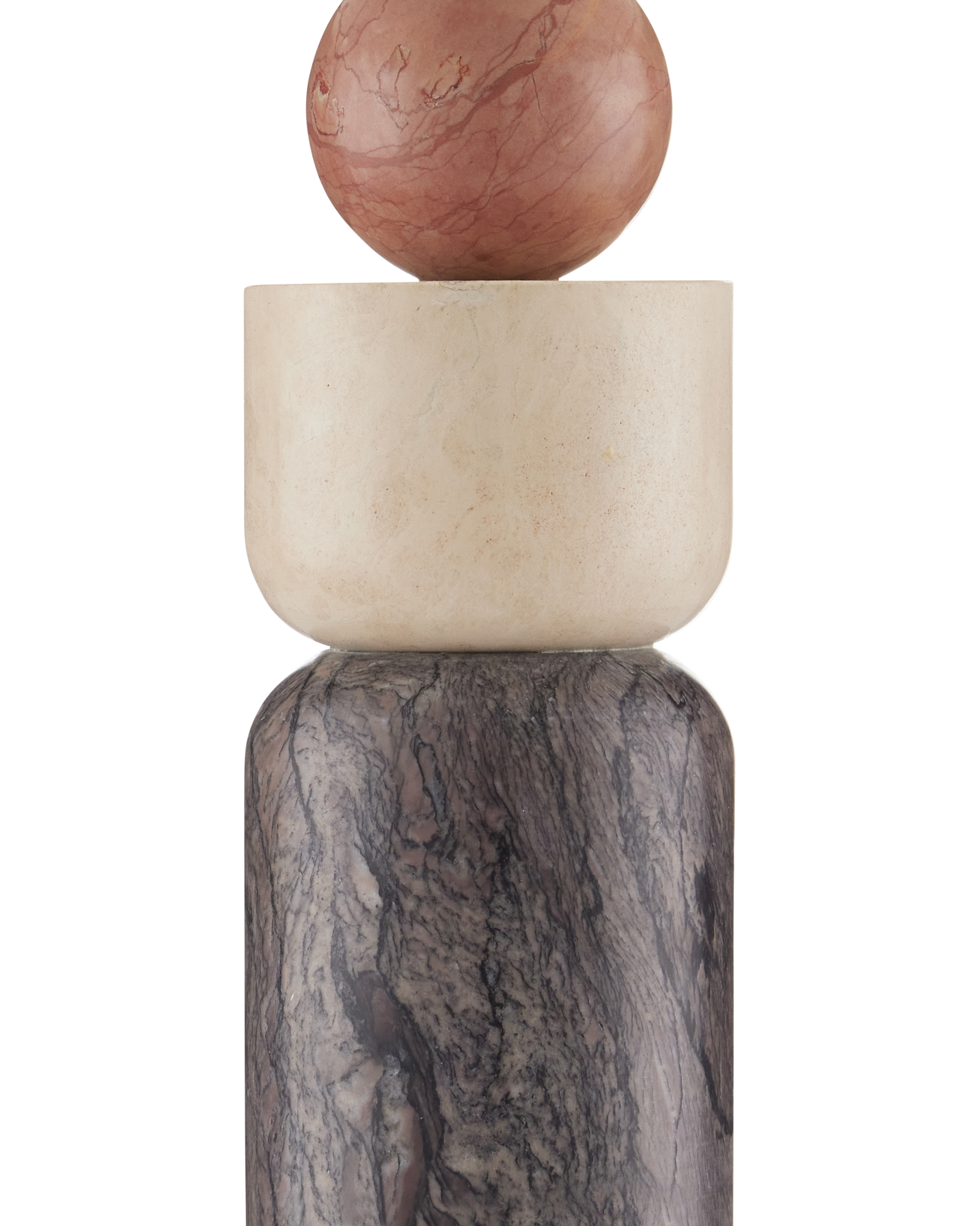 A delightfully geometric composition, the Morena Table Lamp is made of sections of Rosa Cappuccino Marble, Camello Neve Marble, and Breccia Marble. Designed by Aimee Kurzner, the multi-colored lamp is fitted with a beige poplin shade that is fastened with an orb finial, which matches the top Rosa Cappuccino marble ball. Because this contemporary lamp is made of natural stone, colors and patterns will vary.