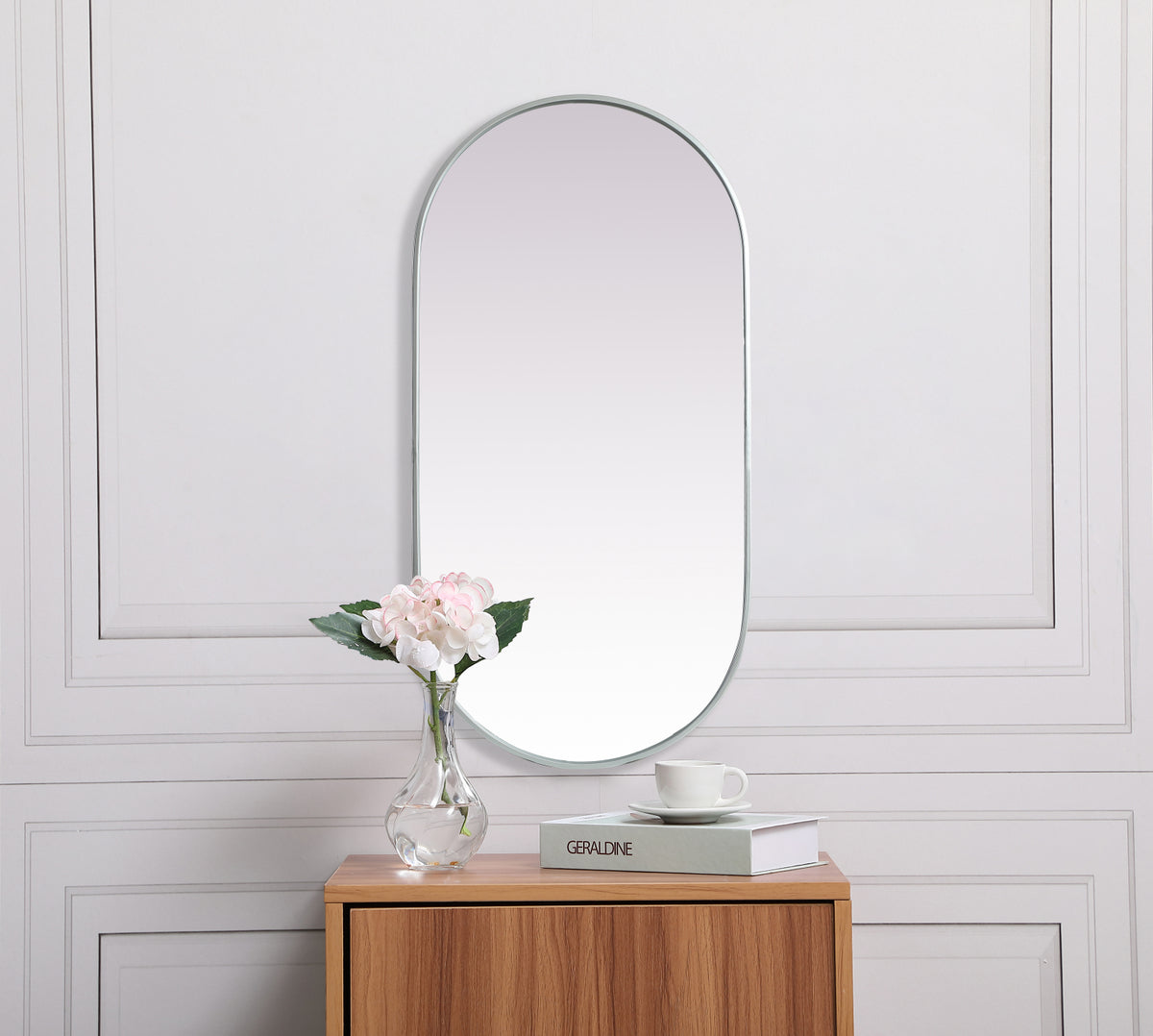 Instantly open up any space in your home with this minimalist wall-mounted mirror. Crafted of metal, this mirror strikes a pill-shaped silhouette. Its slender, clean-lined frame sports a classic finish, while the glass mirror within features a flat, for a brilliant reflection, letting the light bounce off to expand your space. Designed in a pill shape, this metal-frame mirror showcases in the three available satin finishes in black, brass, or silver. Mount this work of art in any room of your choice for added visual impact.