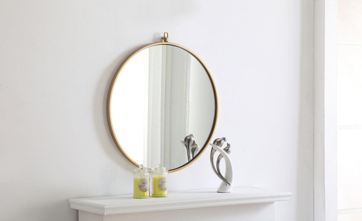 Enhance the appeal of your home or office with this contemporary mirror in brass finish featuring a thin rounded metal edges in a deep profile, reflecting a minimalist's design and trendy styling. To ensure your home safety, we use a metal hanger ring that are securely welded to the back of the metal frame , which sit on top of the frame for easy hanging. We recommend using suitable heavy duty picture/mirror hooks, selecting the best type of fixing for the particular wall you wish to hang the mirror on, using the appropriate rawl plug if required. Measurement: D24.