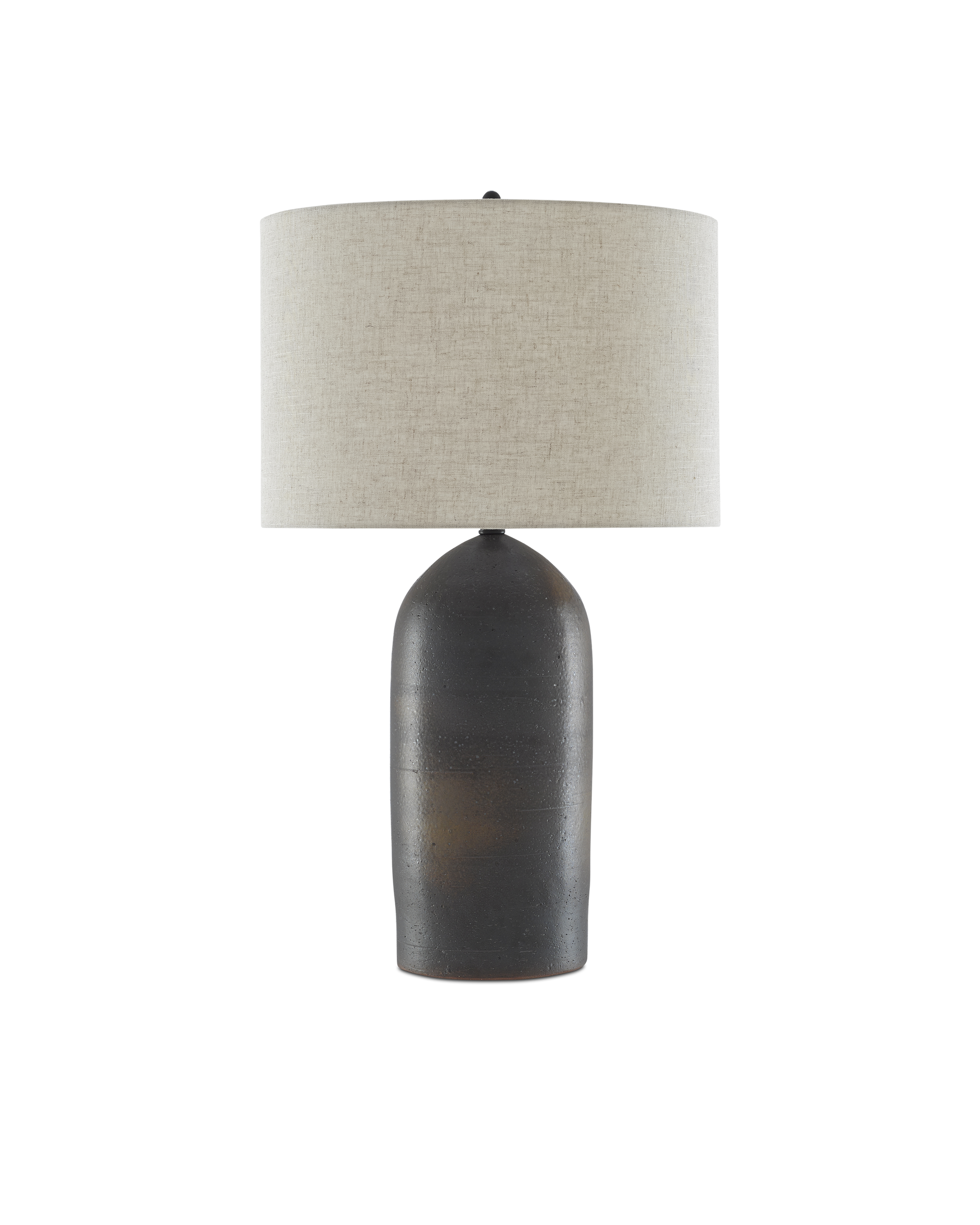 The torpedo-shaped body of the Munby Table Lamp has subtle variations in texture. Made of rust-colored and iron-hued ceramic, dark gray tones dominate on the lamp's body with rust patches showing through. Metal hardware in a semi-glossy black finish and a matching finial secure the natural linen shade to the gray lamp.