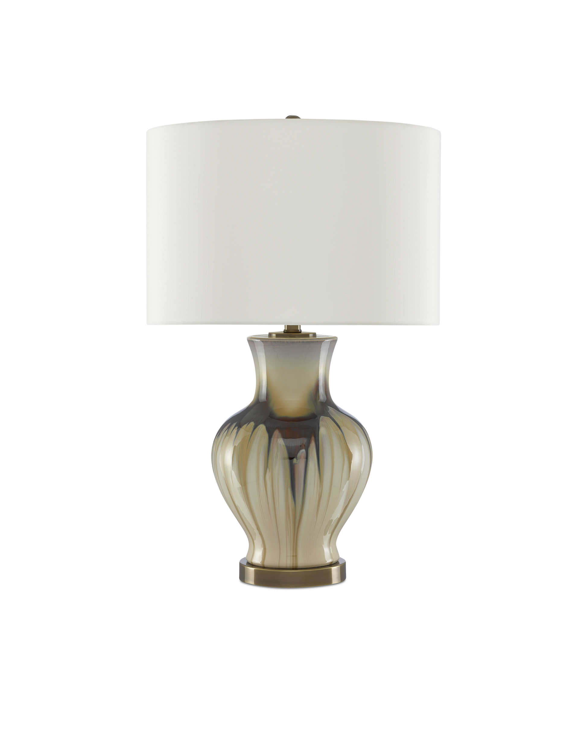 Dripping with personality, our Muscadine Table Lamp is made of cream and brown porcelain. The base and metal hardware in an antique brass finish pick up the caramel hues on the surface of the lamp's body. A finial, also in an antique brass finish, fastens the off-white shantung drum shade to this multi-colored lamp.
