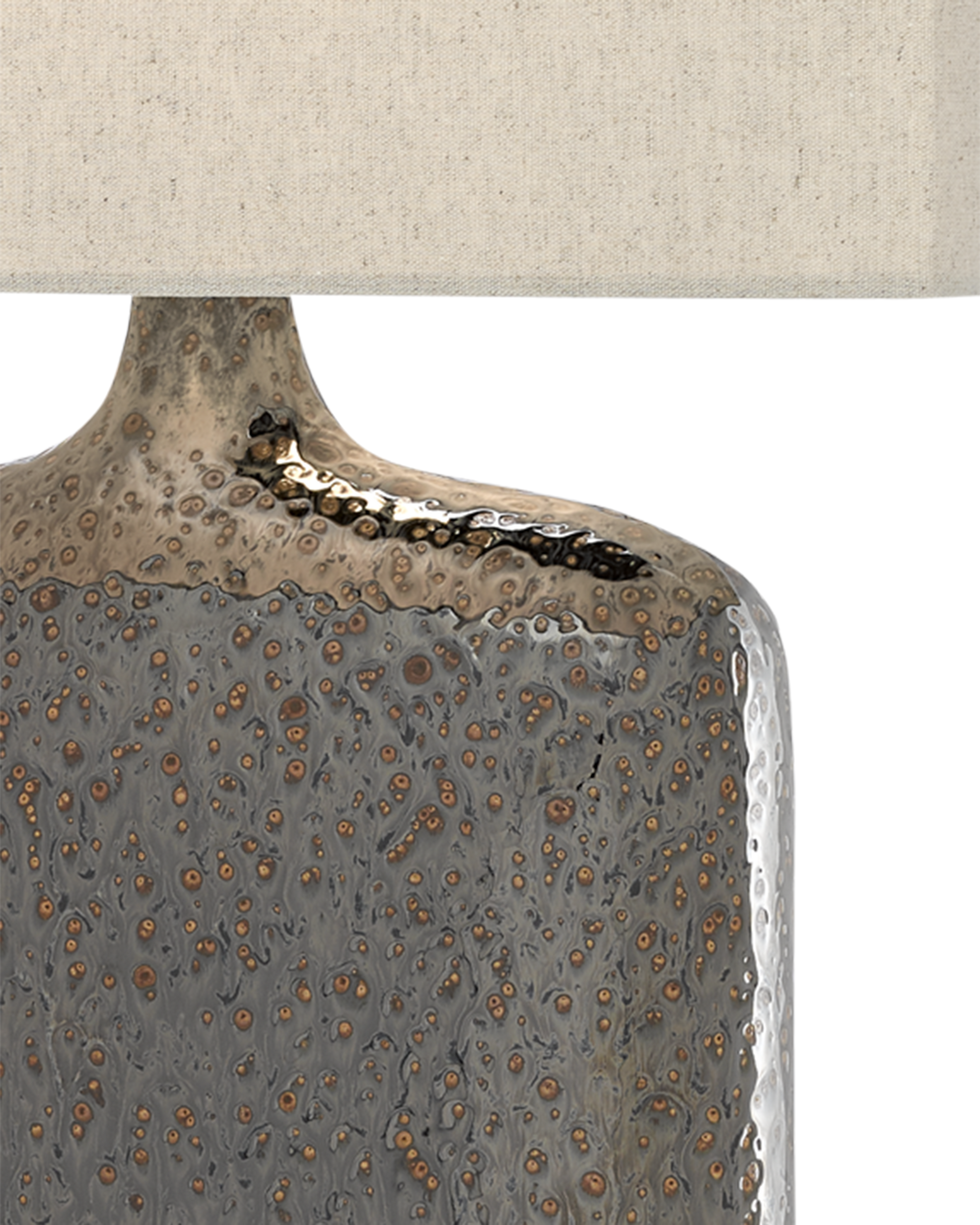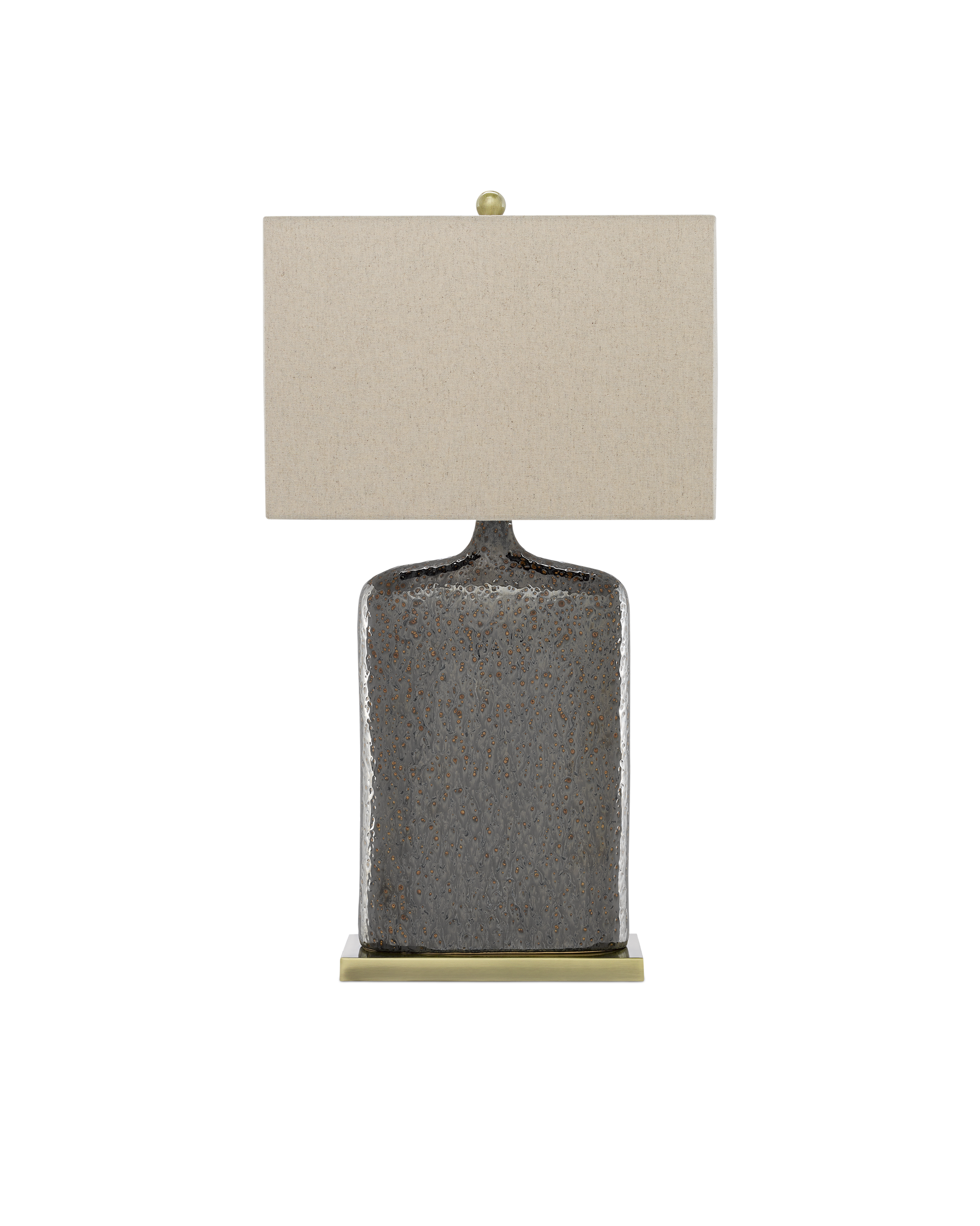 The rustic metallic bronze glaze on the Musing Table Lamp has natural pitting to add interest to the flask-like shape. The shallow depth of the elongated body, a metal plinth-like base in a bronze finish, and a khaki linen shade coalesce to bring the bronze lamp a rough luxe vibe.