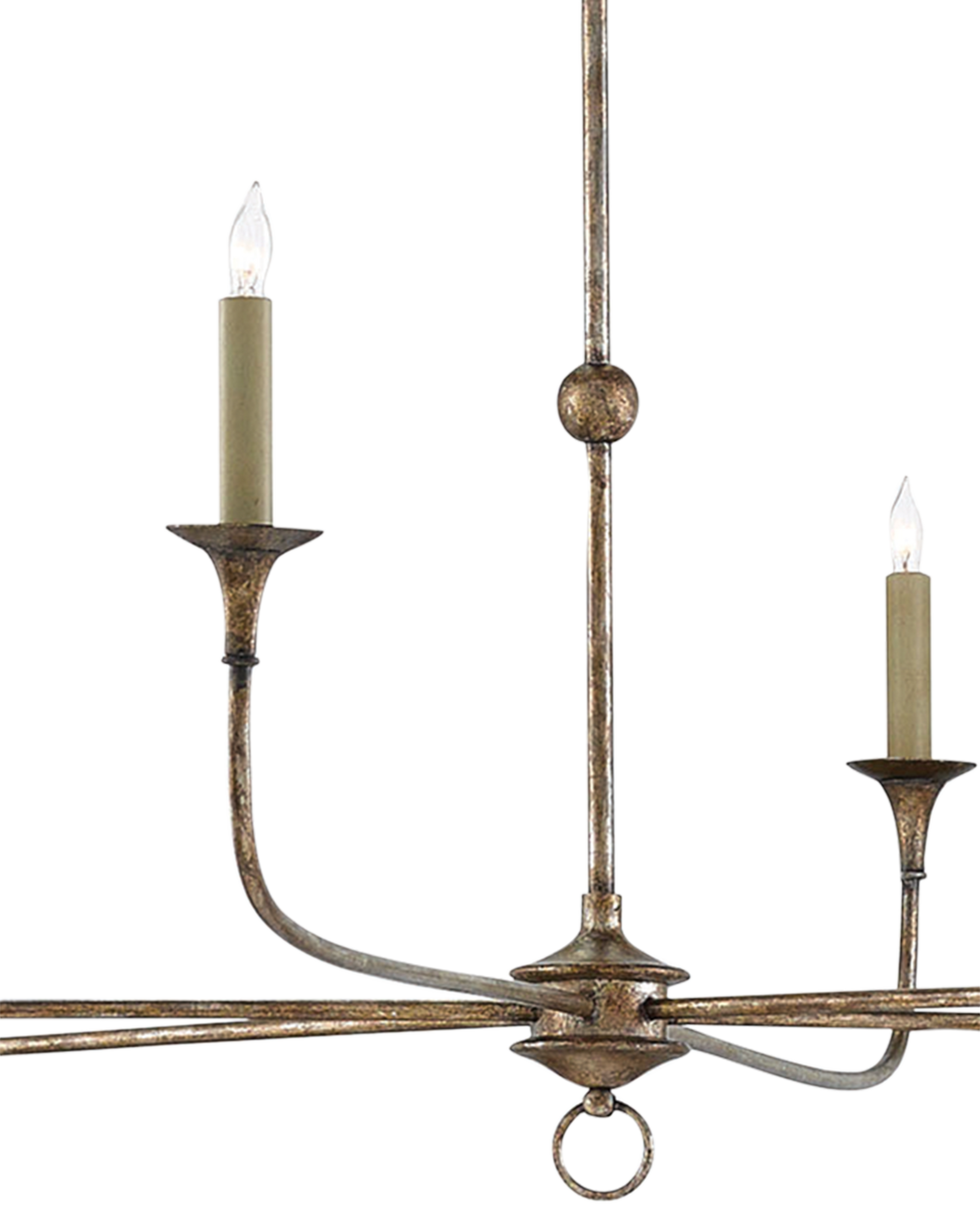 Design notes on the Nottaway Bronze Large Chandelier include long arms that stretch gracefully from a small cog and a ring that ornaments its bottom-most point. The profile of the fixture has a lovely fluidity to it, and the Pyrite bronze finish adds textural interest to the bronze chandelier. Adjustable from 30.75" to 99.75" with use of included chain/rod kit/cable. If your space calls for a longer drop, additional chain/rods/cable is available for purchase.
