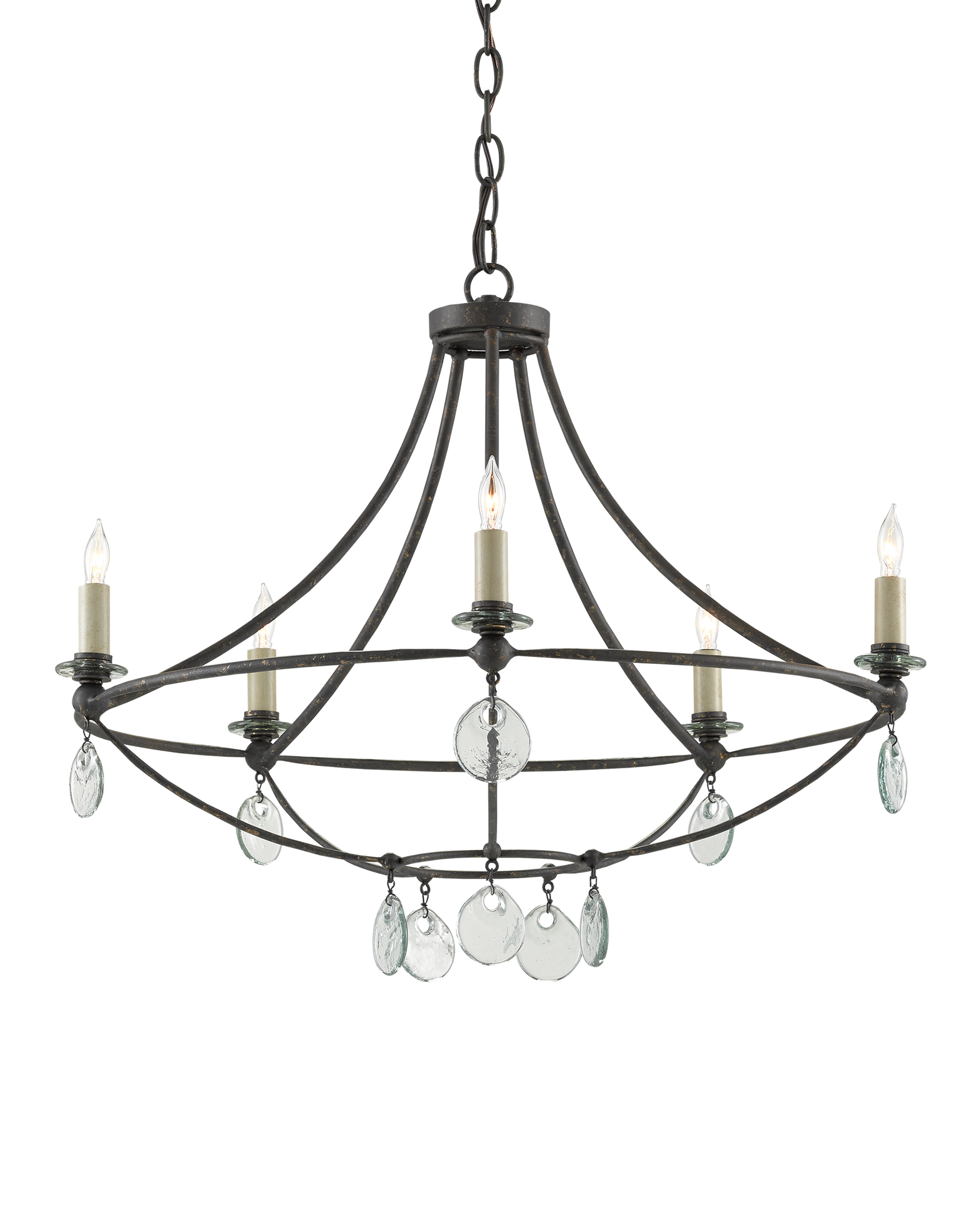 The Novella Small Chandelier showcases timeless craftsmanship and a creative use of materials. Recycled glass, which takes on a sheen when light strikes it, was used to create the bobeches and discs that adorn the black chandelier. The wrought iron frame in a Mayfair finish has an anchoring effect. Adjustable from 26.5" to 94.5" with use of included chain/rod kit/cable. If your space calls for a longer drop, additional chain/rods/cable is available for purchase.