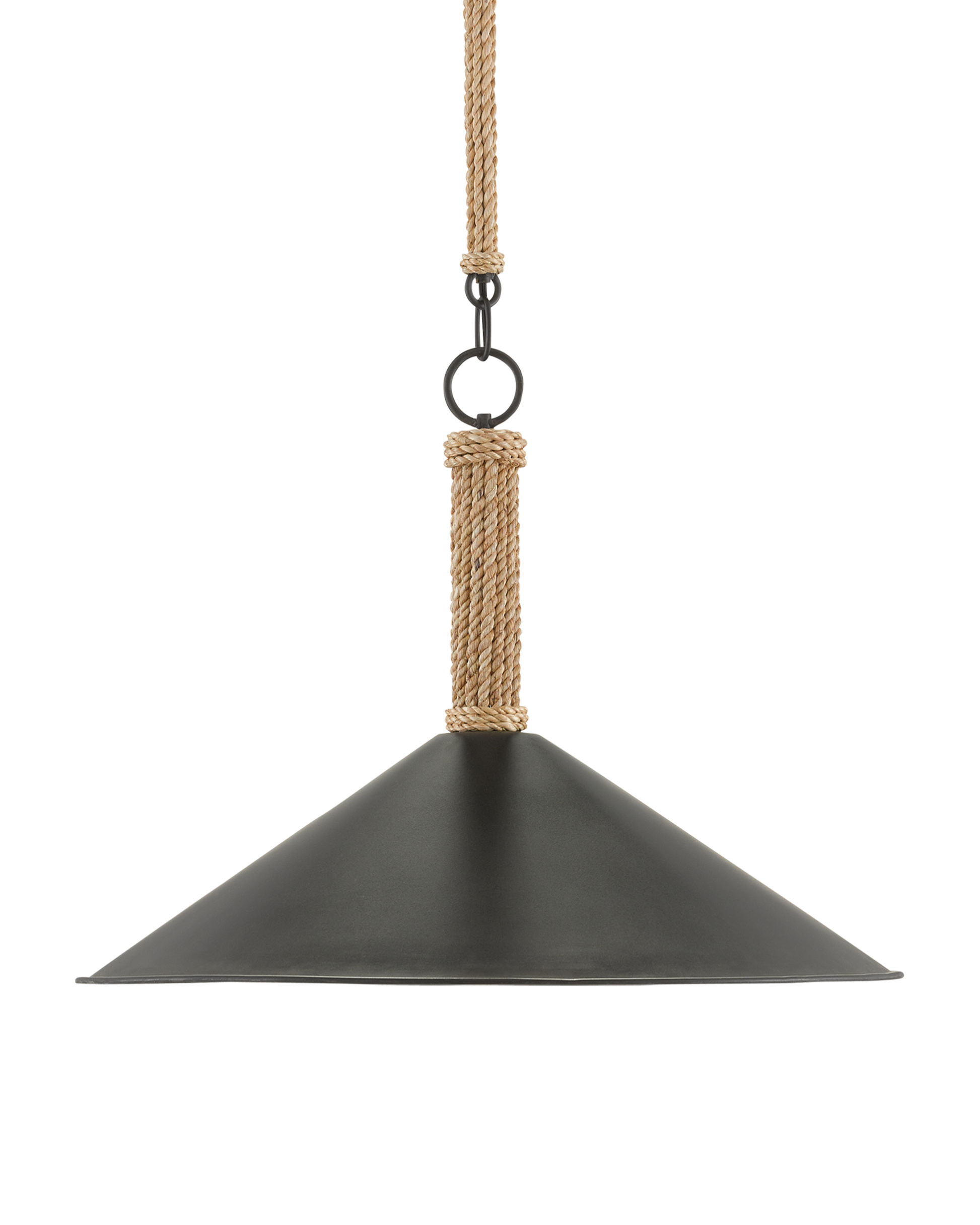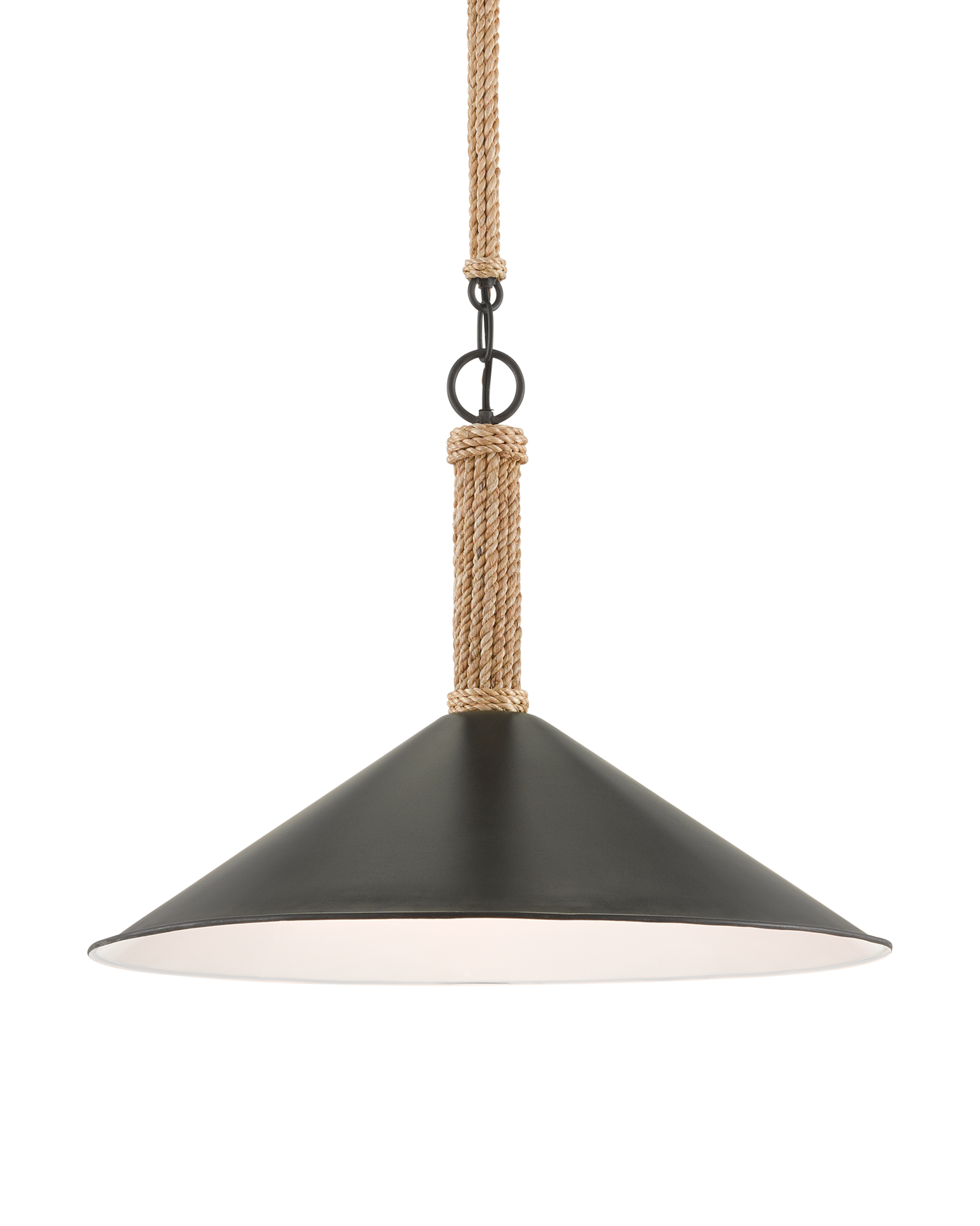 Designed by Tom Caldwell, the Ocracoke Pendant has a spun metal shade in a blacksmith finish. A design note worth mentioning is how It's hung: rope-covered metal links add a bit of natural charm to the black pendant. The interior of the shade, in a sugar white finish, makes its illumination crisp. Adjustable from 22" to 101" with use of included chain/rod kit/cable. If your space calls for a longer drop, additional chain/rods/cable is available for purchase.