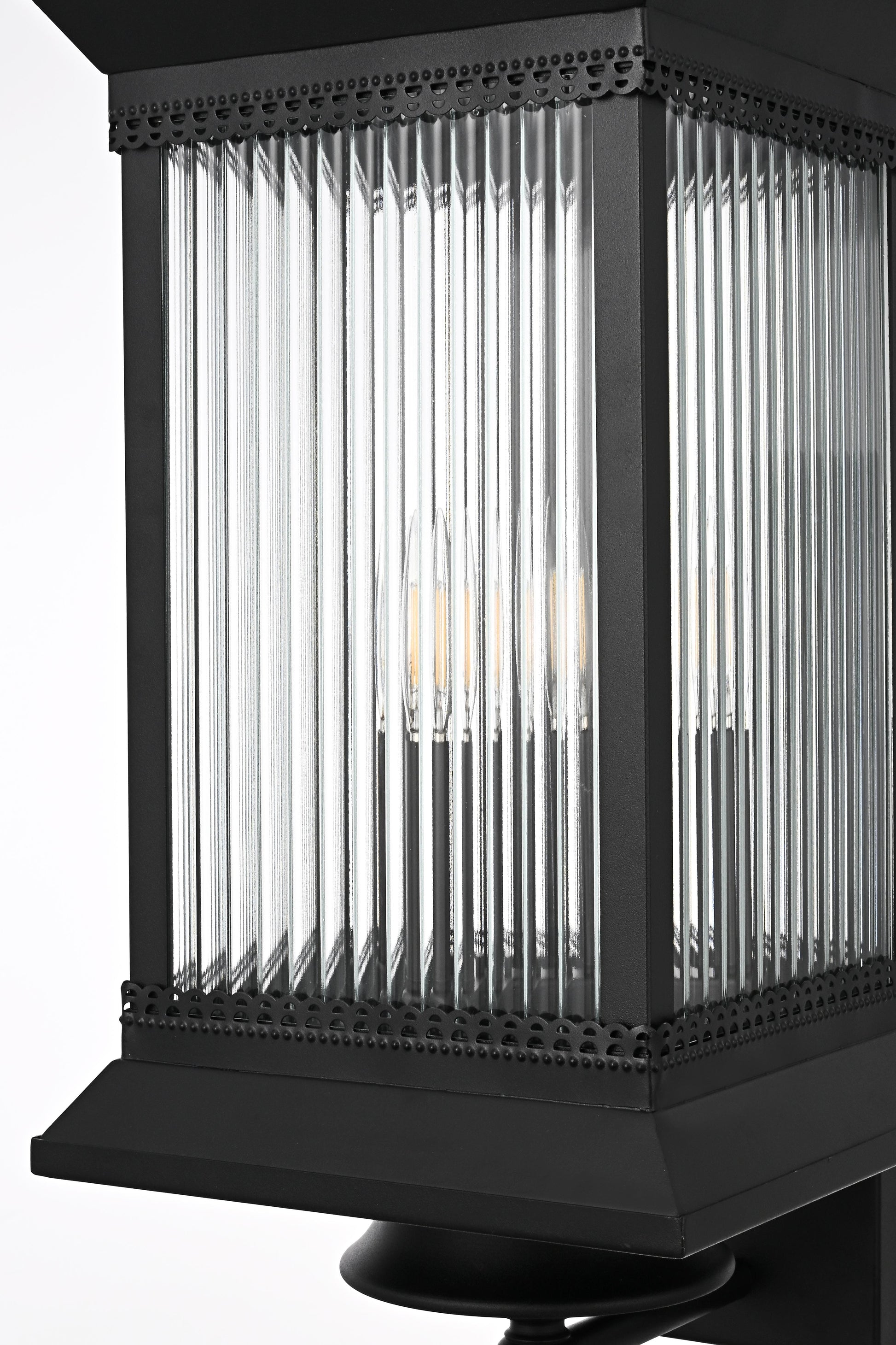 Enhance your home's exterior with this thoughtfully designed outdoor wall sconce that combines timeless character with modern functionality. The wall sconce features a robust iron construction that offers both durability and a bold architectural presence, making it a charming addition to your entryway or patio. Its signature black finish contrasts beautifully with the intricate ribbed glass panels, which cast enchanting, diffused illumination that adds a touch of warmth to any evening. The decorative accents along the trim exude a sense of sophistication, while the robust shape lends itself to a versatile range of outdoor styles—from classic to contemporary. This wall sconce serves as both a functional light source and a statement piece that complements your outdoor space with unique artistry.