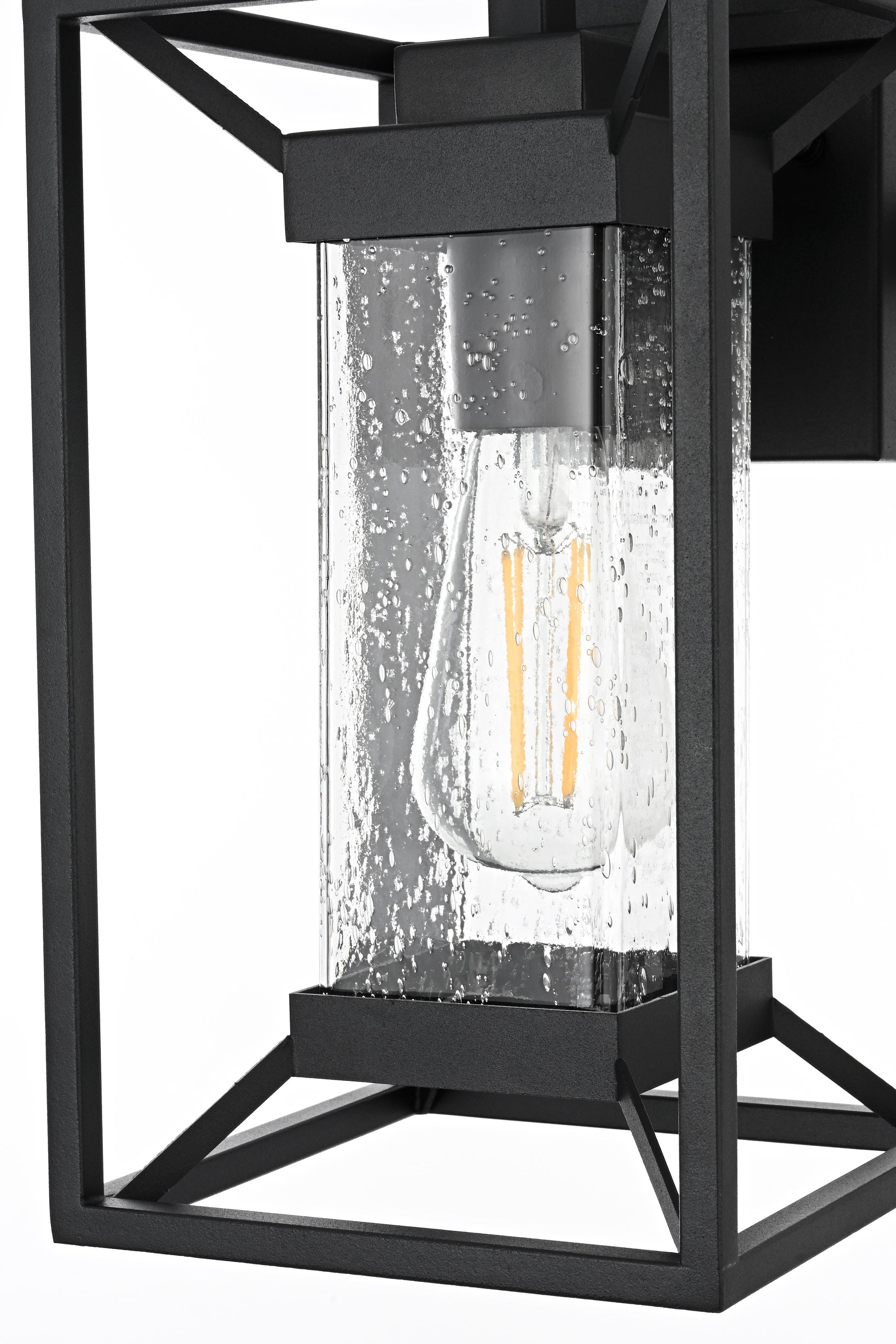 This outdoor wall sconce blends modern simplicity with timeless charm. The sturdy iron frame is designed in a geometric shape, beautifully housing the clear seeded glass that allows the warm glow of the light to shine through. The clear seeded glass adds texture to the illumination, creating an inviting and sophisticated glow that transforms the exterior of your home. With an E26 socket base that easily accommodates standard bulbs, this fixture not only provides style but also high functionality. Whether flanking your front door or lighting up your patio, this sconce elevates your outdoor space with a crisp, contemporary look that is both durable and refined.