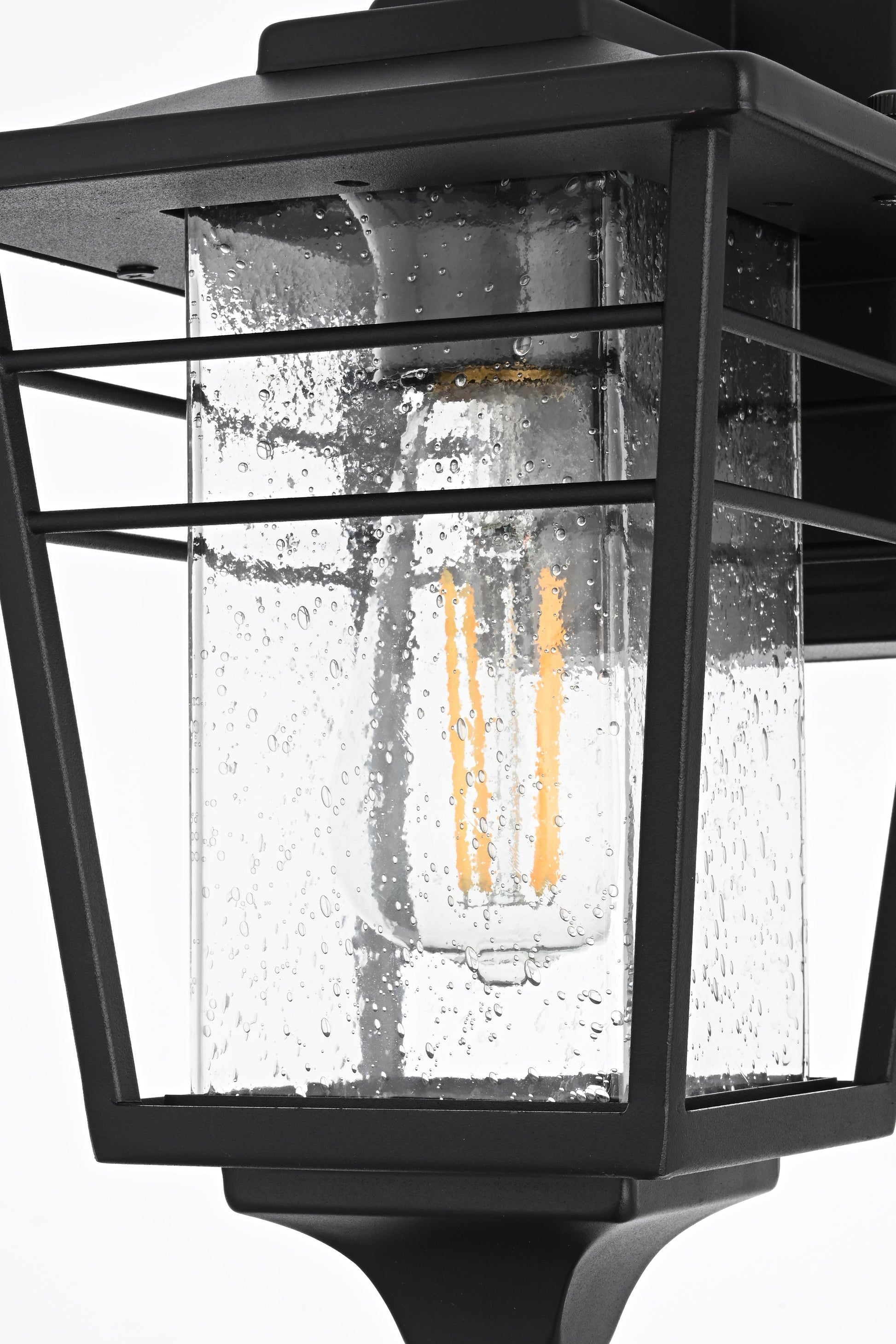 Introduce a touch of timeless charm to your outdoor space with this stunning wall sconce. Crafted from sturdy iron and clear glass, this outdoor fixture beautifully combines classic and modern elements to enhance your exterior decor. The seedy glass panels encased in a matte black frame produce a soft, ambient glow, ideal for creating an inviting atmosphere around your porch, patio, or garden. Its pyramid-style roof and tiered iron detailing provide a sophisticated architectural element, while the fixture’s E26 socket base accommodates a variety of bulb types to cater to your preferred level of illumination. Designed to withstand the elements, this wall sconce promises durability and style for years to come.