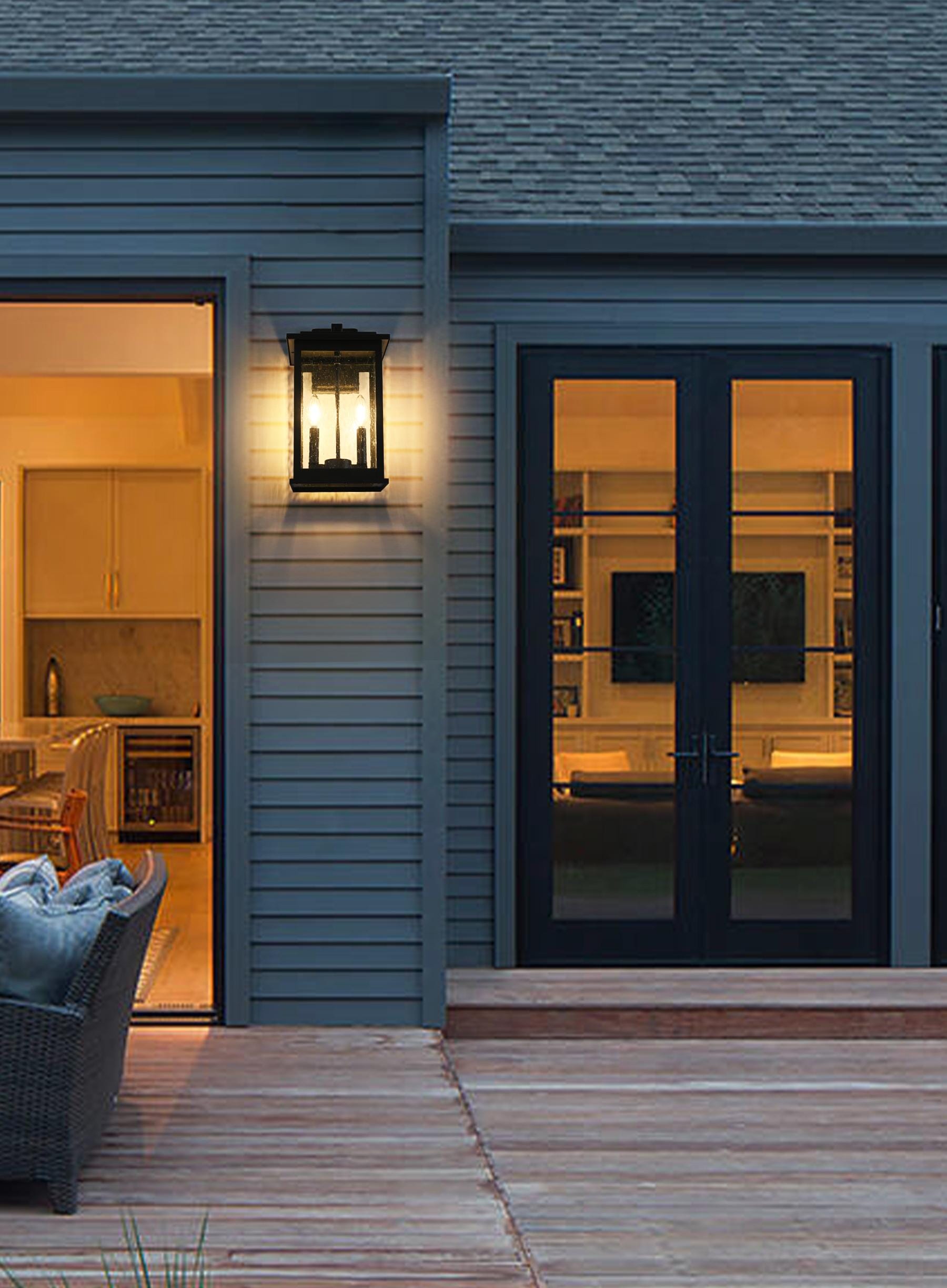 Enhance your outdoor space with this stunning wall sconce, merging a sleek, modern design with timeless craftsmanship. Crafted from durable iron and combined with clear glass panels, this outdoor light exudes an inviting warmth while providing functional illumination. Its crisp rectangular silhouette and clean lines blend beautifully with a variety of architectural styles, adding sophistication to any porch, patio, or entryway. The sconce's two E12 sockets makes it compatible with a range of bulb types, allowing for customizable ambiance. The textured seeded glass adds depth and visual interest, effortlessly scattering light to create a soft glow. Built to withstand the elements, this sconce not only provides aesthetic appeal but also offers reliable outdoor illumination that you can count on for years to come.