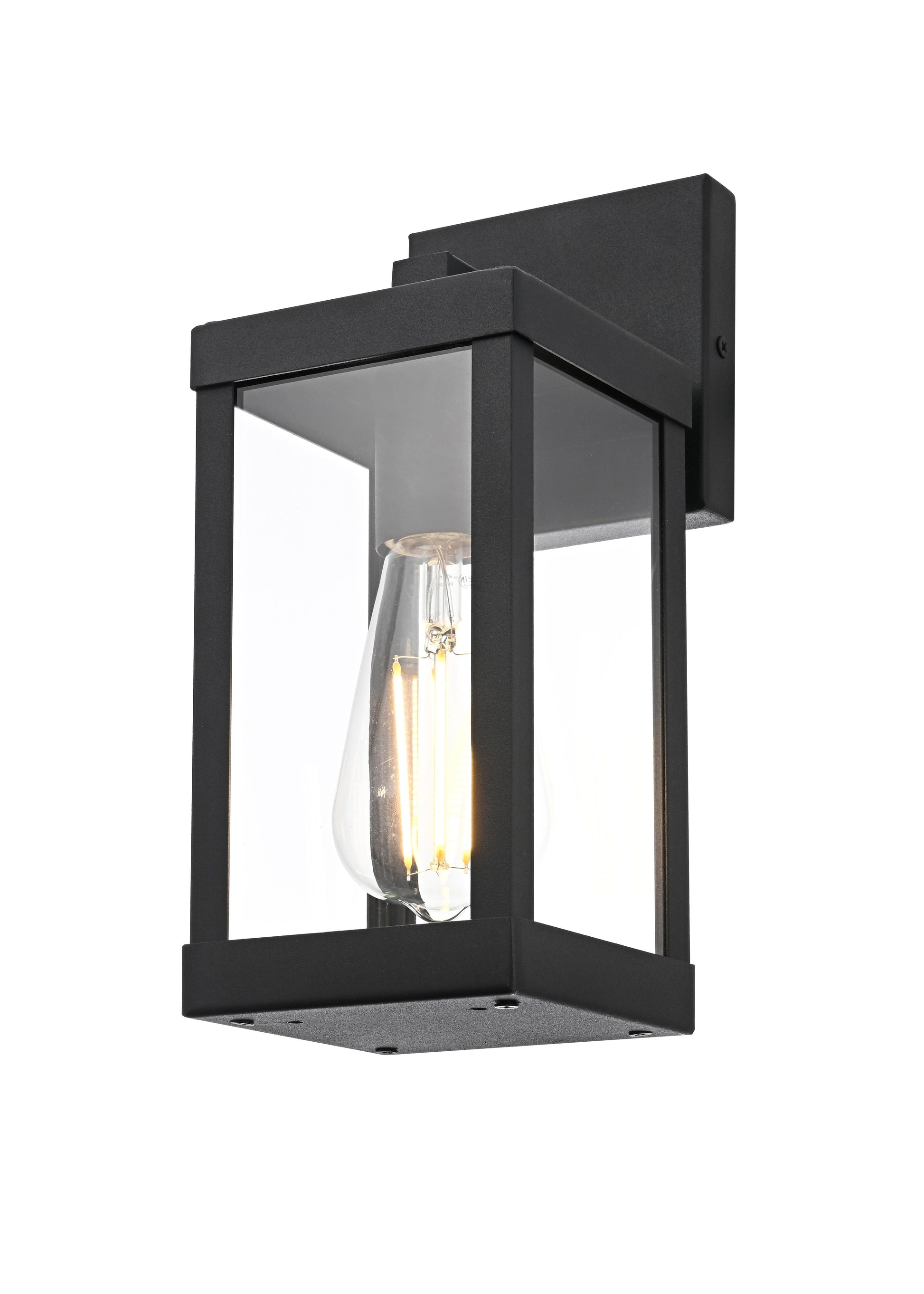 Bring definition and clarity to outdoor spaces with a modern lantern that makes a statement. A crisp rectangular frame, crafted from durable iron with a matte black finish, offers a bold contrast to the clear glass panels that surround the bulb. The structured design features an enclosed bottom for a clean and finished look, while the suspended bulb effect creates a striking focal point. A minimalist backplate and streamlined mounting arm maintain the sleek aesthetic, making this wet-rated wall light perfect for patios, entryways, and garages. Designed with an E26 socket (bulb not included), this lantern provides customizable lighting to enhance any exterior with precision and style.