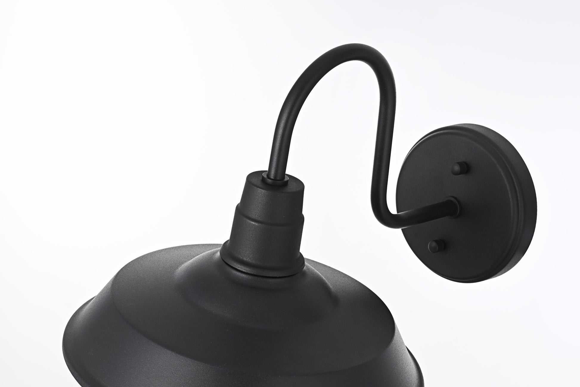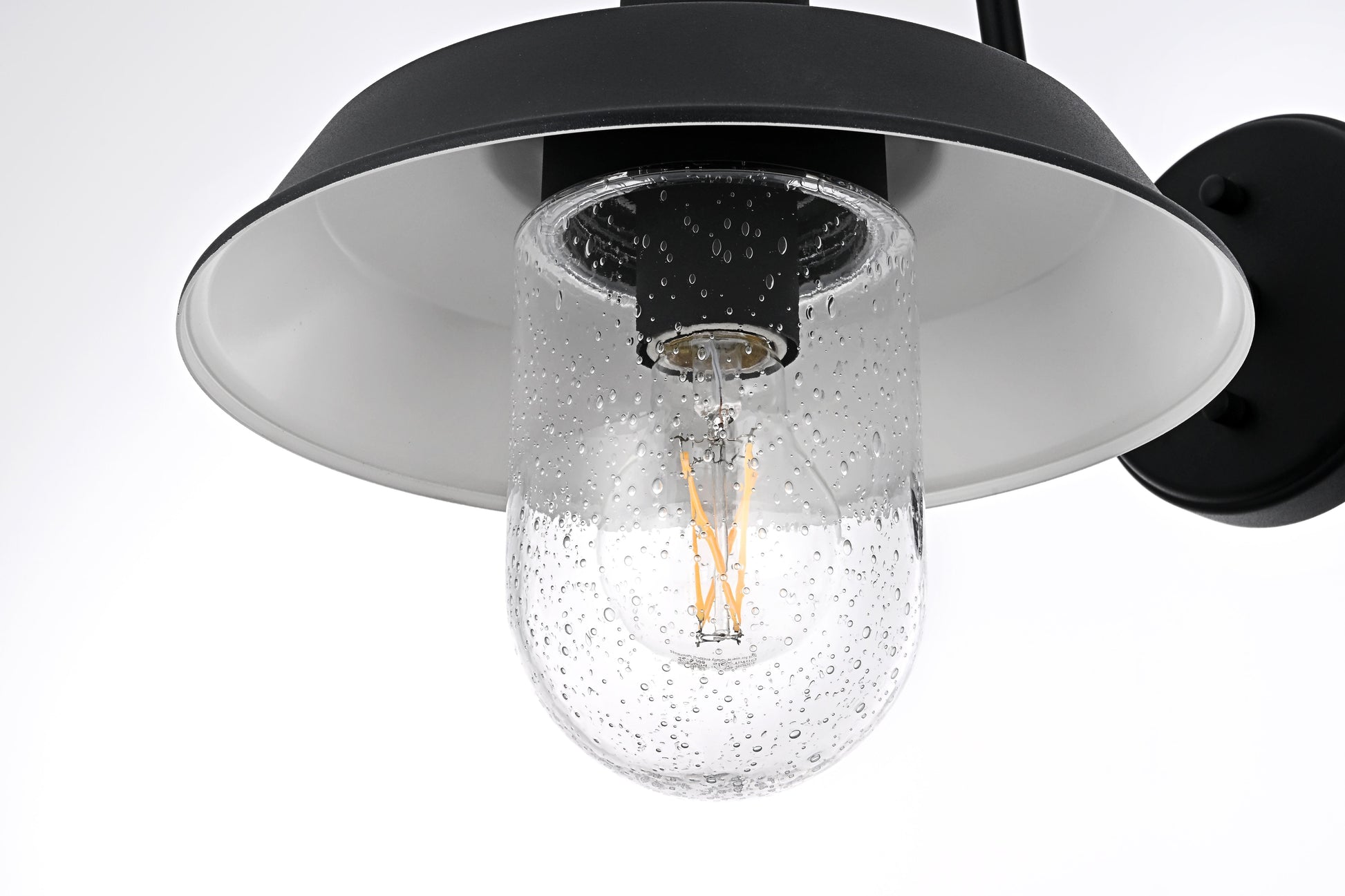 Bring industrial charm and farmhouse character to outdoor spaces with a barn-style wall light that balances vintage appeal with modern functionality. A gracefully curved gooseneck arm extends from the circular backplate, supporting a wide iron shade with a contrasting white interior that maximizes light reflection. The clear seeded glass globe adds a textured, artisanal touch, diffusing the light beautifully while showcasing the bulb inside. Finished in deep matte black, this durable iron sconce is wet rated for all-weather use, making it a perfect choice for patios, porches, garages, and outdoor walkways. Designed with an E26 socket (bulb not included), this versatile outdoor light pairs effortlessly with LED, Edison, or incandescent bulbs to create a warm and inviting ambiance.
