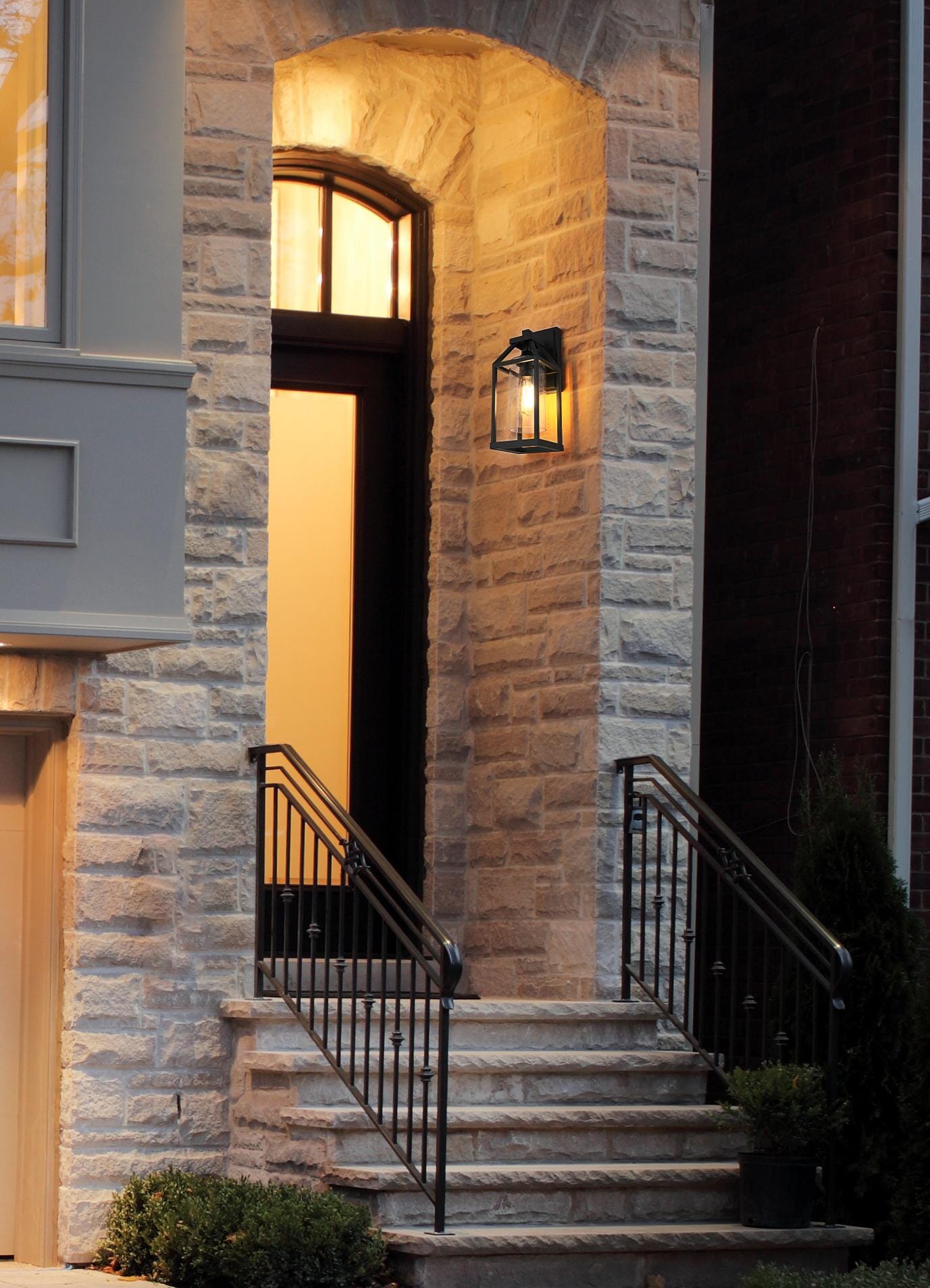This outdoor wall light blends architectural structure with functional lighting, featuring a geometric open-frame design and a peaked top that gives it a bold, defined look. The clear seedy glass cylinder at the center allows the light to shine through while adding subtle texture and depth. Crafted from iron and aluminum, the durable black-finished frame ensures long-term performance in outdoor conditions and is ETL Wet Rated for reliability in entryways, patios, and garage exteriors. Available in 14-inch, 19-inch, and 24-inch heights, this fixture offers versatility to complement different outdoor spaces. The dimmable function allows for adjustable brightness when paired with a compatible dimmer, while the E26 medium-base socket (bulb not included) provides flexibility for different bulb styles. Pre-wired with a 7-inch lead, this wall light is a strong and stylish choice for enhancing outdoor spaces. Built with marine-grade, corrosion-resistant aluminum, this sconce withstands coastal conditions for long-lasting durability.