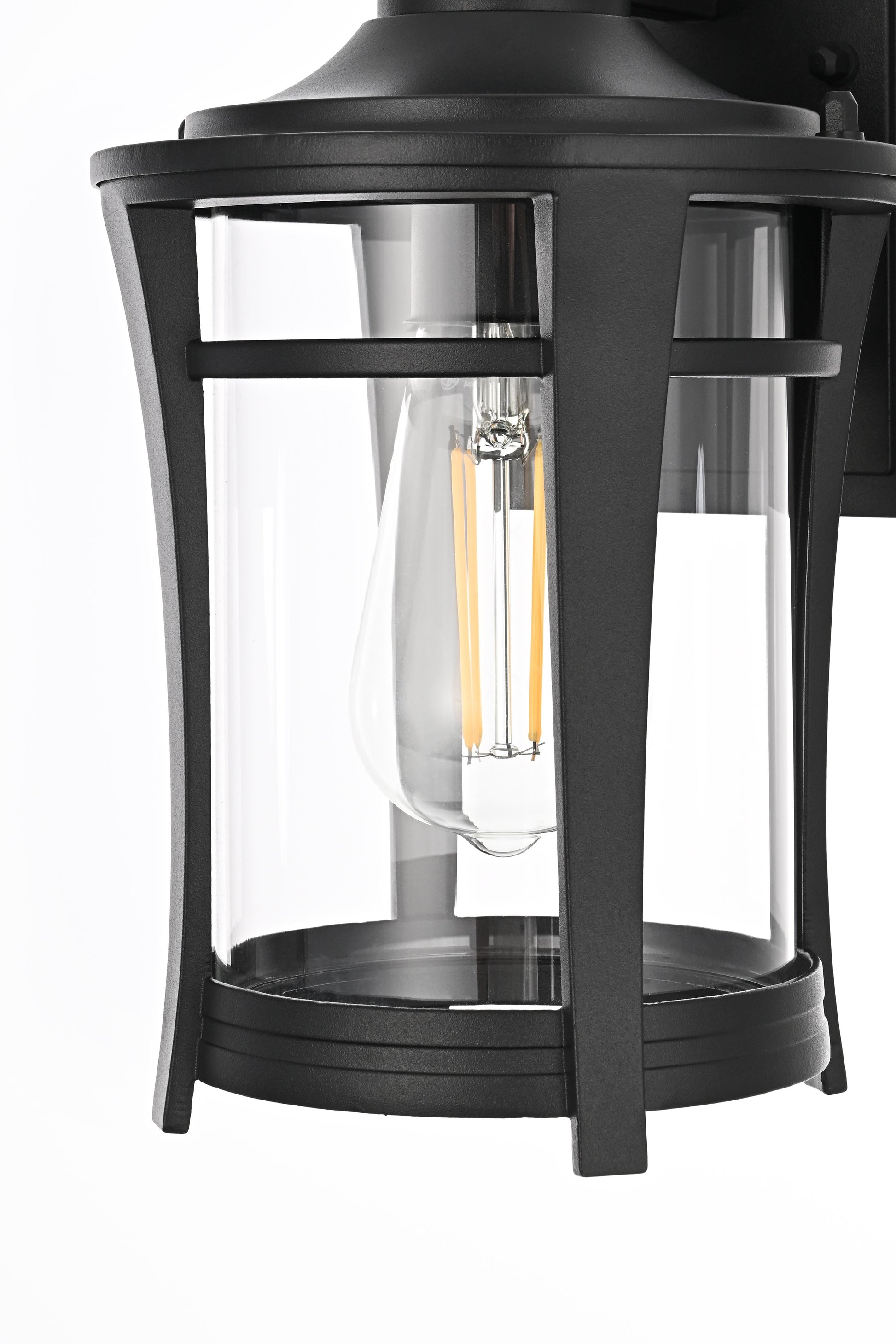 This outdoor wall light combines classic lantern styling with a modern, curved frame, featuring a rounded top, clear glass panels, and gently arched metal supports for a structured look. The black-finished iron and aluminum construction ensures durability, while the open-bottom design allows for easy bulb changes. The clear cylindrical glass provides full illumination, making it a great choice for entryways, patios, and garage exteriors. The square backplate offers a secure mount that contrasts with the lantern’s curved shape, creating a visually balanced design. This fixture supports a medium-base E26 bulb (not included) and is dimmable, allowing for adjustable brightness when paired with a compatible dimmer. ETL Wet Rated for outdoor durability, this versatile and well-structured wall light brings both practicality and style to any exterior space. Built with marine-grade, corrosion-resistant aluminum, this sconce withstands coastal conditions for long-lasting durability.