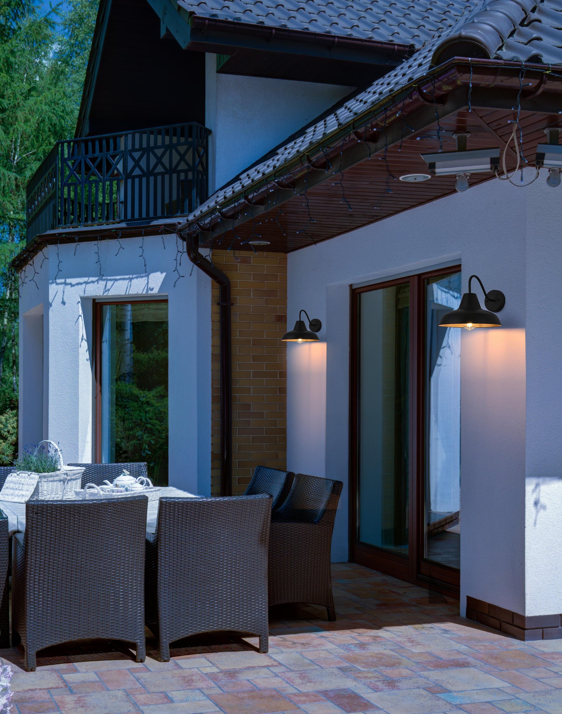 This outdoor wall light brings a timeless barn-style aesthetic to exterior spaces, featuring a flared metal shade, curved gooseneck arm, and contrasting black-and-gold finish. The wide metal shade directs light downward, while the gold interior enhances brightness with a warm, reflective glow. Built from sturdy iron, this fixture is ETL Wet Rated for durability in porches, patios, garages, and farmhouse exteriors. The compact 5-inch round backplate provides a secure mount, and the dimmable functionality allows for adjustable brightness when paired with a compatible dimmer. Designed for a medium-base E26 bulb (not included), this fixture blends practical lighting with industrial character, making it a strong and stylish addition to any outdoor space. Built with marine-grade, corrosion-resistant aluminum, this sconce withstands coastal conditions for long-lasting durability.