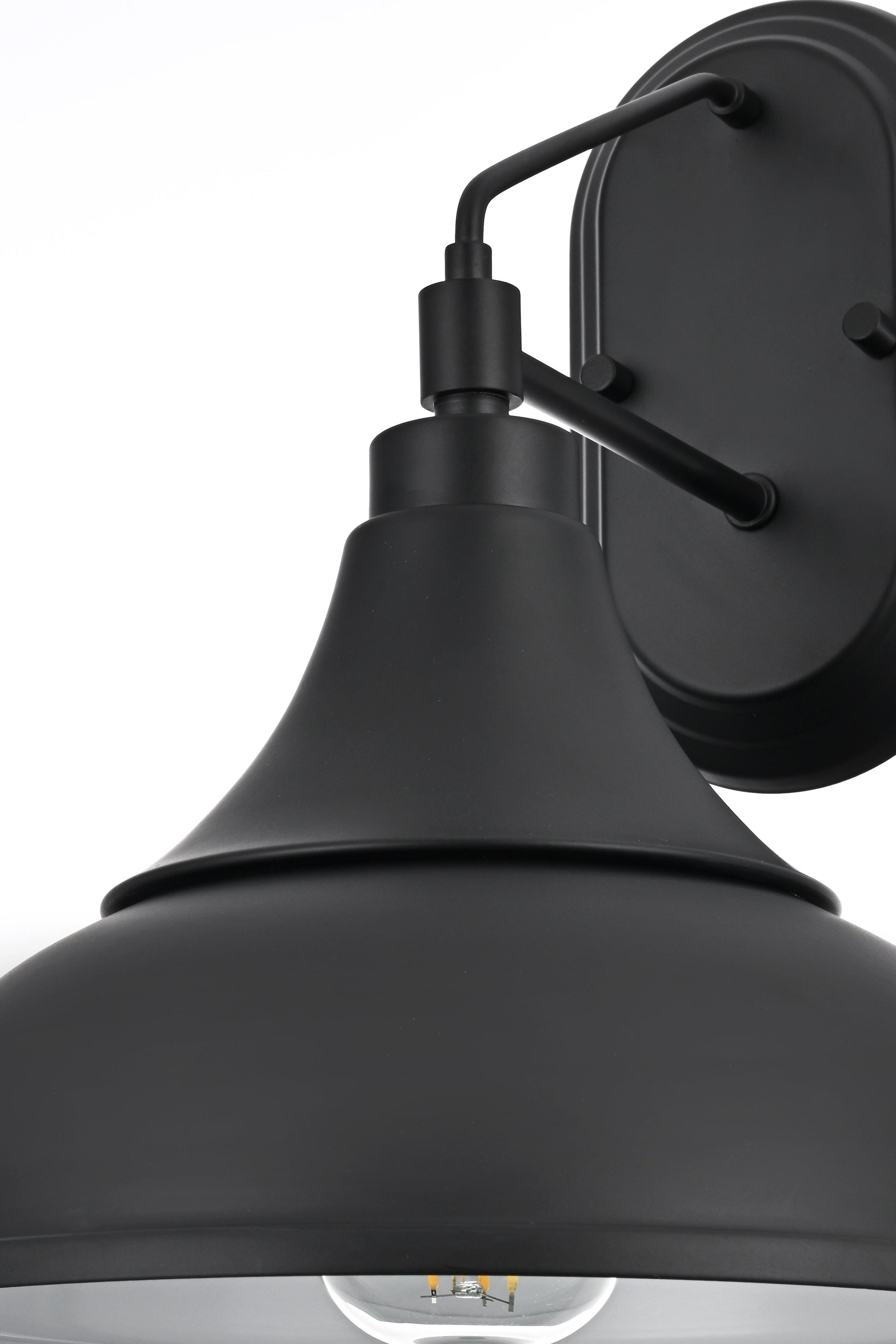 Create a bold statement in any outdoor space with a barn-style wall light that blends industrial charm with a refined design. A wide, curved dome shade in matte black directs light downward for practical illumination, while the crisp white interior enhances brightness for a well-lit entryway or patio. A structured arm with clean angles connects seamlessly to an oval backplate, bringing depth and character to exterior walls. The open-bottom shade ensures easy bulb replacement and functional task lighting, making it ideal for pathways, porches, and storefronts. Designed with an E26 socket (bulb not included), this wet-rated outdoor light withstands the elements while offering a stylish solution for exterior lighting. Whether paired with a warm Edison bulb for a vintage feel or a bright LED for modern efficiency, this versatile gooseneck sconce adds both character and practicality to outdoor spaces.