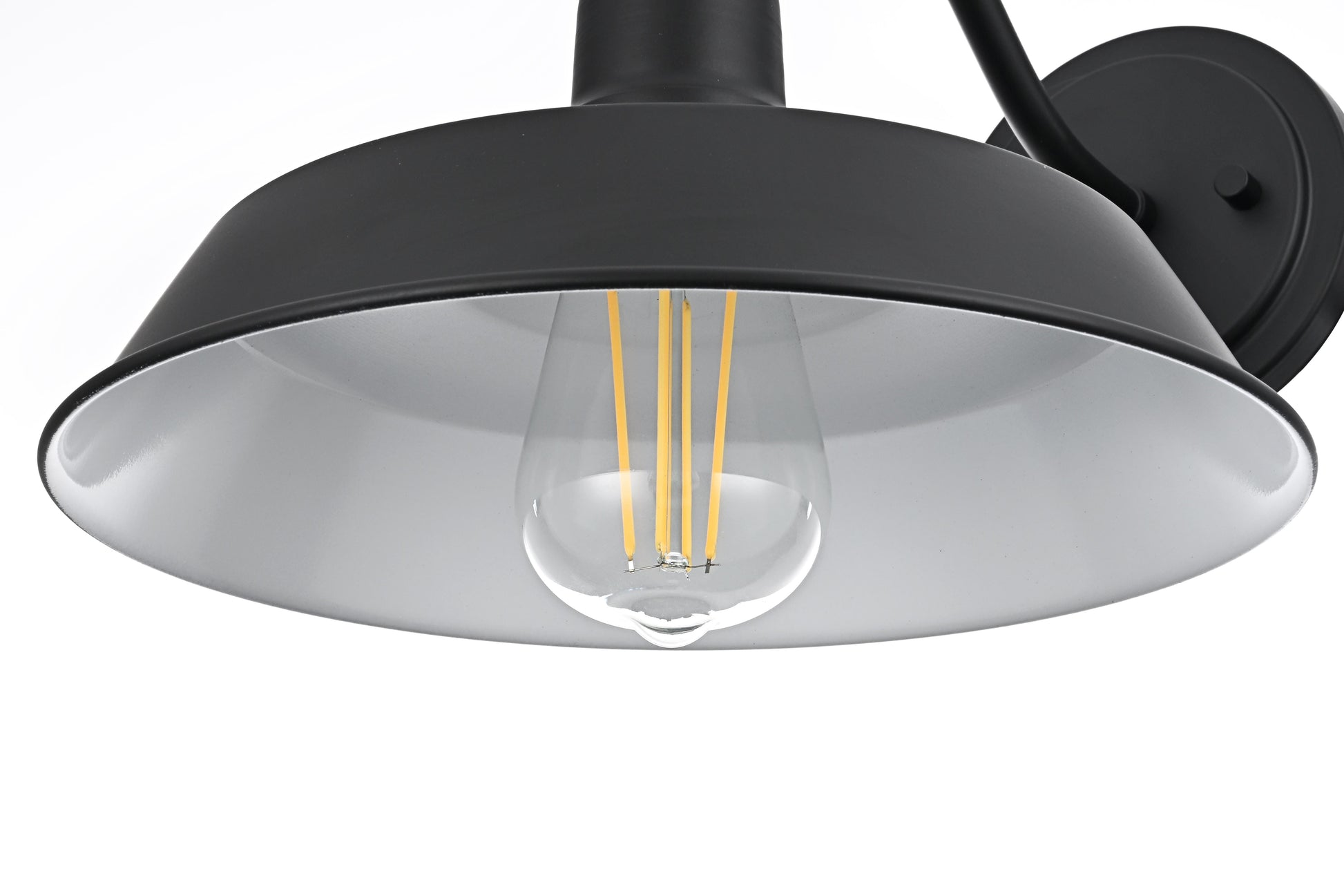 Bring bold industrial character to outdoor spaces with a barn-style gooseneck wall light that delivers both function and style. A wide, flared metal shade in matte black directs light downward, creating a well-lit entryway, patio, or driveway. The crisp white interior maximizes brightness, while the gracefully curved gooseneck arm extends from a sturdy circular backplate, adding depth and balance to exterior walls. The open-bottom shade ensures effortless bulb changes and efficient task lighting, making it perfect for porches, storefronts, and garages. Designed with an E26 socket (bulb not included), this wet-rated outdoor light withstands the elements while enhancing any exterior setting. Whether paired with a vintage Edison bulb for a warm glow or a bright LED for modern efficiency, this gooseneck sconce is a standout piece for any outdoor space.
