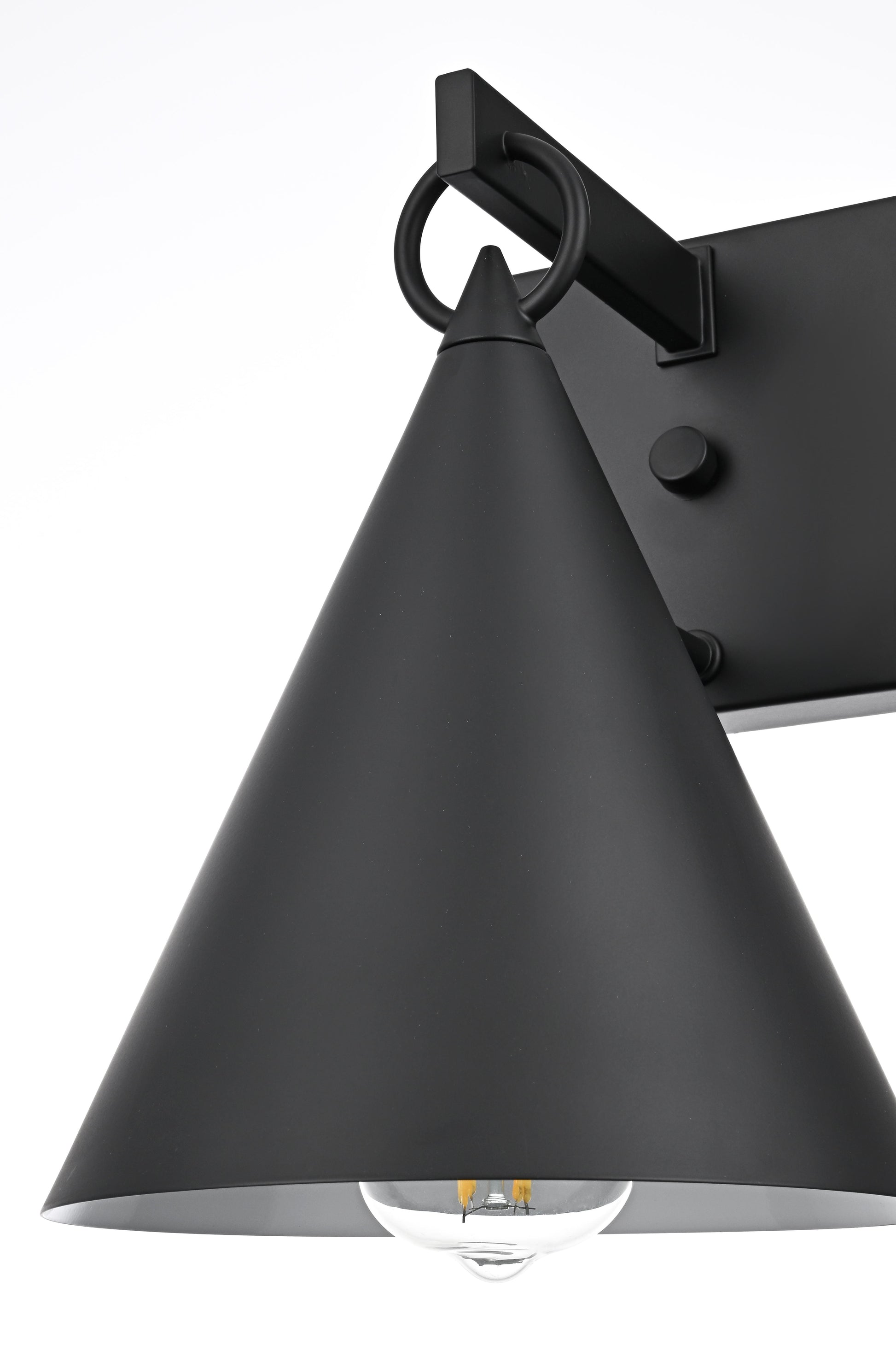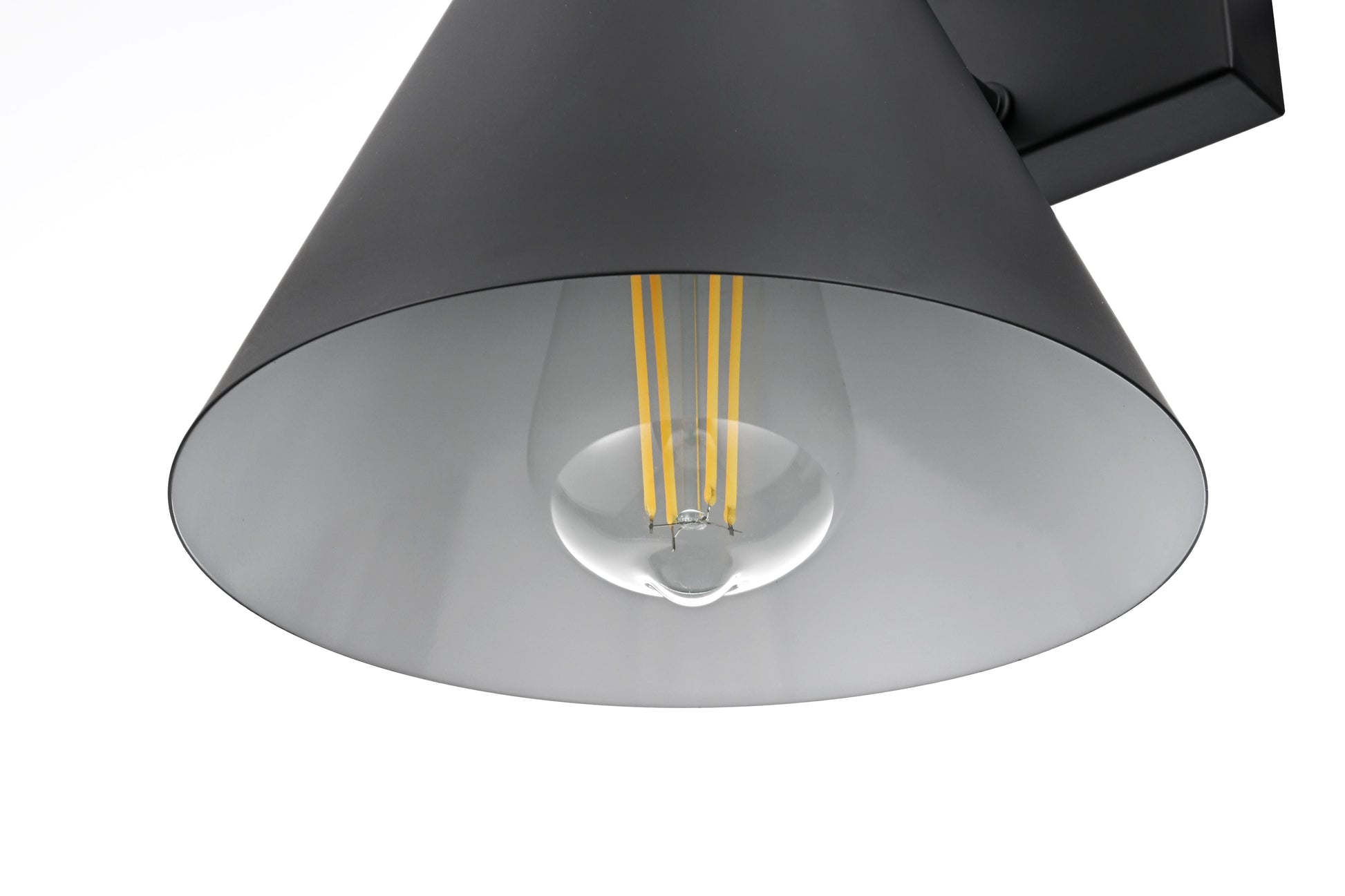 Transform any outdoor space with a statement wall light that blends sharp geometry with sleek modern appeal. A bold conical metal shade, finished in matte black, directs light downward for focused illumination, while the crisp white interior enhances brightness for a well-lit entryway or patio. A decorative ring detail adds a unique touch, softening the structured design and providing an artistic element. Supported by a sturdy squared backplate, this striking outdoor sconce maintains a strong architectural presence. The open-bottom shade ensures bright, practical lighting while making bulb replacements effortless. Designed with an E26 socket (bulb not included), this wet-rated fixture is built for durability, making it a stylish yet functional choice for porches, storefronts, and garage exteriors. Whether paired with an Edison bulb for a warm glow or a bright LED for crisp illumination, this standout piece elevates any outdoor setting with its sharp, modern aesthetic.