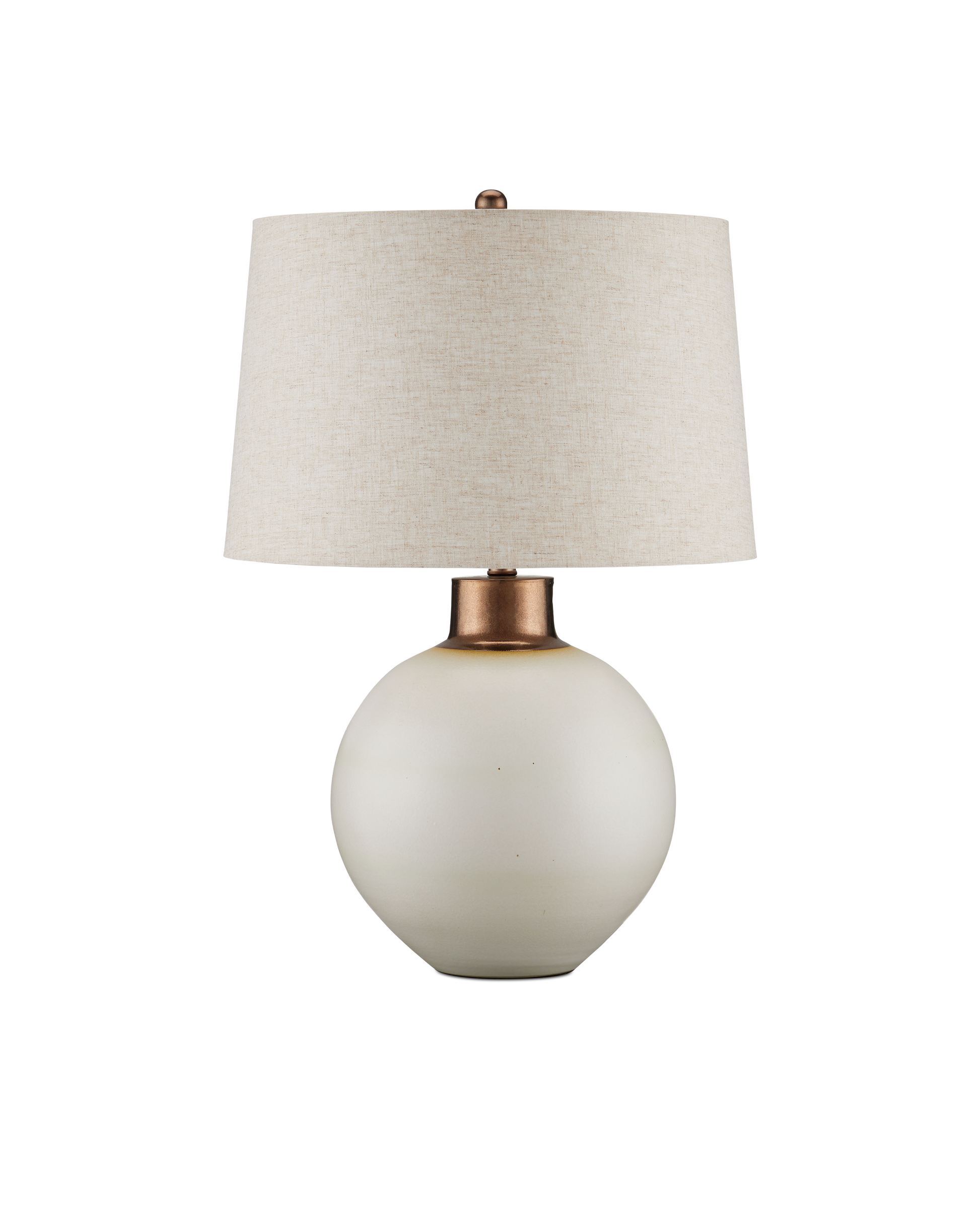 The Olano Table Lamp has a contemporary profile that is surprisingly warm given it is so sleek in shape. This is thanks to the metallic gold cap that seamlessly surrounds the top-most point of the off-white porcelain orb and the matching finial that holds the natural linen shade in place. The material from which this white lamp is made has a natural luminosity to it that makes its body glow when the lights are switched on.