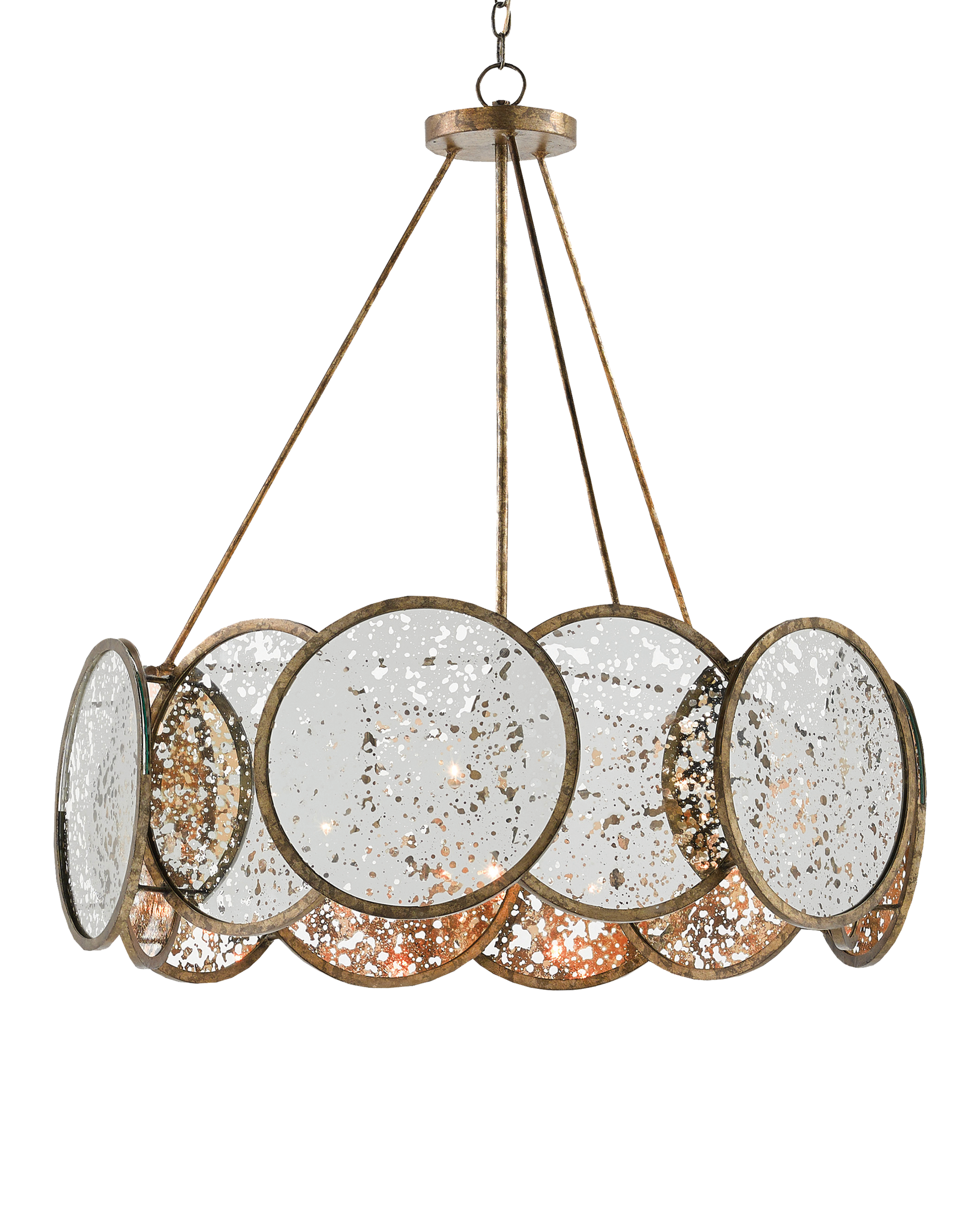 A ring of mirrored panels brings the Oliveri Chandelier an extra dose of luminosity. The circle of circles dangles from a canopy on thin bands of wrought iron in a Pyrite bronze finish. The distressing and the tones of the finish echo the darker patinas in the Raj mirror set within by the rounded metal frames of this mirrored chandelier. Adjustable from 42" to 111" with use of included chain/rod kit/cable. If your space calls for a longer drop, additional chain/rods/cable is available for purchase.