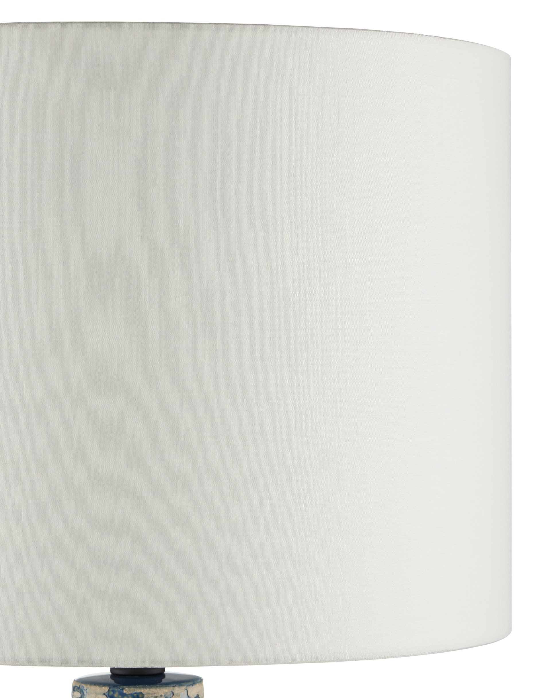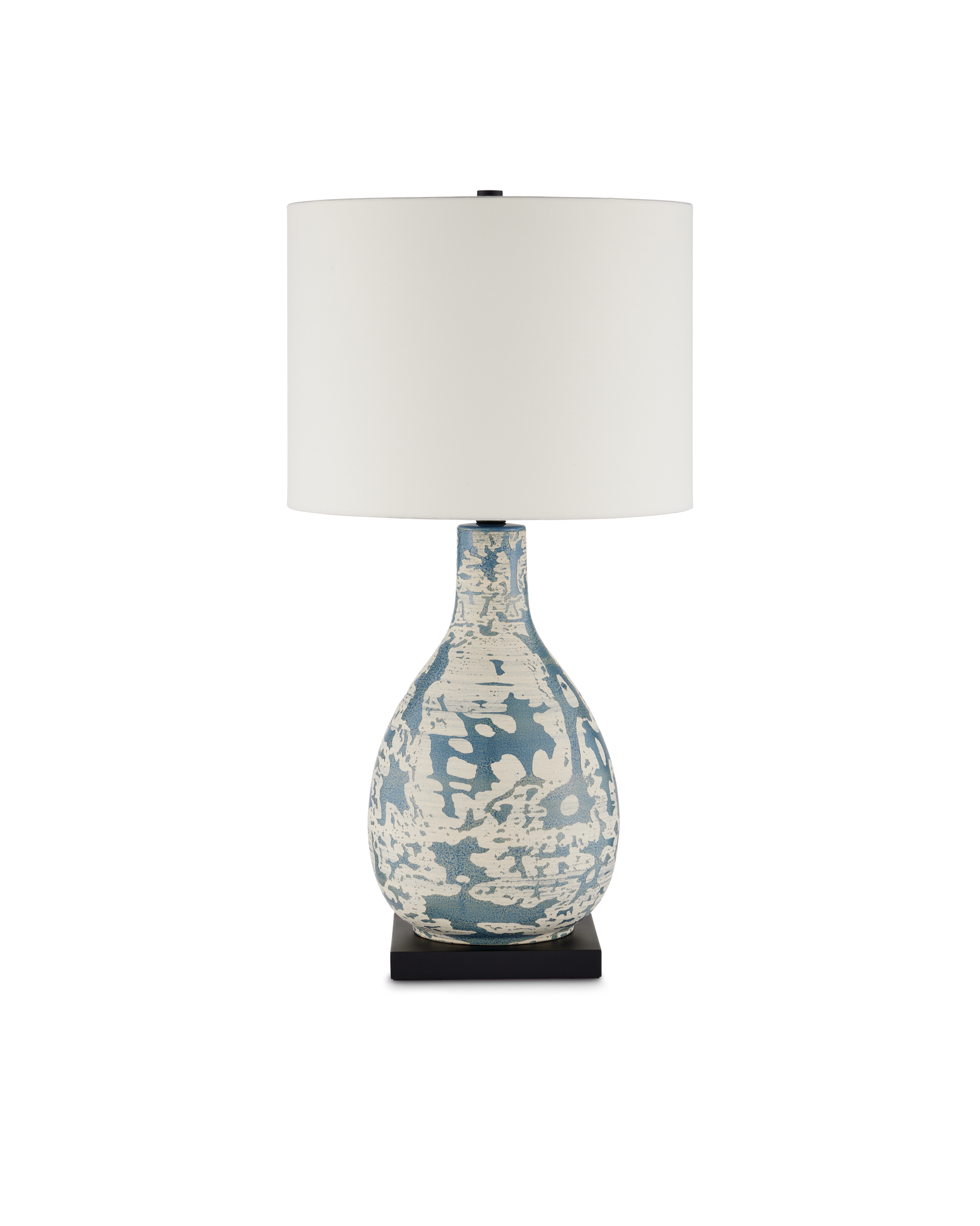 The Ostracon Table Lamp is made of ceramic with a gray and cream glazing that overlays a swirling blue pattern to give it depth. Sitting atop a black base, the blue table lamp is topped with an ivory shantung shade that echoes the creamy hues in its body.