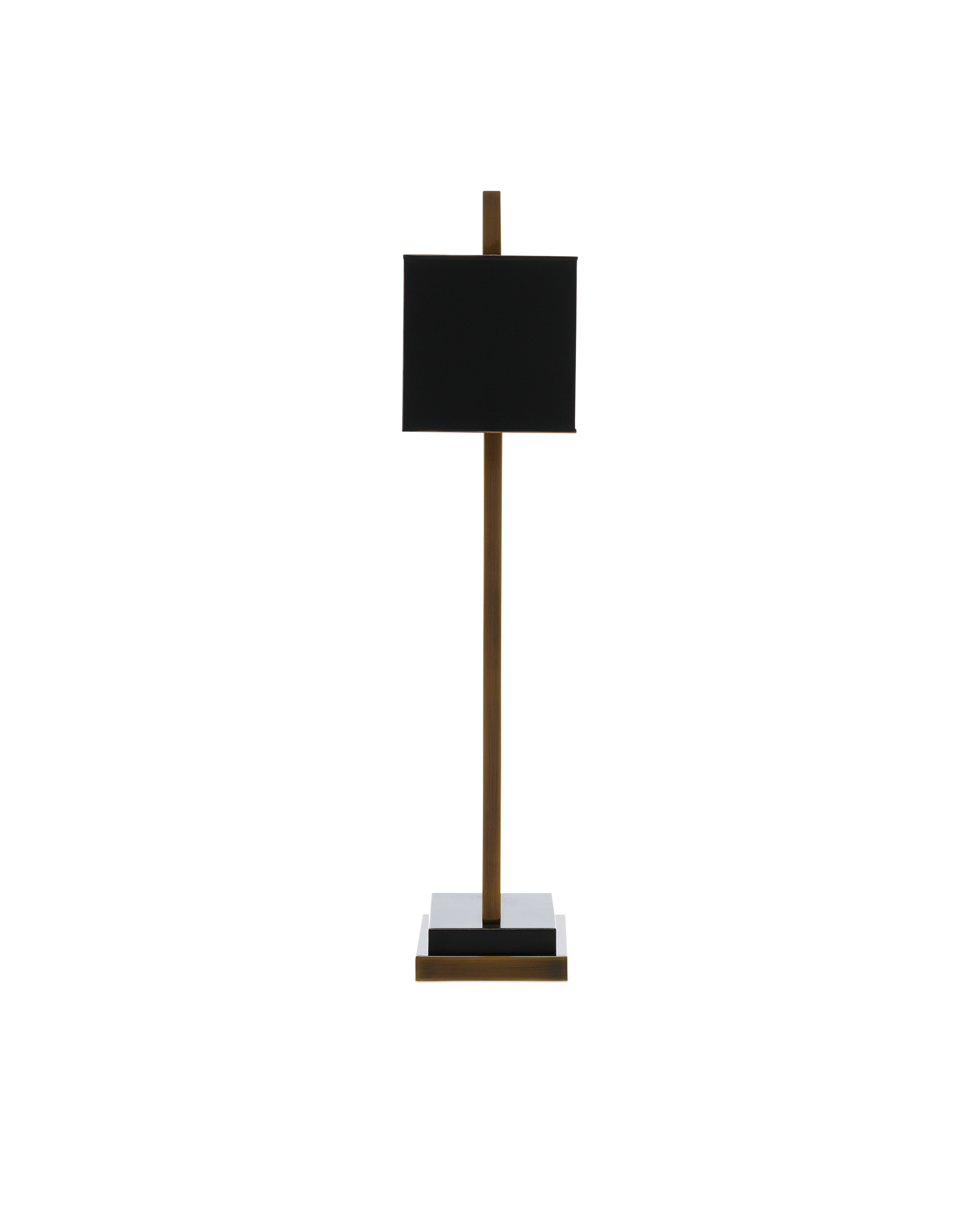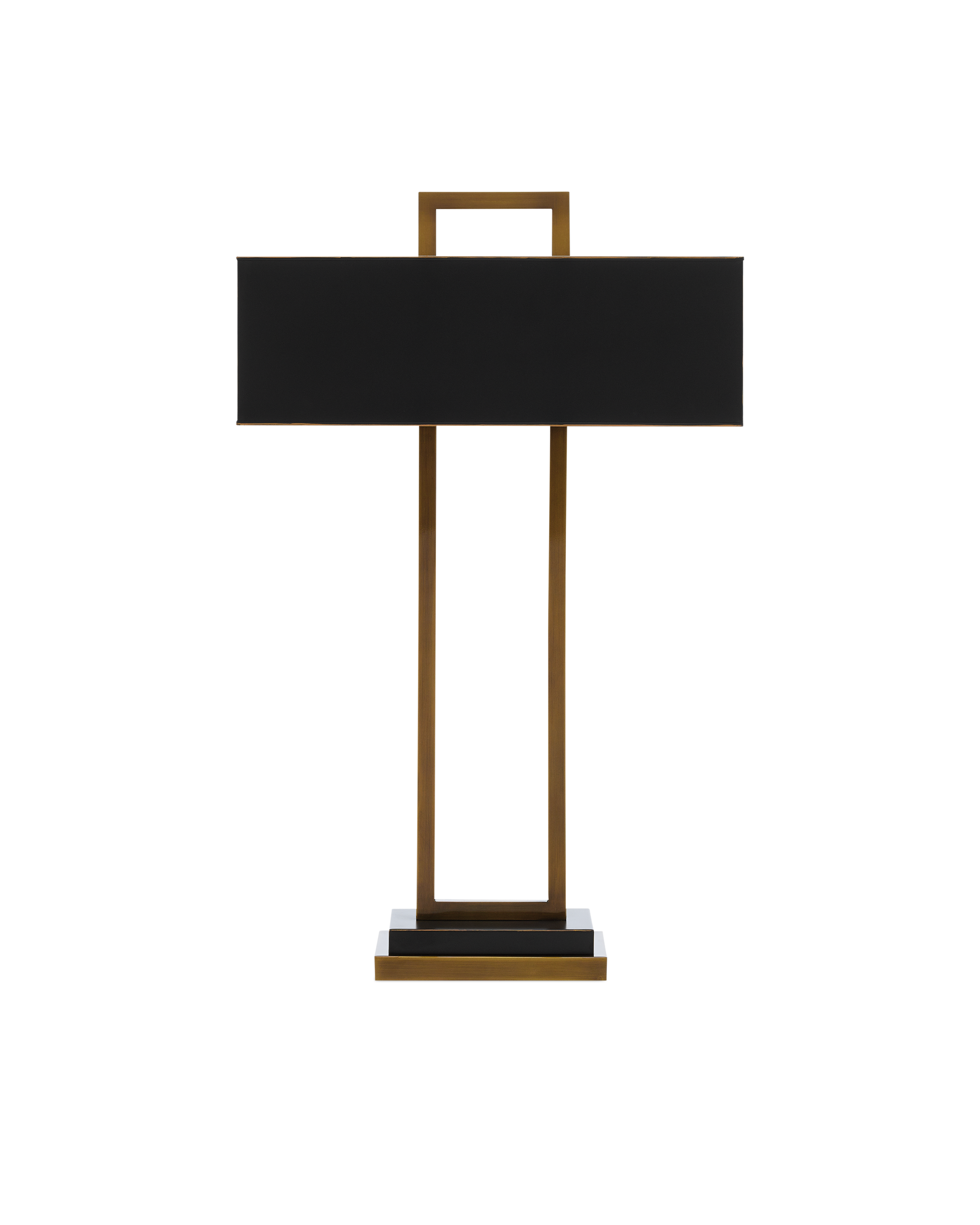The Otto Table Lamp is a study in rectangles with an intermingling of antique brass and oil-rubbed bronze finishes on the metal. Special features of the geometrically rich black lamp include its tailored profile and how carefully our designers chose the placement of the metal shade to form a counterpoint to the ribs of metal it intersects.