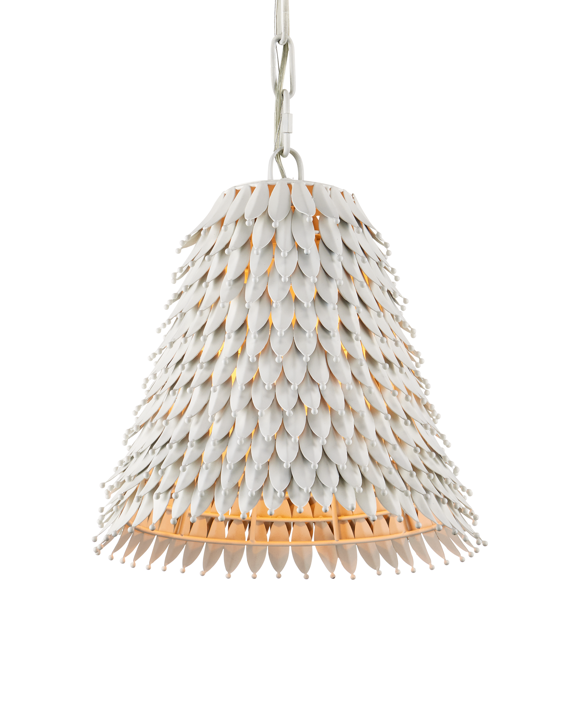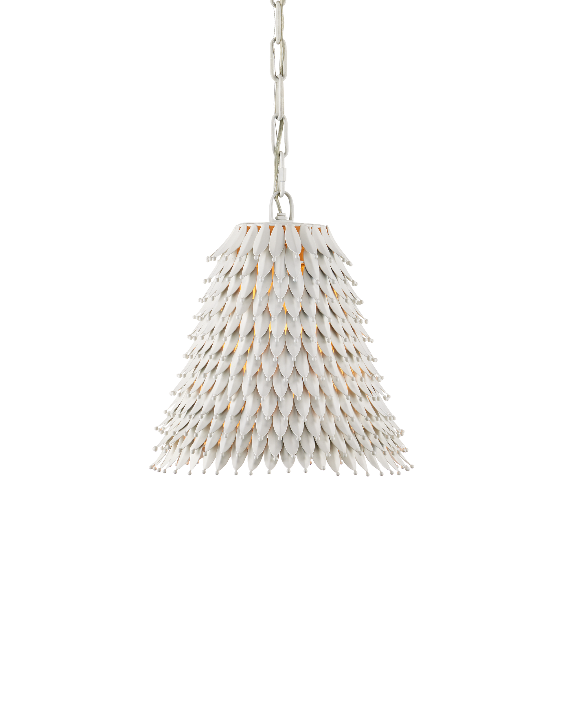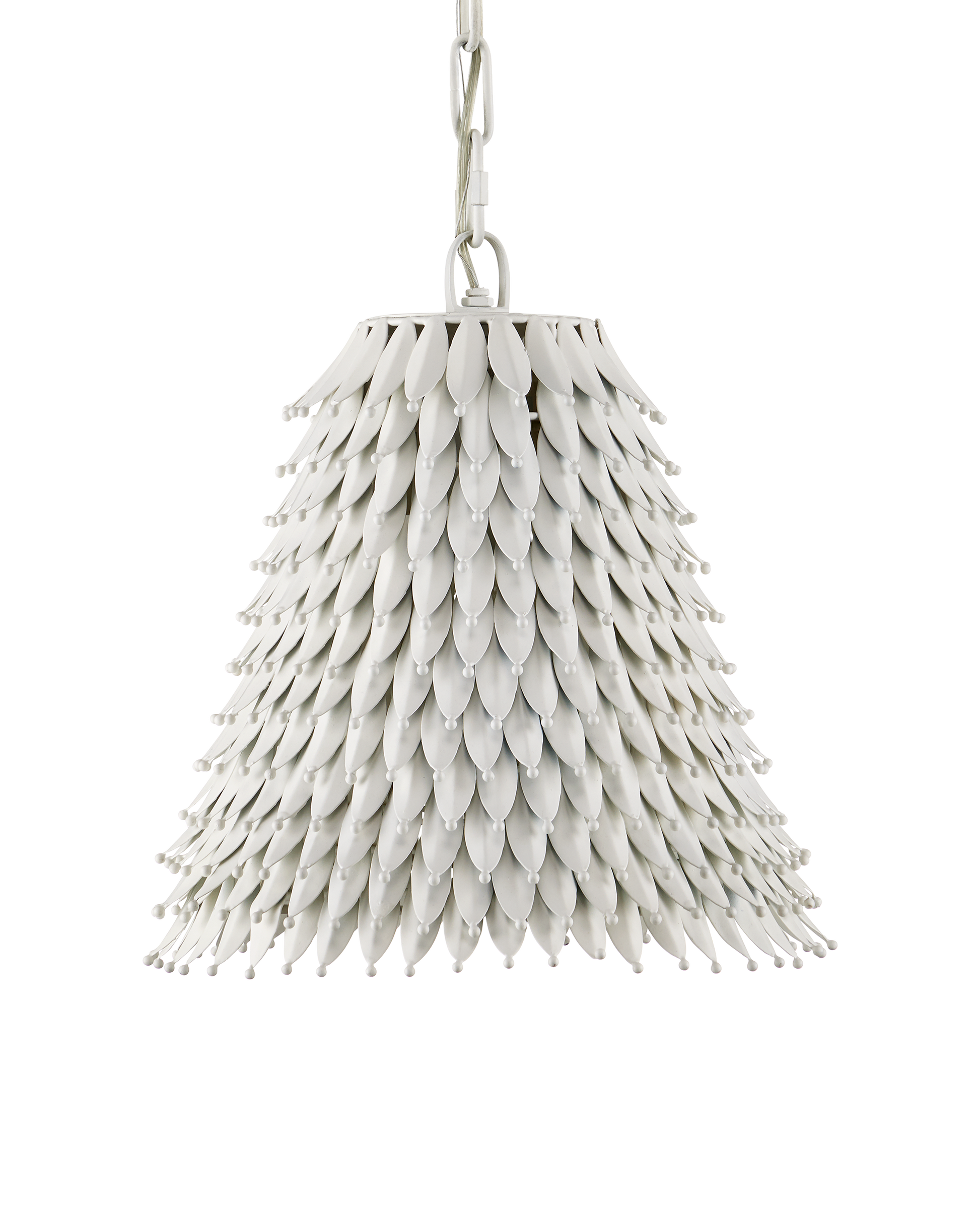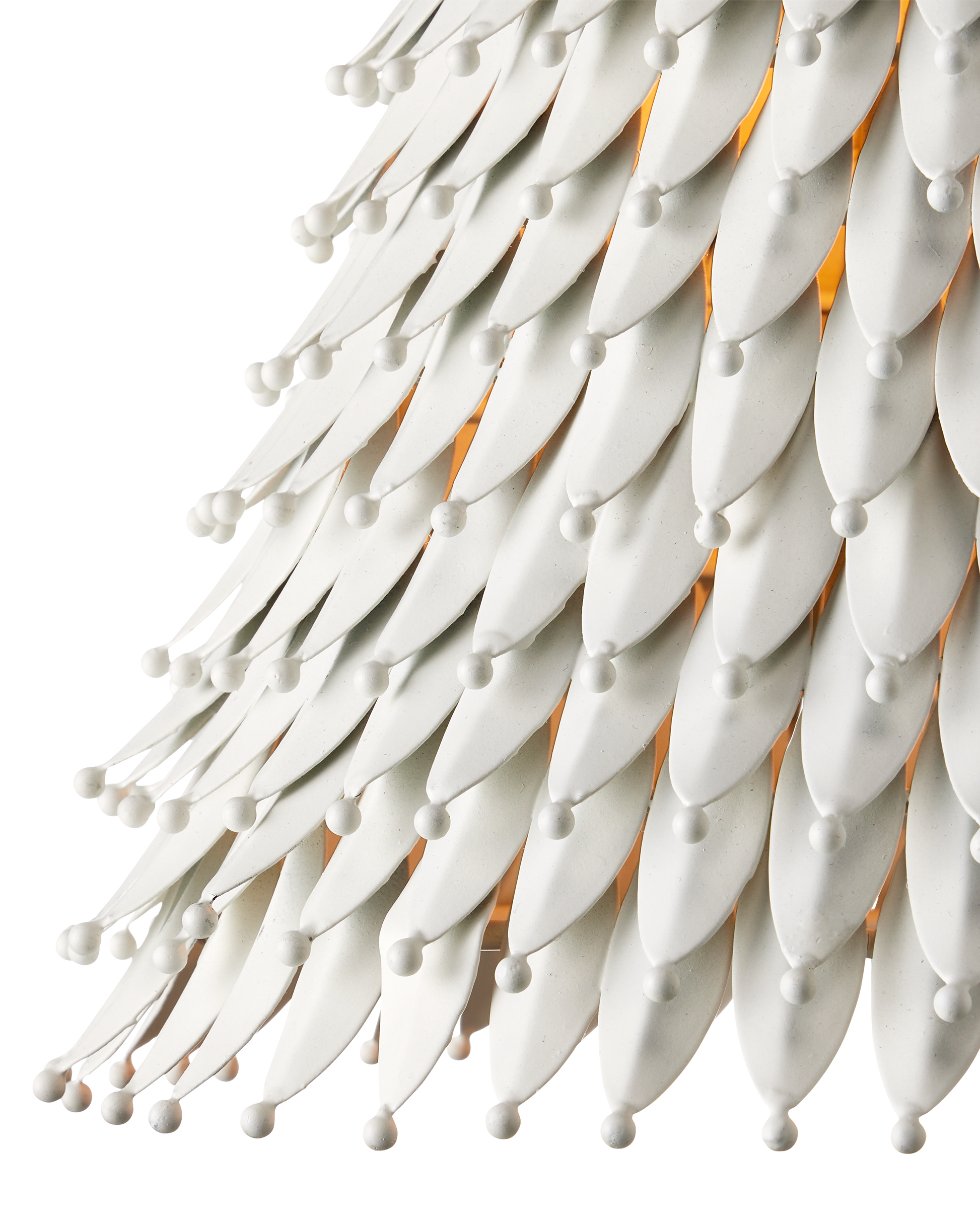 The Overlay Small Pendant is a artisanal creation that is painstakingly made by hand, as each of the leaves are individually cut and welded to the frame and the dots on the edges of the spiky cut-outs are welded on. The bell shape of the white pendant has a sartorial feel thanks to the textural richness of the fluted edges flowing downward like a couture wedding dress might. Adjustable from 19.5" to 87.5" with use of included chain/rod kit/cable. If your space calls for a longer drop, additional chain/rods/cable is available for purchase.