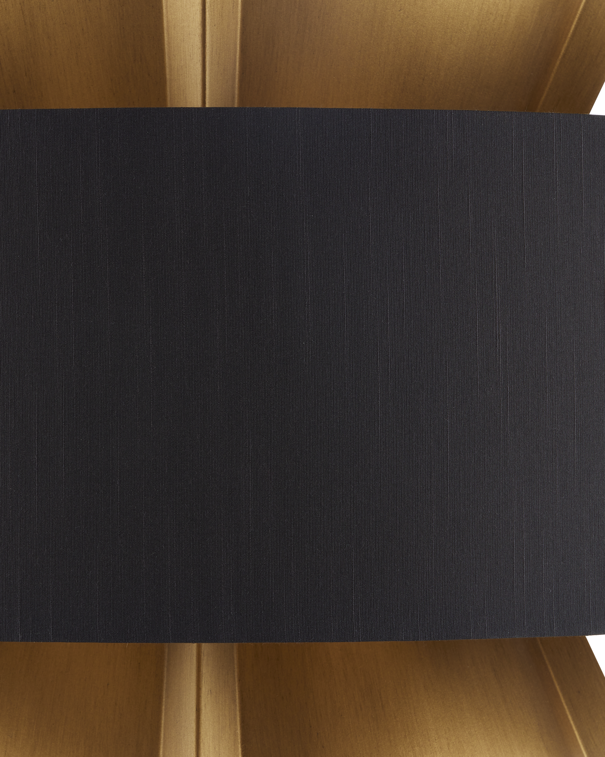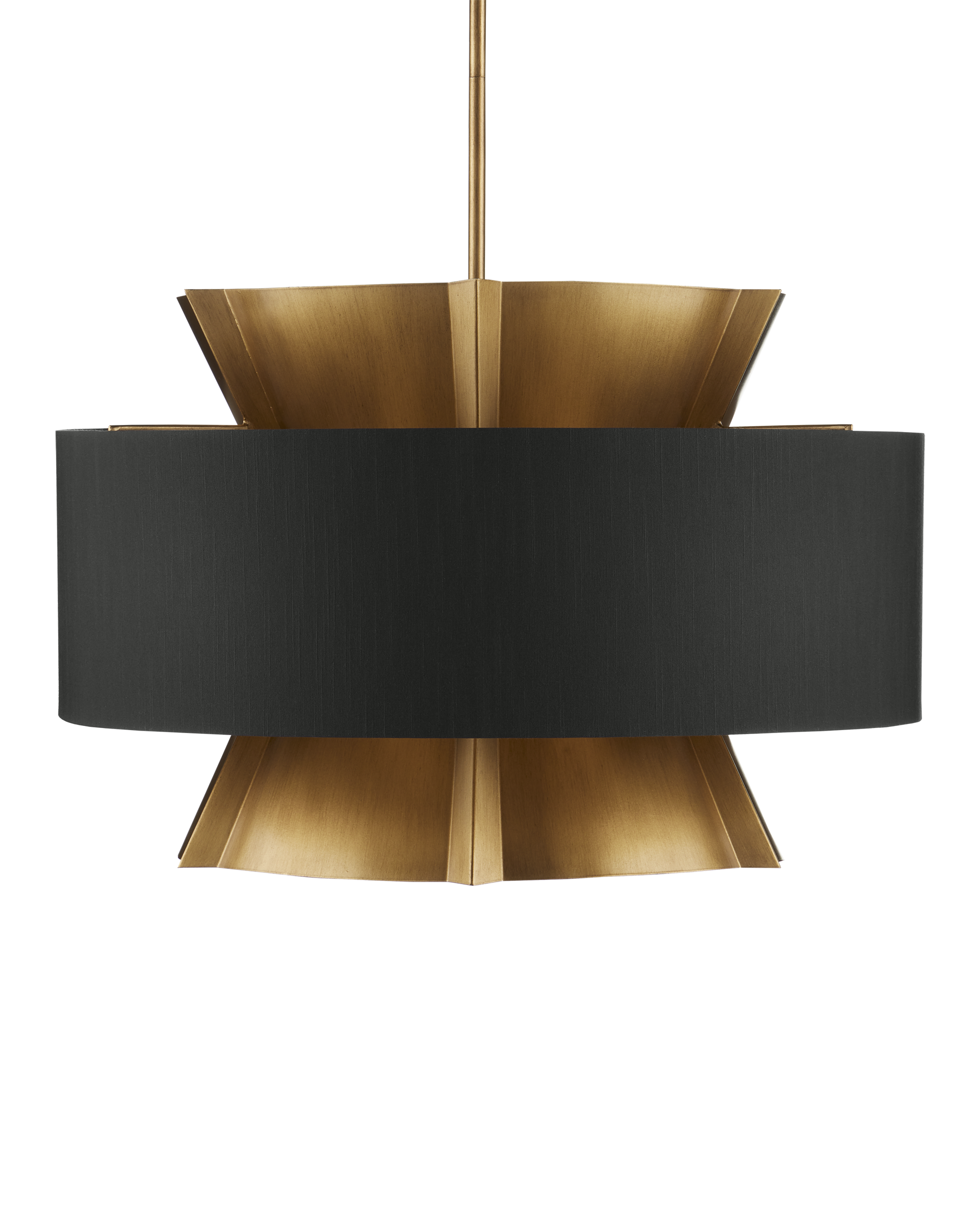 The Oxenwood Chandelier exhibits masculine attributes that will make it a powerful statement piece in a room, as well as a contrasting one. The black shantung shade that wraps artfully around the conjoined fluted metal shapes has a silver lining. Juxtaposed with the brass finish on the wrought-iron, the illumination reflects from both warm and cool surfaces to make the gold and black chandelier gleam. This fixture that will shine in transitional, traditional, mid-century modern, and contemporary interiors was designed by Clarence Mallari. Adjustable from 23" to 65" with use of included chain/rod kit/cable. If your space calls for a longer drop, additional chain/rods/cable is available for purchase.