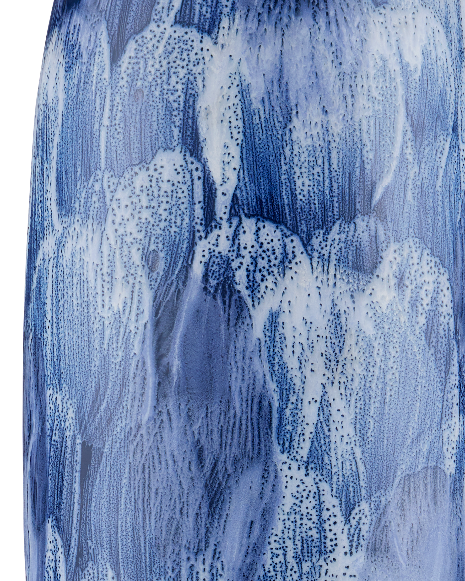 If the body of the Pallas Table Lamp was a canvas, it would be a true work of art because it has painterly brush strokes in white on blue flowing along its surface. Illustrating the handmade aspect of this particular fixture is the white glaze that bubbles where it is thickest over the luminous blue, giving the lamp greater texture. The intermingled smudges are layered onto the lamp to achieve added artfulness.
