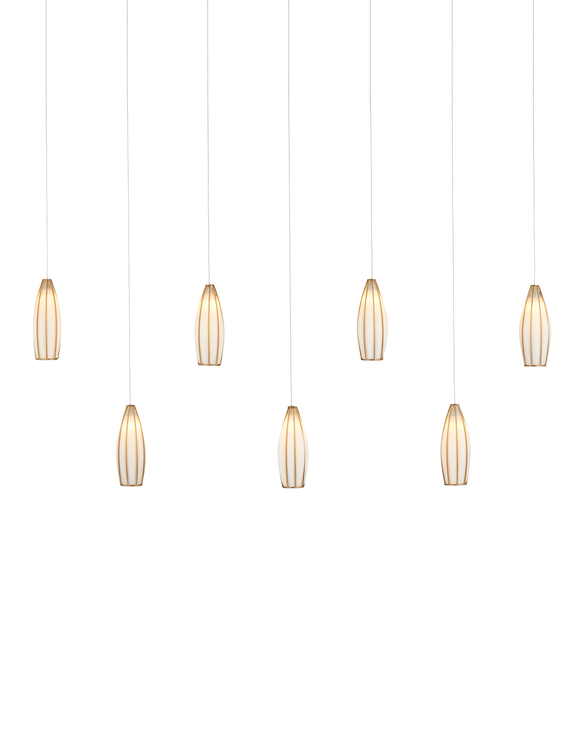 The Parish 7-Light Rectangular Multi-Drop Pendant has slender tear-drop-shaped shades made of white glass poured into a metal cage in an antique brass finish when it was still molten. A remarkable result of this process is that it creates tiny pinholes of light that escape through micro-bubbles that formed in the glass, making the Parish effervesce like an upside-down goblet of champagne.