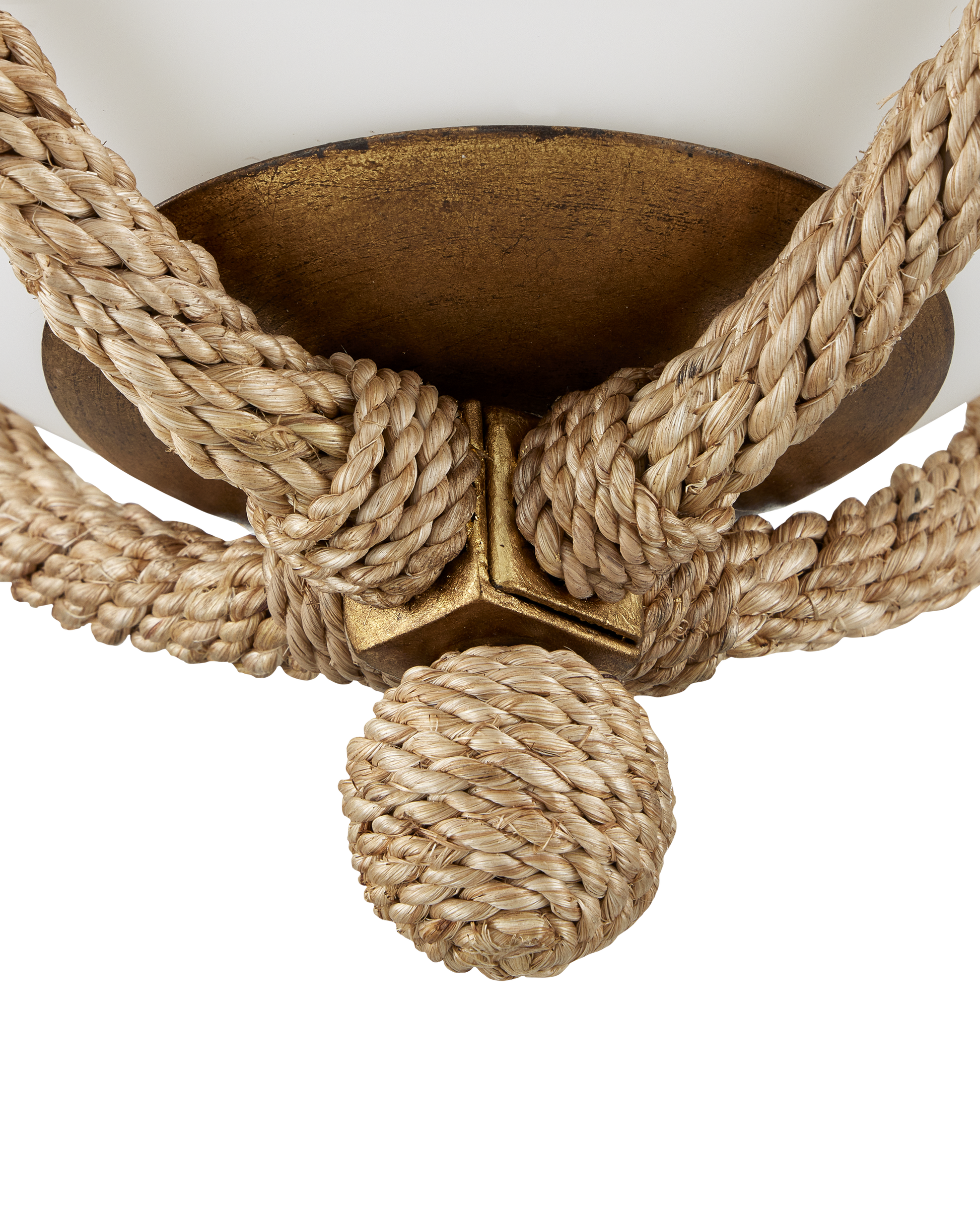 The Passageway Flush Mount is a cleverly designed rope-wrapped ceiling light by Clarence Mallari. The warmth of the rope combined with the dorado gold finish contrasts the frosted glass globe to bring this design heft. One of the arms that hold the globe in place is removable to make changing the bulbs on this brown ceiling light easy.