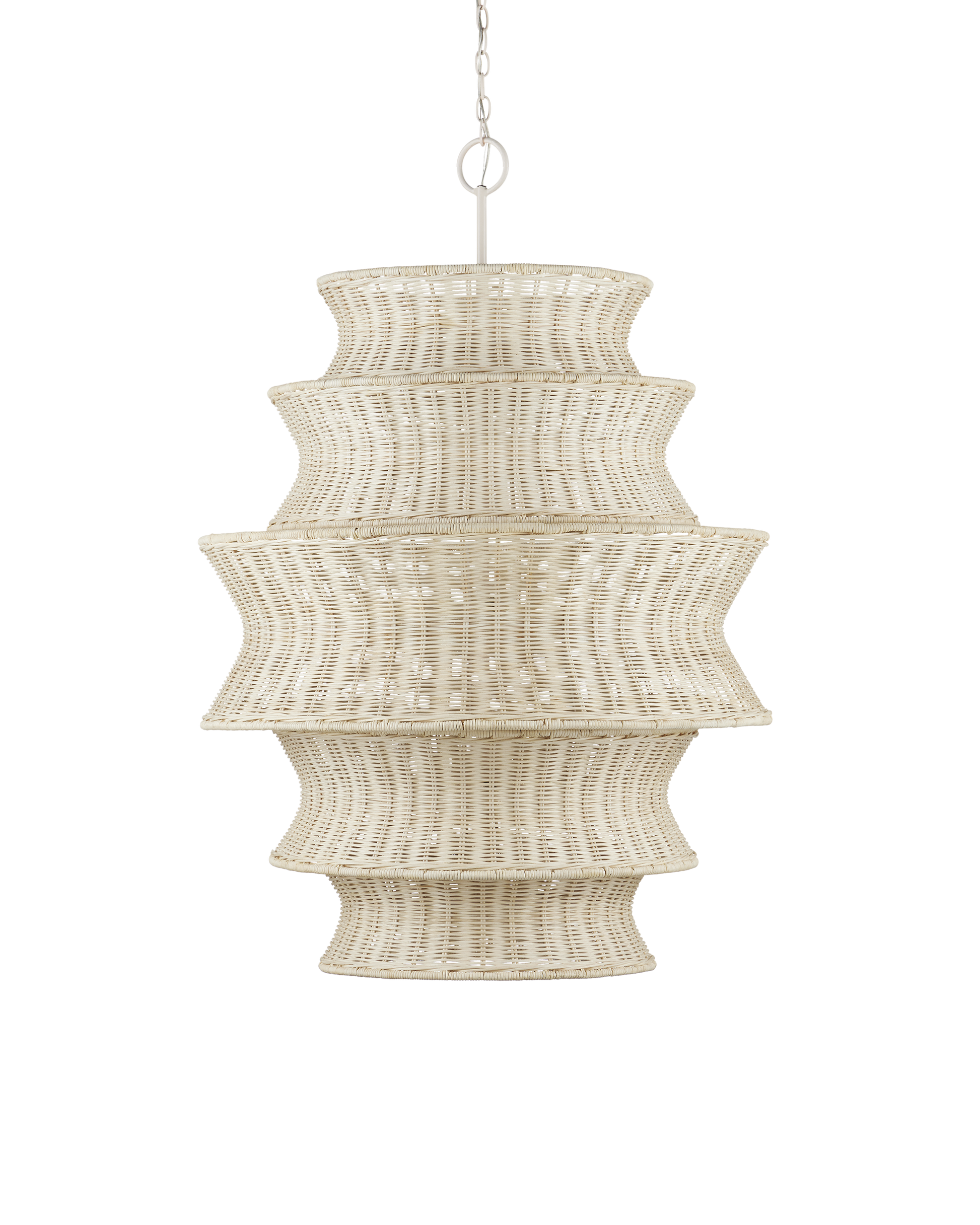 The Phebe Large Chandelier is a dynamic design by Clarence Mallari that showcases the talents of our weavers and his own skill at working with natural materials. The five-tier white chandelier has such a cohesive appearance because the circular wire frames are wrapped in the same material, then the entire fixture has been bleached. The vanilla finish of the hardware keeps the design light and airy. Clarence was inspired by a natural material story when he designed the Phebe. Adjustable from 51.5" to 119.5" with use of included chain/rod kit/cable. If your space calls for a longer drop, additional chain/rods/cable is available for purchase.