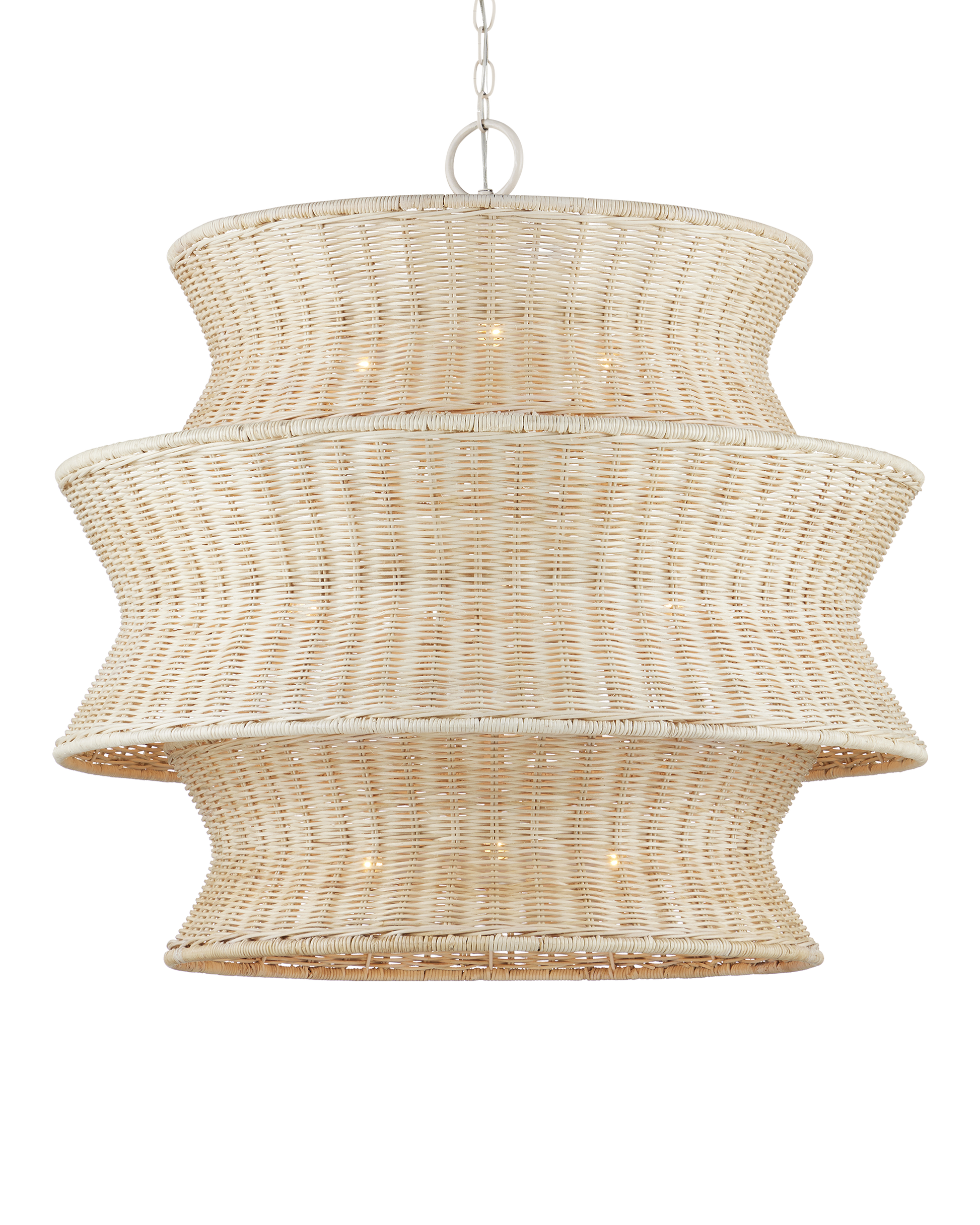 The Phebe Medium Chandelier is a dynamic design by Clarence Mallari that showcases the talents of our weavers and his own skill at working with natural materials. The three-tier white chandelier has such a cohesive appearance because the circular wire frames are wrapped in the same material, then the entire fixture has been bleached. The vanilla finish of the hardware keeps the design light and airy. Clarence was inspired by a natural material story when he designed the Phebe. Adjustable from 38.5" to 106.5" with use of included chain/rod kit/cable. If your space calls for a longer drop, additional chain/rods/cable is available for purchase.