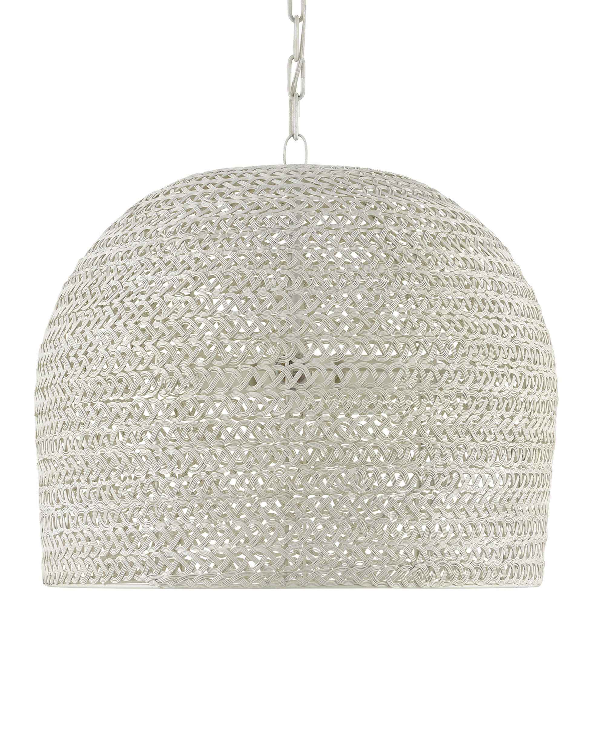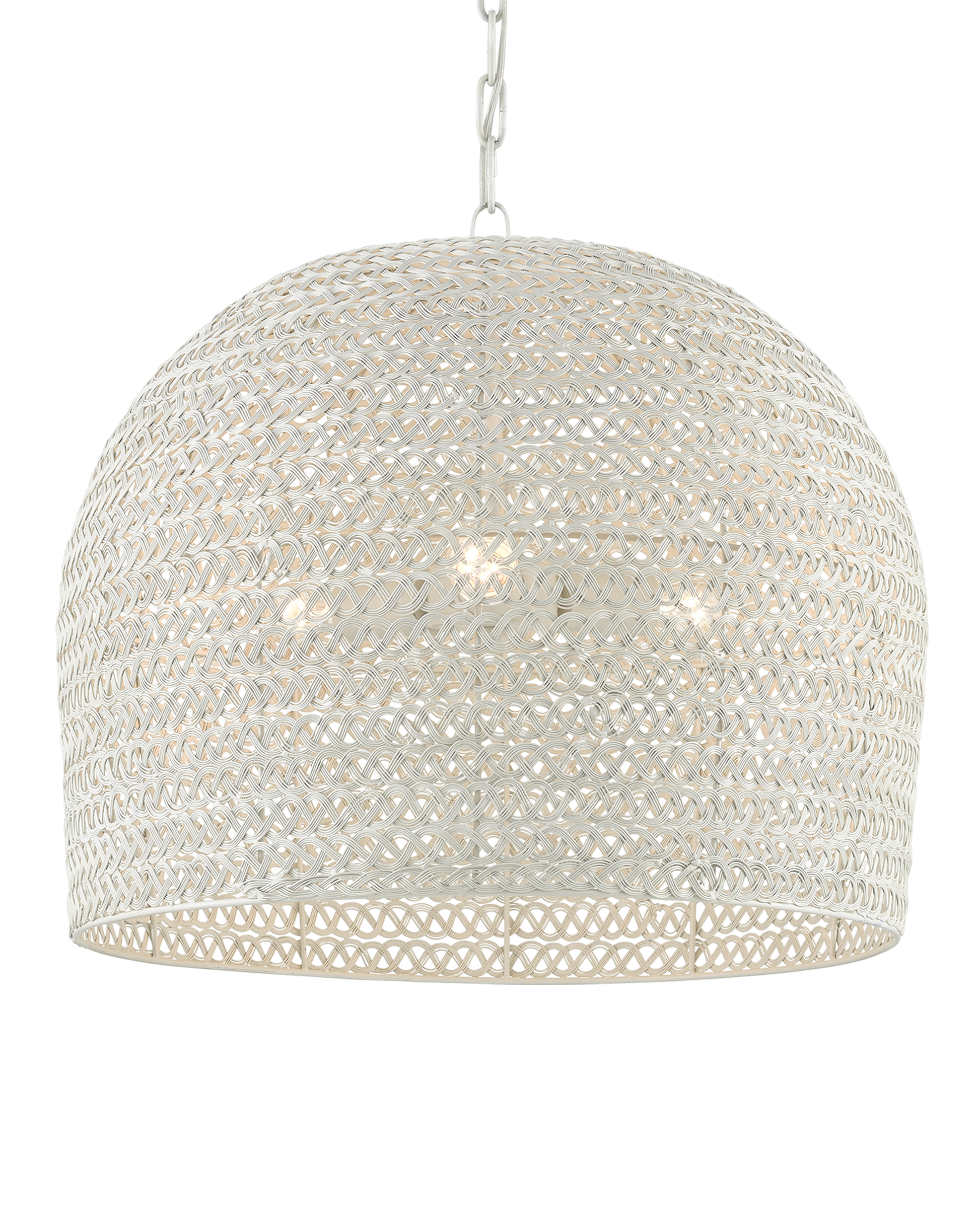 The Piero White Medium Chandelier may appear to be woven from a natural plant material, but it is made of iron in a white finish to make it one of our offerings that illustrates the skills our craftspeople bring to their work. When the white chandelier is illuminated, textural patterns will enliven surrounding surfaces. Adjustable from 25.75" to 94" with use of included chain/rod kit/cable. If your space calls for a longer drop, additional chain/rods/cable is available for purchase.