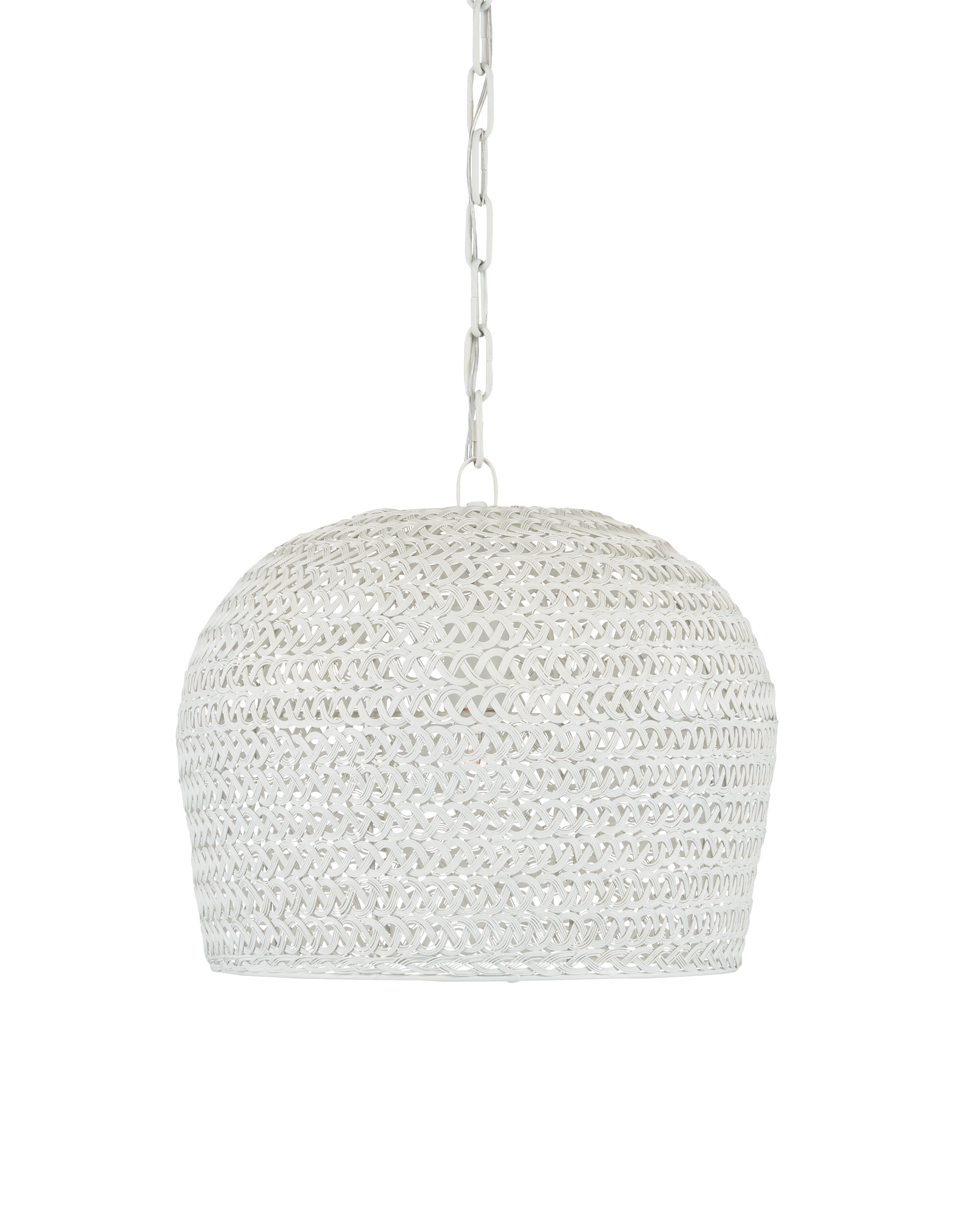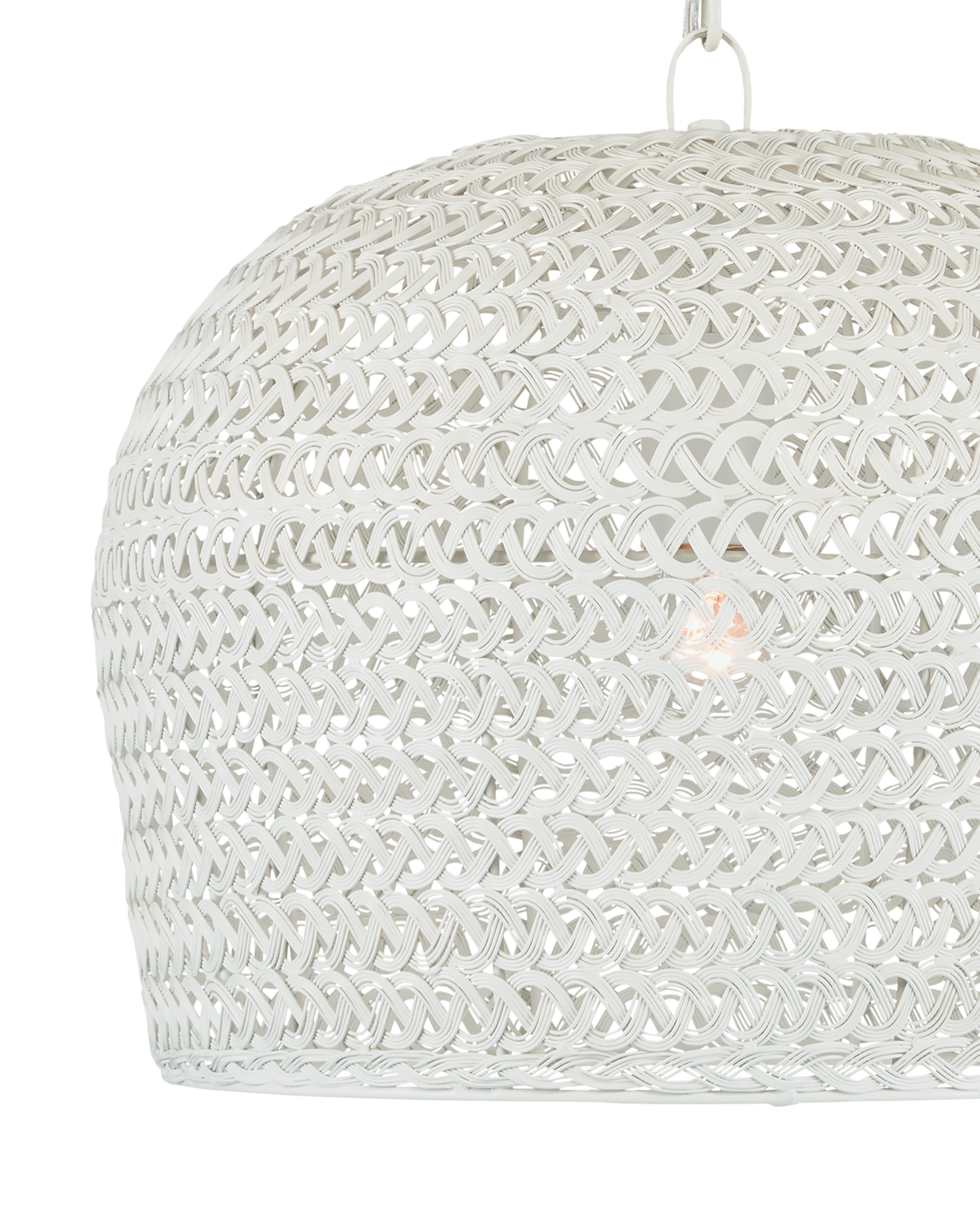 The Piero White Pendant may appear to be woven from a natural plant material, but it is made of iron in a white finish to make it one of our offerings that illustrates the skills that our craftspeople bring to their work. When the white pendant is illuminated, textural patterns will enliven surrounding surfaces. Adjustable from 20" to 88" with use of included chain/rod kit/cable. If your space calls for a longer drop, additional chain/rods/cable is available for purchase.