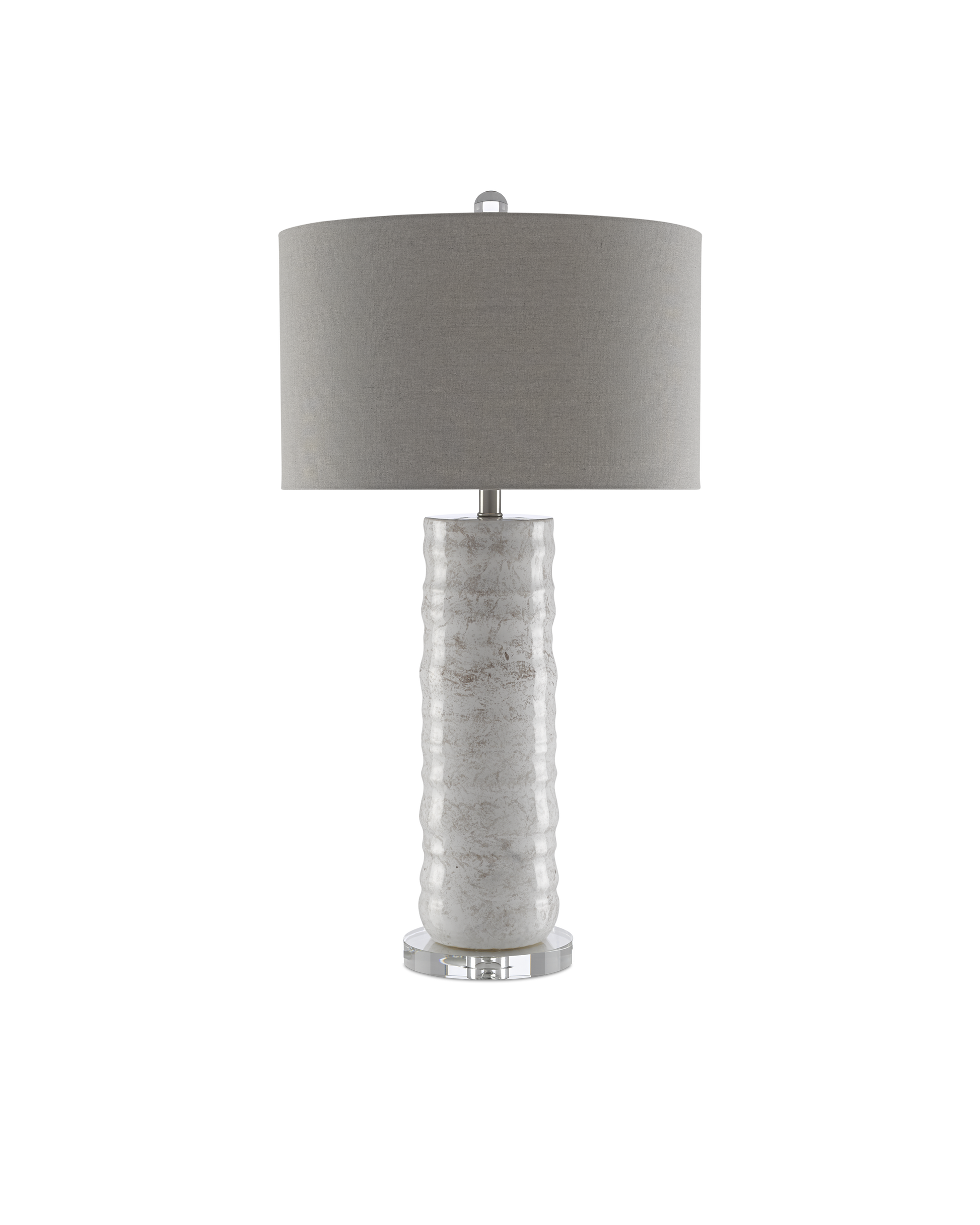 The treatment on the ceramic body of the Pila Table Lamp is a painterly technique that makes the ivory and taupe patterns resemble stone. Sitting atop an optic crystal base, the white lamp has a lovely oversized gray linen barrel shade fastened in place with an optic crystal finial.