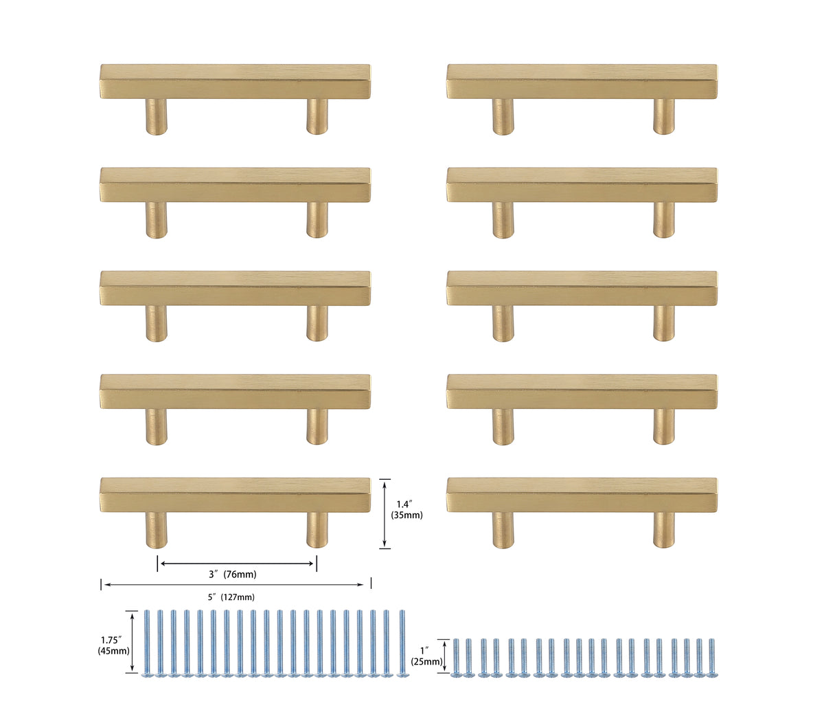 The stunning bar pulls are an instant dramatic upgrade to any kitchen, bathroom, or furniture. They are easy to install and provides a bold statement to your furniture. Each of the hardware conveniently comes with two sets of mounting screws to save your time and trip to the hardware store. The ten pack hardware is packaged individually to protect scratches of your timeless investment during shipping.