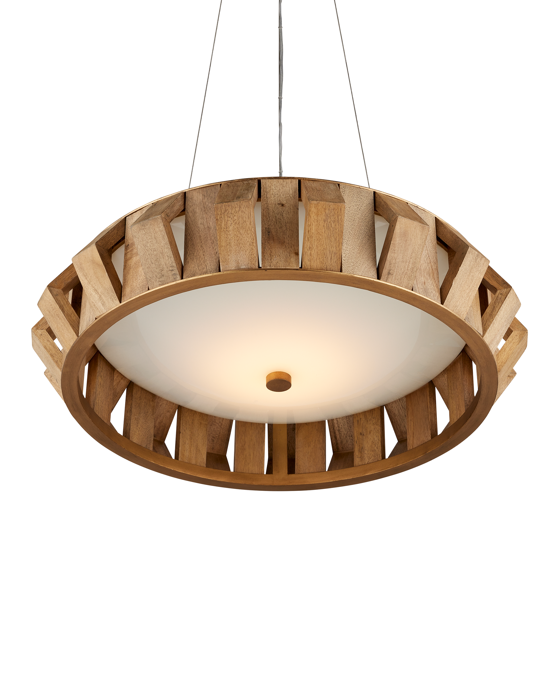 The thick wood slats that make up the shade of the Plunge Chandelier bring the brown pendant a mid-century modern vibe with a hint of brutalist style. Fastened to wrought iron rings in a brass finish, the slanting wood is finished in toffee, the combination creating great warmth. The varying placement of the angled wood pieces is a design detail of note, as is the fact that it is hung from aircraft cable. Integrated LED technology illuminates this fixture. Adjustable from 19.5" to 146" with use of included chain/rod kit/cable. If your space calls for a longer drop, additional chain/rods/cable is available for purchase.