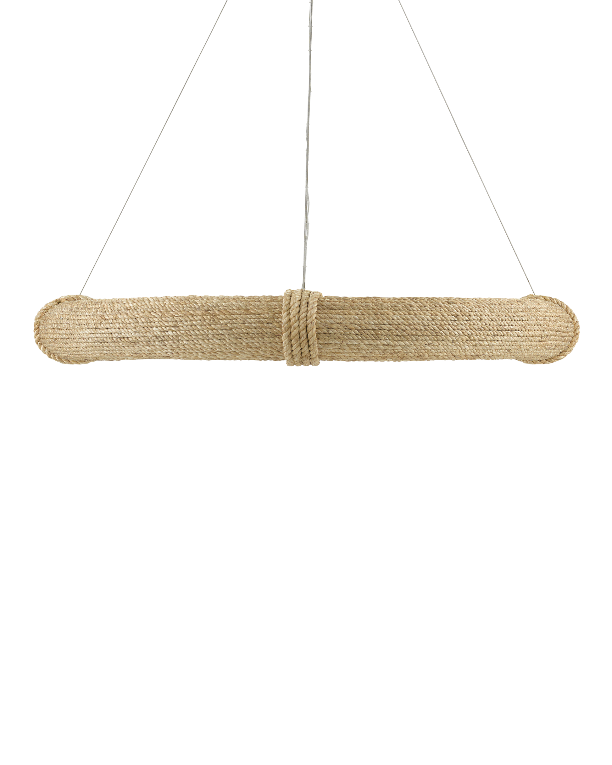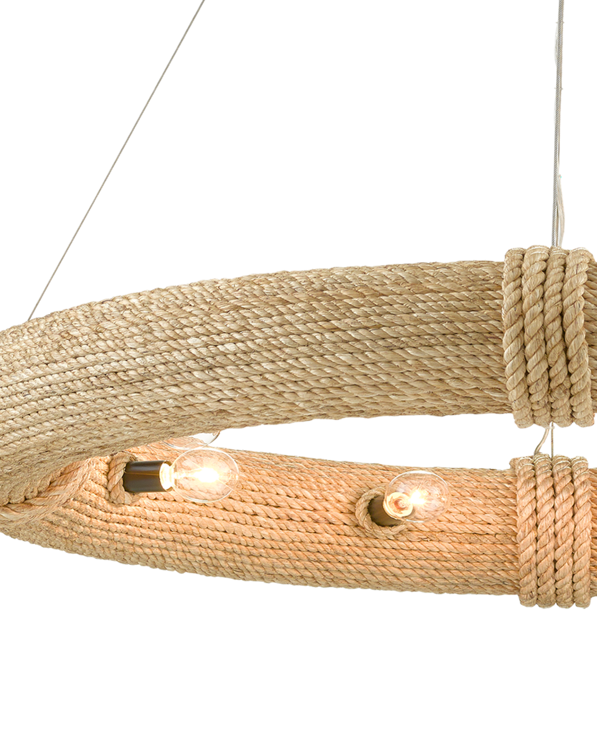 During the pandemic, movies were one of Clarence Mallari's sources for inspiration: "I became fascinated with the shape and function of a lifebuoy and wondered how I could translate it into lighting. It took me some time to come out with the design due to the fact that it was challenging to conceive and arduous to make." The frame on this Portmeirion Chandelier is made of wrought iron around which abaca rope has been wrapped for the nautical feel that inspired it. This small version of the Portmeirion has 6 lights, while the larger version has 12 lights, both of which are suspended on an aircraft cable to make the fixtures seem like they are floating in the sea. Adjustable from 23.00" to 125" with use of included chain/rod kit/cable. If your space calls for a longer drop, additional chain/rods/cable is available for purchase.