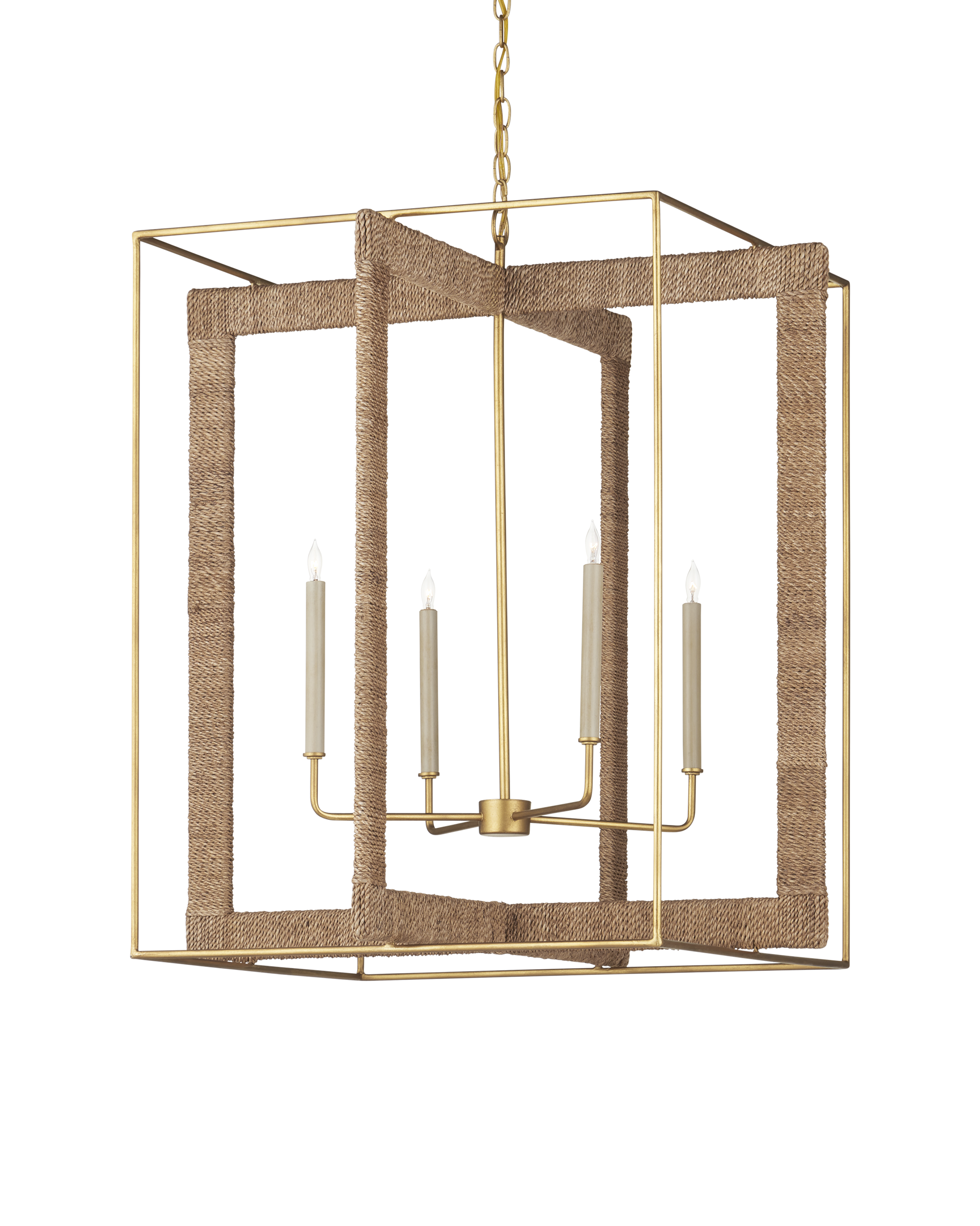 Design notes that make the Purebred Chandelier special are its modern boxy shapes, its thin metal bands in a contemporary gold leaf finish that contrast wider ones wrapped in Abaca rope, and the care with which the rope has been painstakingly wrapped around the metal.
