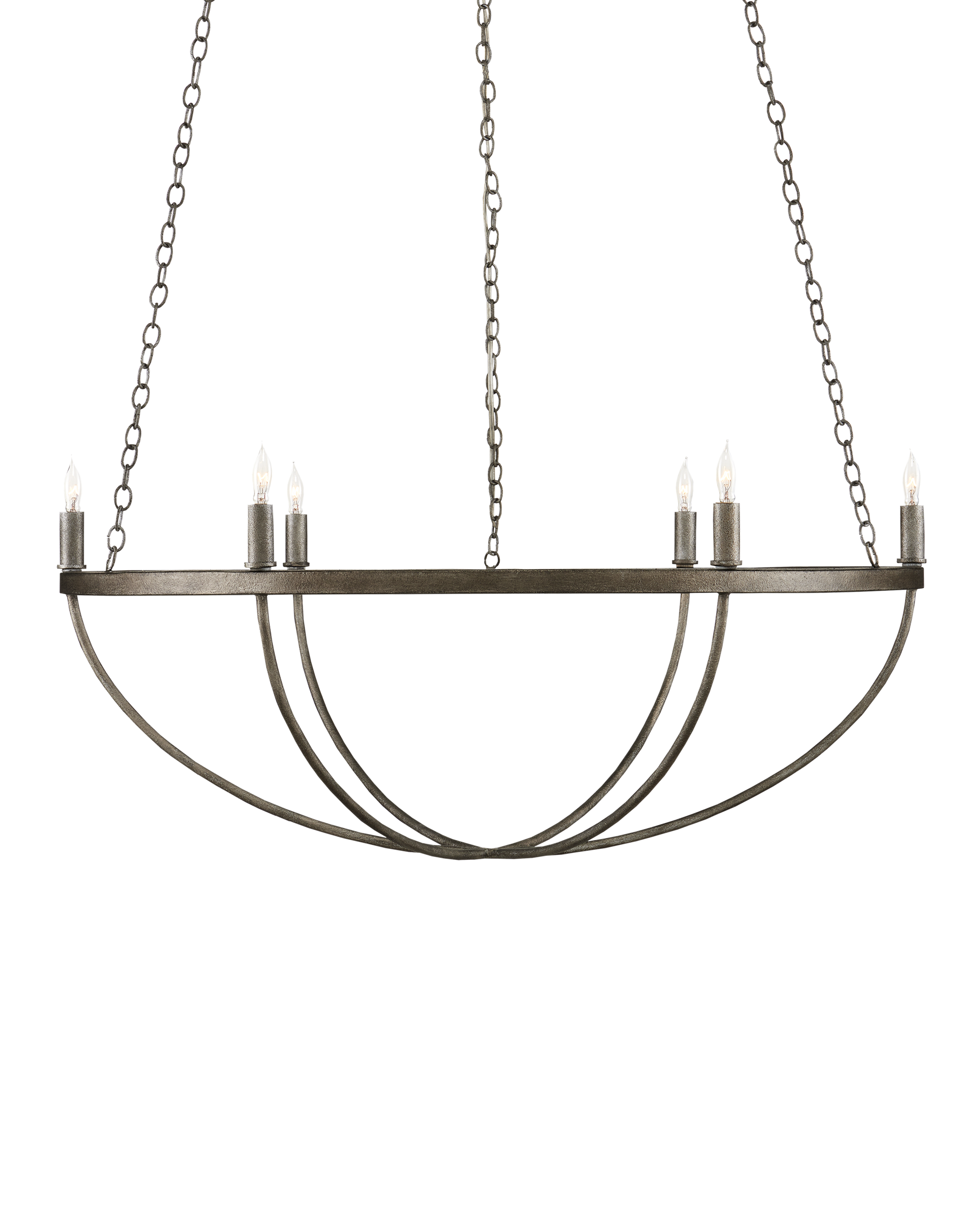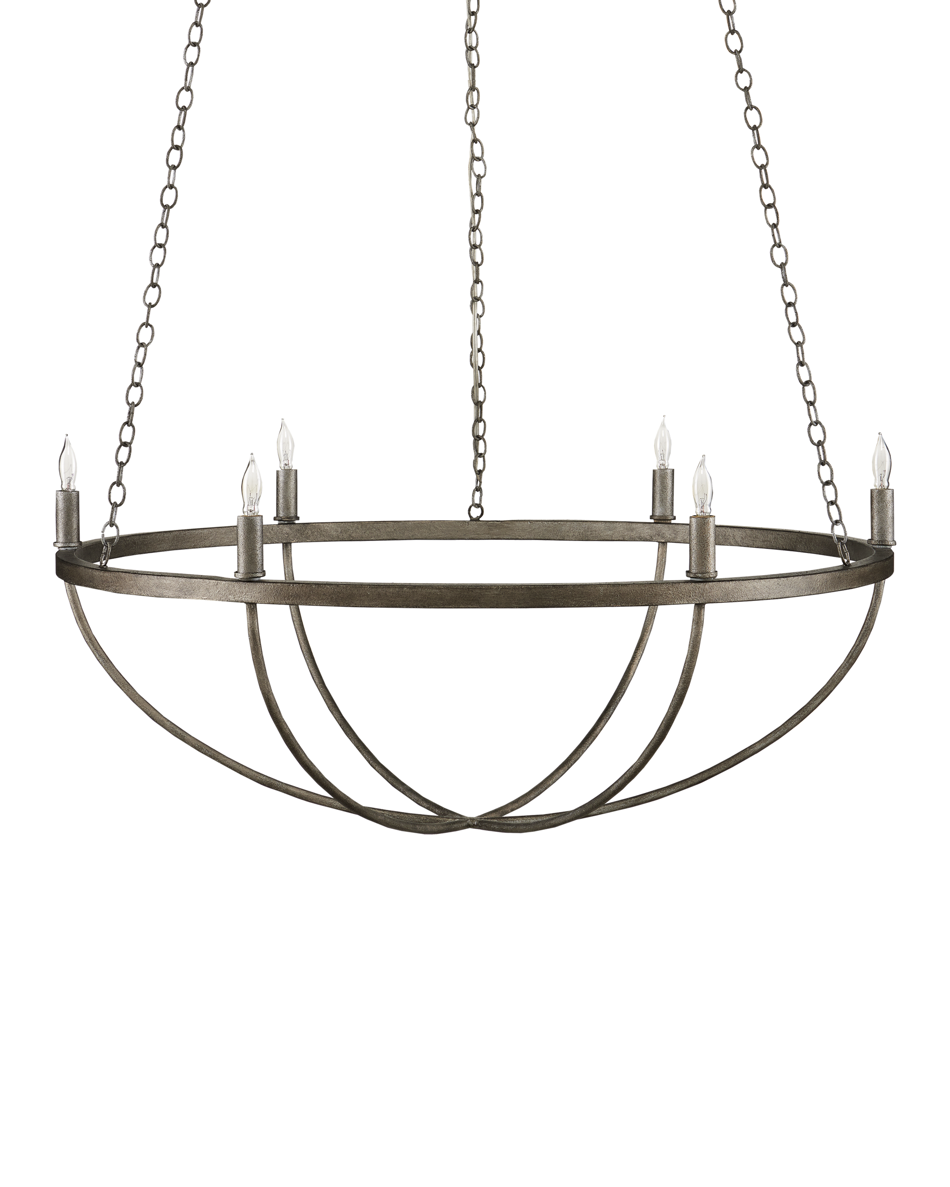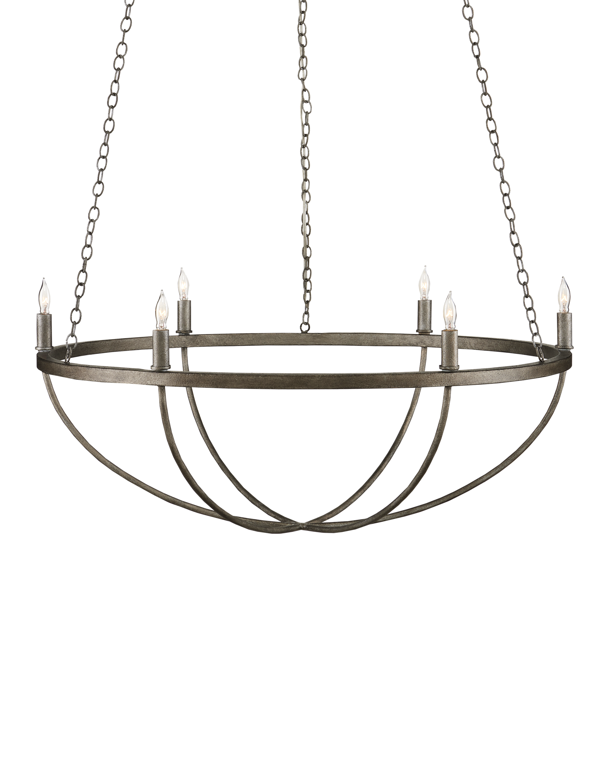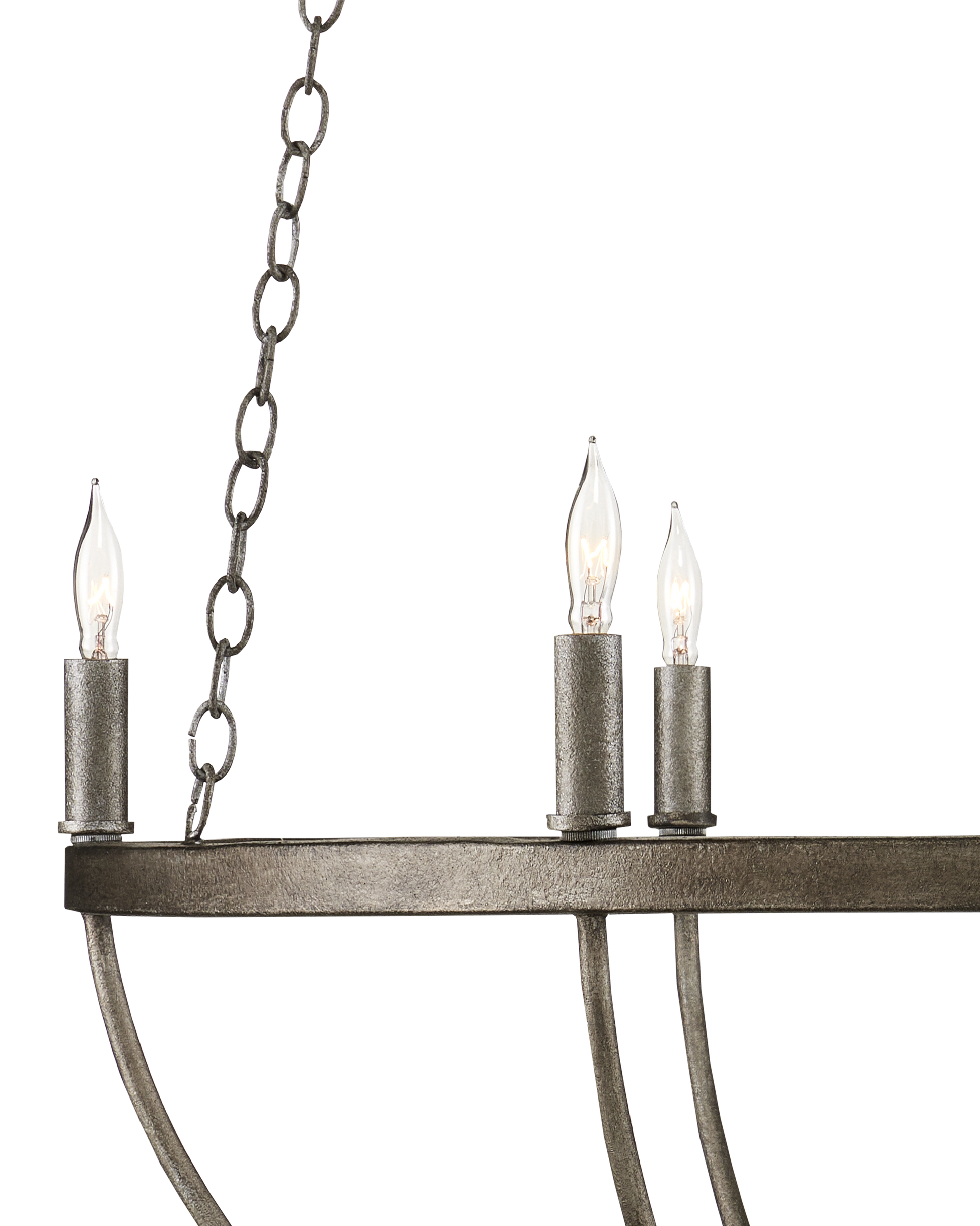 Tom Caldwell designed the Quillian Chandelier that is a modern take on a Medieval design, his inspiration candelabras that would have hung in old English castles. He modernized the profile of the gray chandelier by hanging it from small chain and adding a light mole finish to the metal. A design detail of note is the texture on the finish of the steel chandelier. Adjustable from 30" to 80" with use of included chain/rod kit/cable. If your space calls for a longer drop, additional chain/rods/cable is available for purchase.