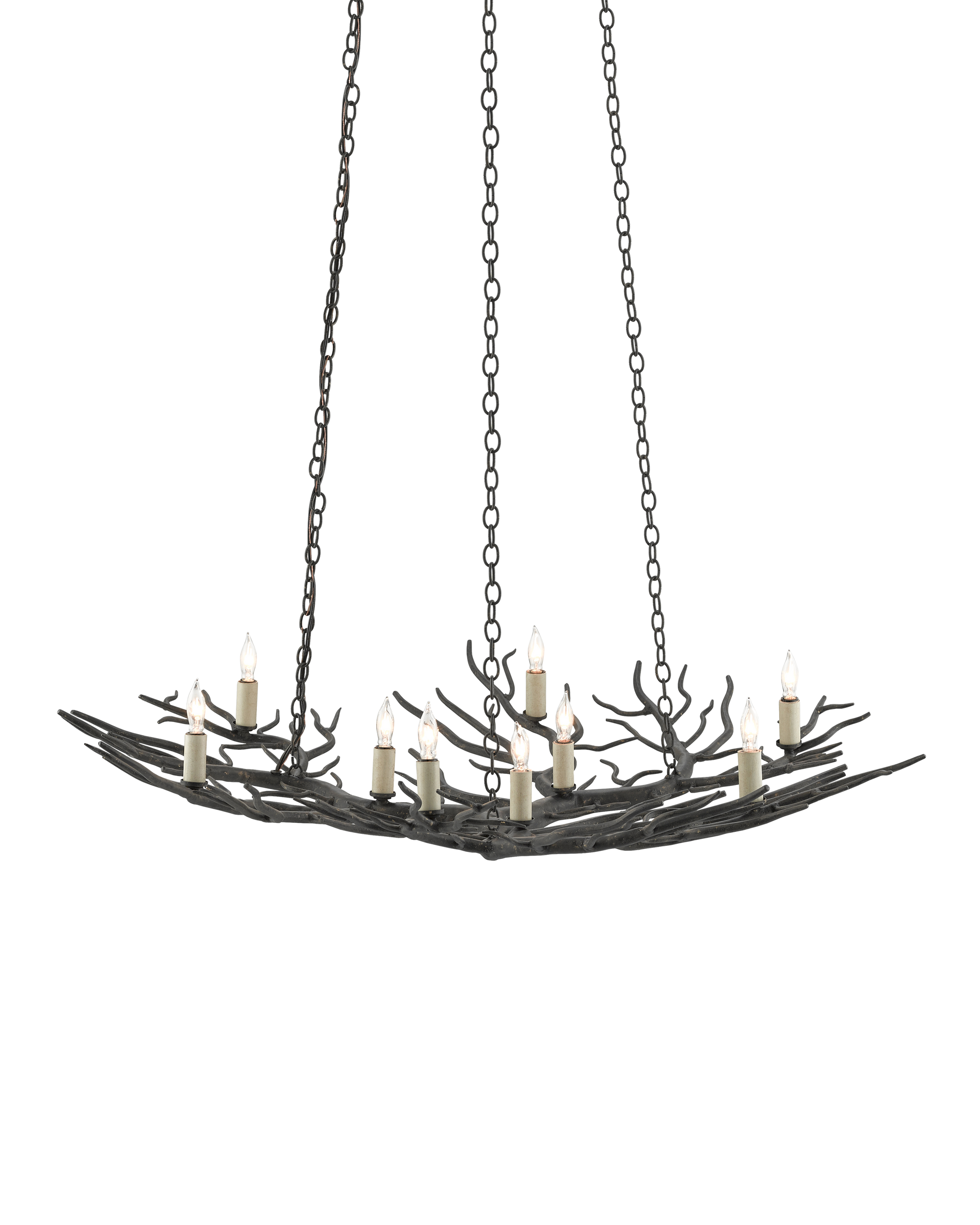 The Rainforest Bronze Small Chandelier has fourteen lights nestled within the hand-forged wrought iron shade of this fixture. The limbs, in a rustic bronze finish, are life-like as they cup the bulbs placed so skillfully on them. Adjustable from 16.5" to 76" with use of included chain/rod kit/cable. If your space calls for a longer drop, additional chain/rods/cable is available for purchase.