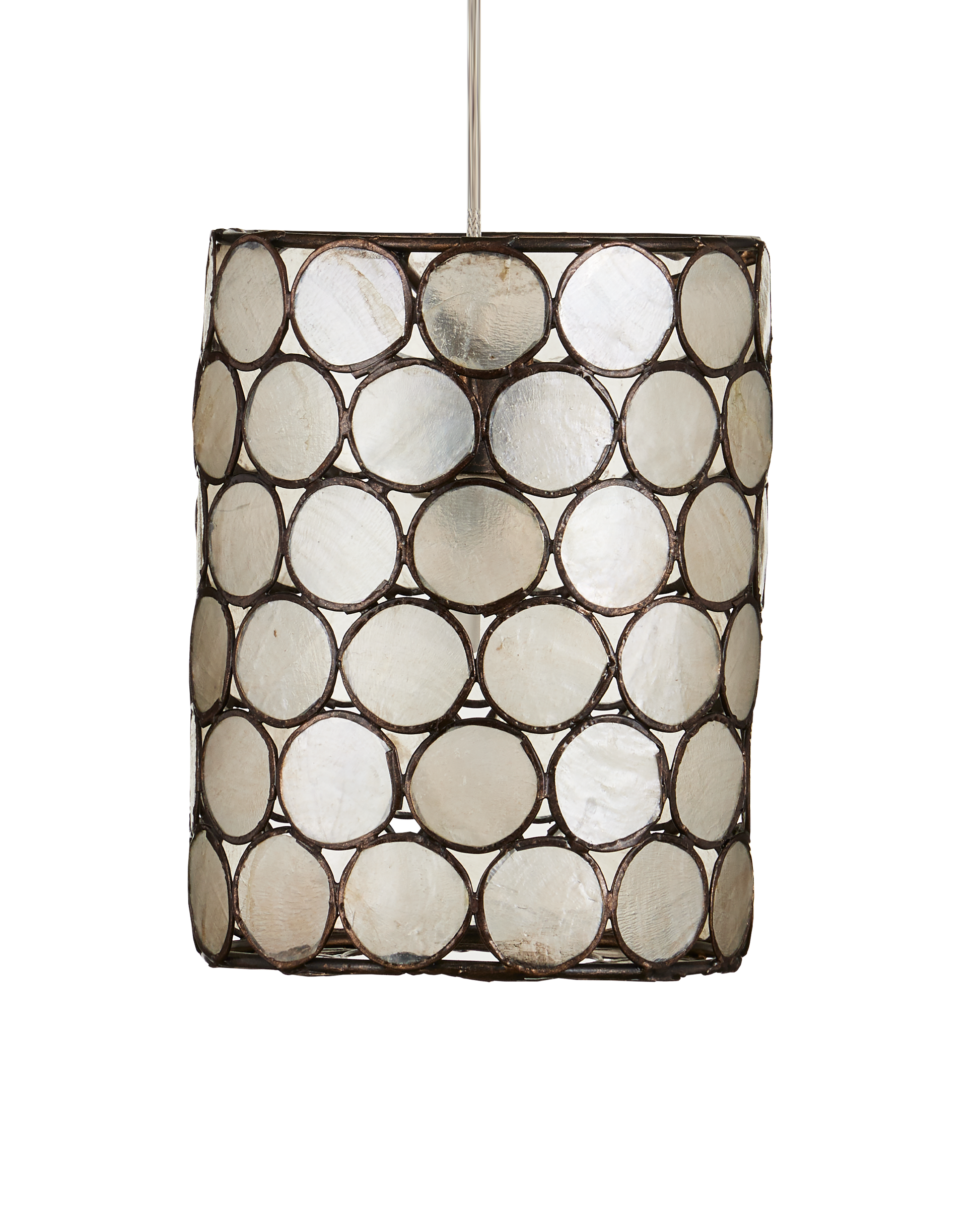 Natural Capiz shell and wrought iron in a Cupertino finish create a luminous circular pattern on the shades of the Regatta Rectangular 7-Light Multi-Drop Pendant. Each cylindrical element has such a pleasing glow when light shines through the lustrous natural material. There is great artistry in achieving such a complex pattern, as each slice of shell has to be surrounded in metal and soldered into a frame once the metal circles are joined to each other. The canopy of this piece is luminous in a painted silver finish. This fixture is among Currey & Company's multi-drop pendant collection, which includes multiple configurations.
