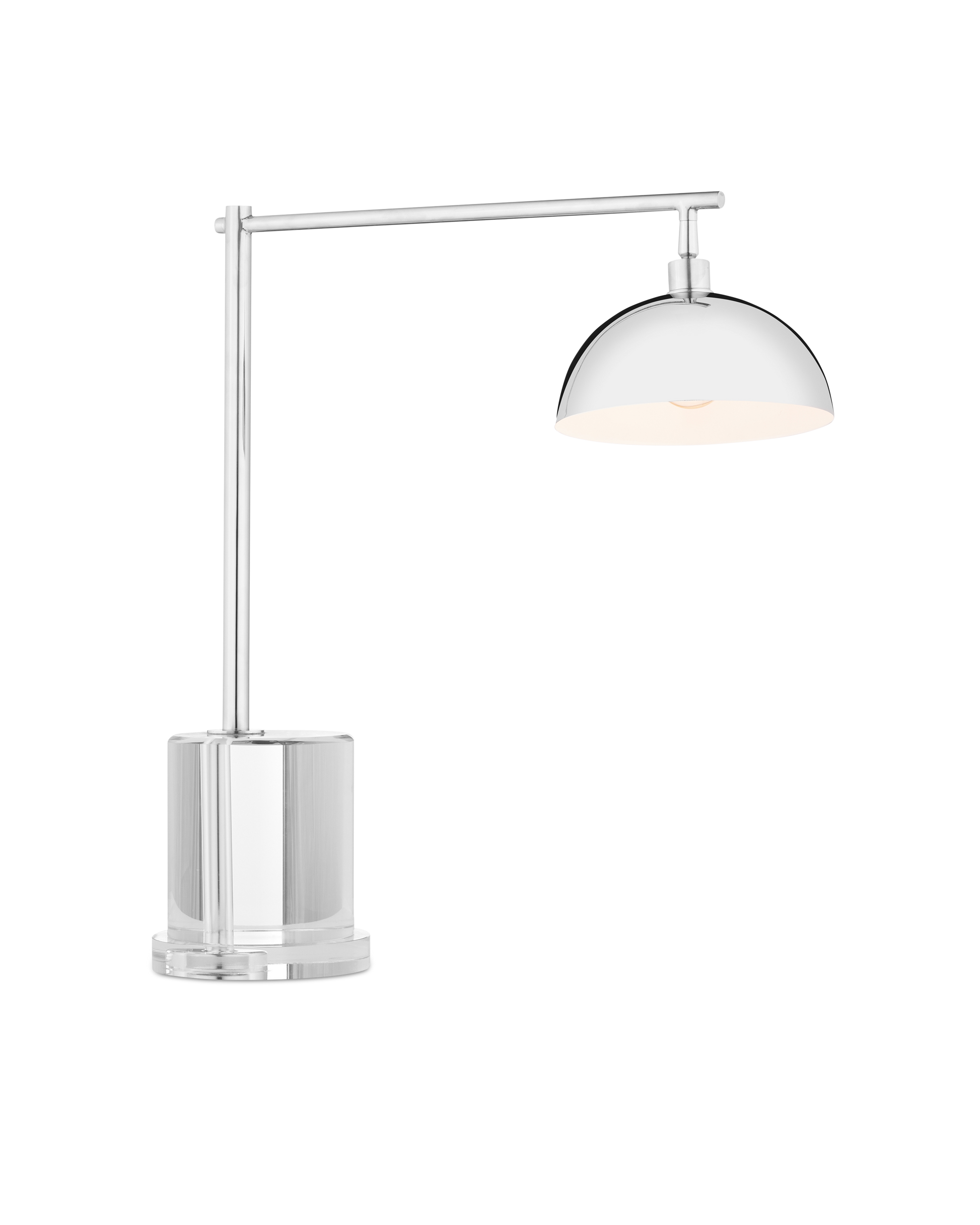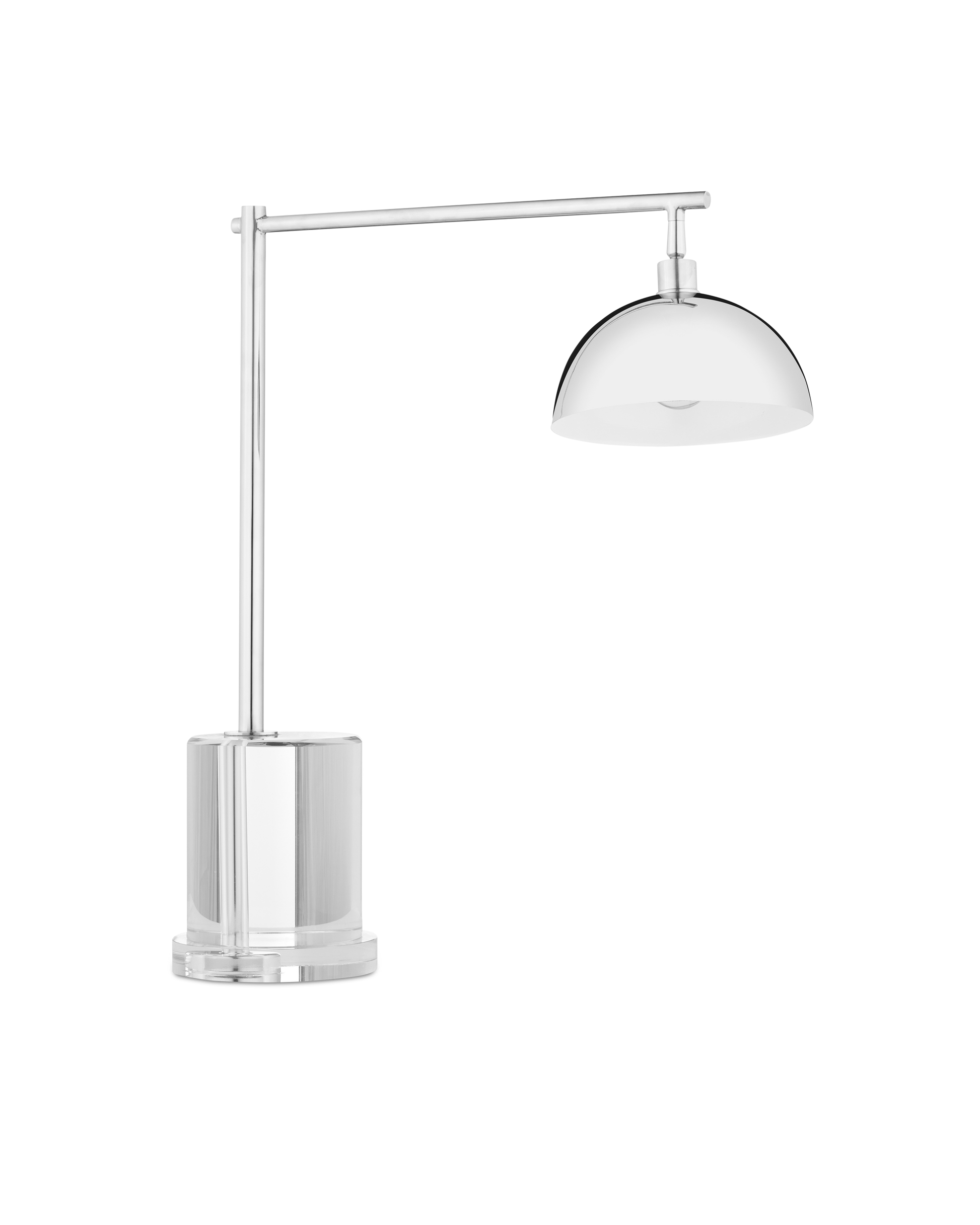 Incredible sheen is the material story with the Repartee Desk Lamp made of metal in a polished nickel finish. The clean-lined metal rods that hold the inverted bowl-shaped shade rise from a stacked optic crystal base to make the overall composition very modern. Clarence Mallari intended to create an adjustable desk lamp with pared-down lines when he designed the Repartee.