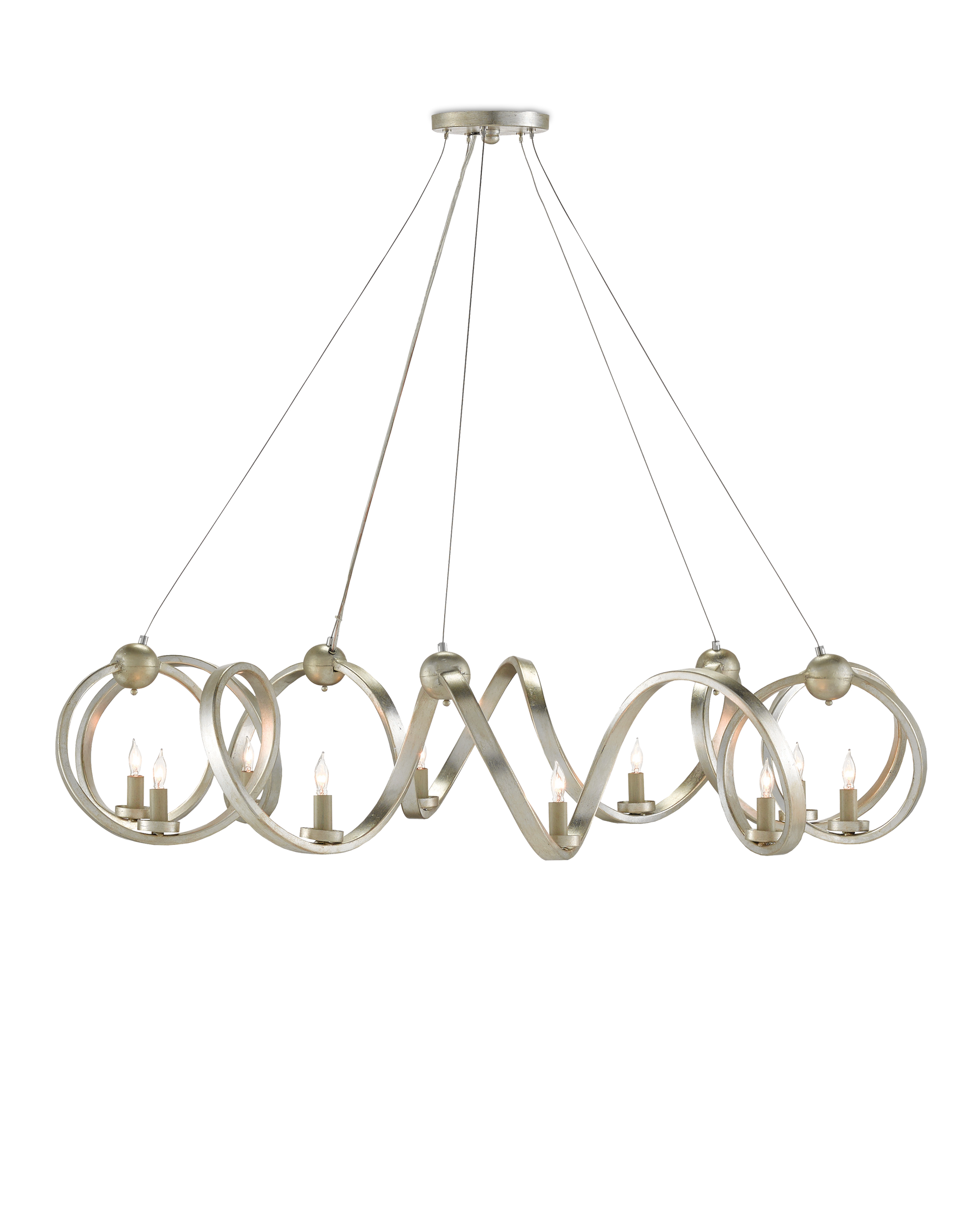 The Ringmaster Silver Chandelier is cold-forged and requires a team of strong men to achieve its stellar design. The contemporary silver leaf finish and ten lights provide the ultimate in illumination emanating from the undulant fixture. Adjustable from 30" to 132" with use of included chain/rod kit/cable. If your space calls for a longer drop, additional chain/rods/cable is available for purchase.