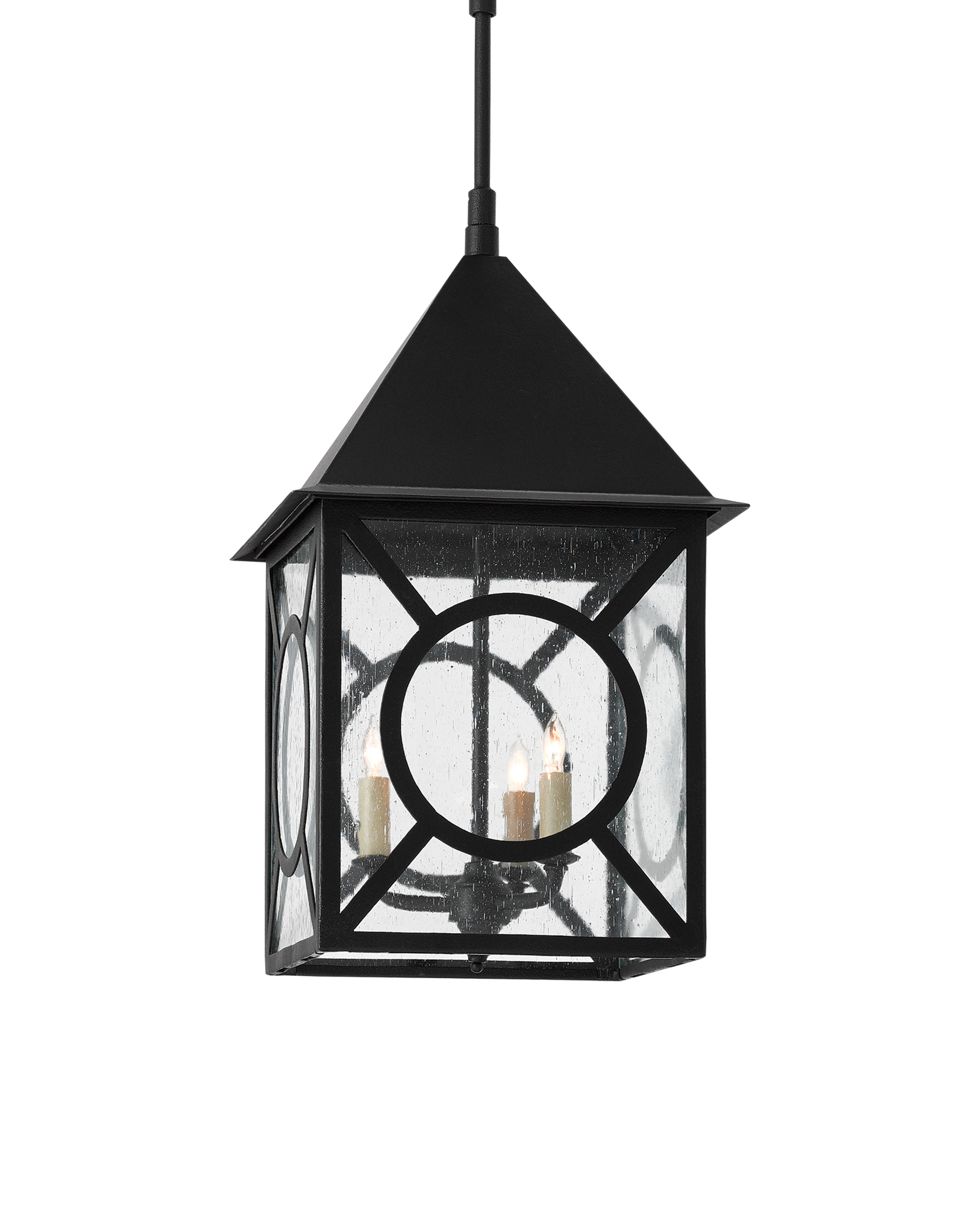 The Ripley Large Outdoor Lantern in our Twelfth Street collection of outdoor lighting features a high-performance, weather-resistant Trilux finish that is fade resistant, crack resistant and rust resistant. We guarantee the finishes applied to our Twelfth Street pieces for five years. The metal on this black sconce in a midnight finish surrounds seeded-glass panes.